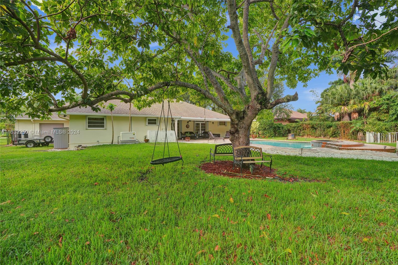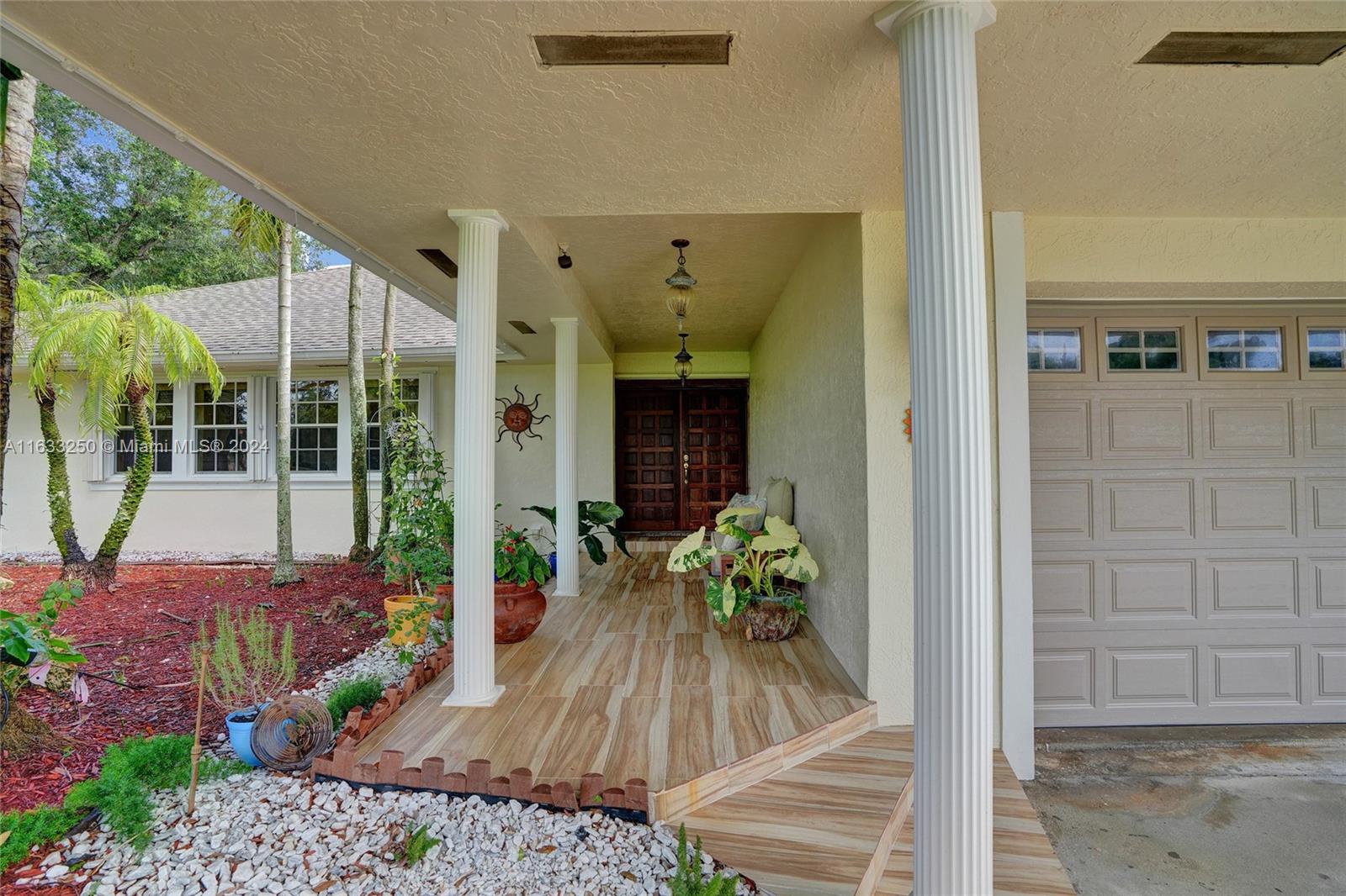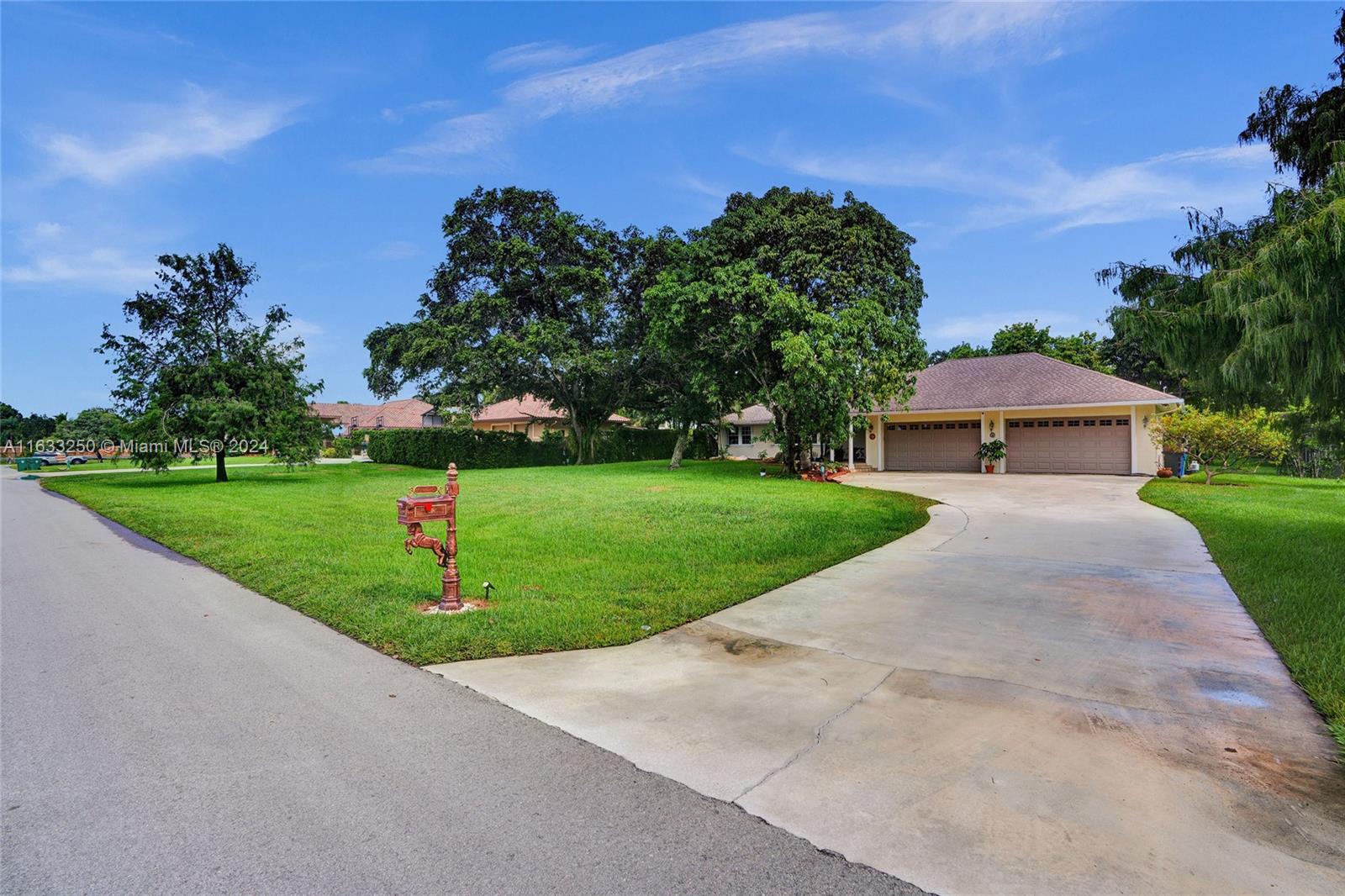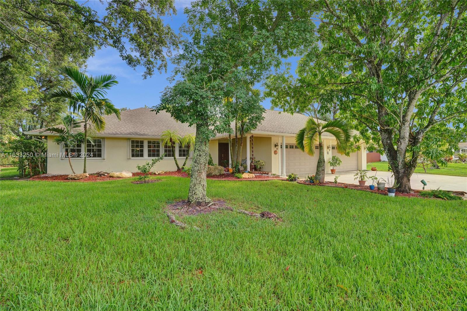 Paradise in Southwest Ranches! Magnificent 3bed/3bath+office pool home, 4 CAR GARAGE on a private road now available! This tropical oasis sits on an acre of land with fruit trees, a Koi pond, and lush landscaping. This stylish home offers an open-concept kitchen complete with top-of-the-line S/S appliances. Floors are of Porcelain throughout, classic design, with a split floor plan. Sprawling entertaining space flows outside the sunroom to reveal a stunning pool and tranquil living. Hurricane accordion shutters throughout the house. Some recent updates are: new garage doors, a water heater, water filtration system, a home generator, recent exterior painting completed, and plumbing for the pool See it now before it's gone! HORSES WELCOME! THIS IS A DRY LOT.