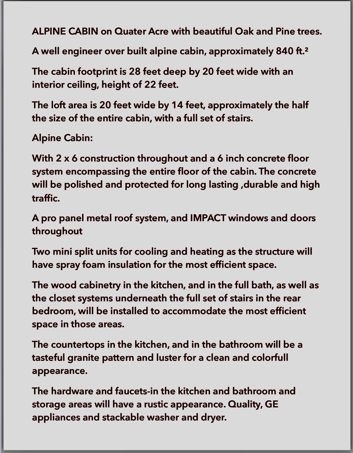 Escape to your own ''mini homestead'' slice of paradise in Central Florida! This Alpine Style 840 Sq Cabin features 1 bedroom, 1 full bath, kitchen and lots of closets and storage space. Built on a slab foundation, high finish, polished concrete floor throughout the entire cabin that will allow for meticulous cleaning and long lasting durability. Huge 20' X 14' Loft with Full stairs. Impact Windows and Doors. Metal Pro Panel Roof 25 Year Warranty!Open Living area with 22 Ft high ceilings that feels great as you enter the Cabin. Smart home wiring throughout the cabin for high-speed Internet, and efficiency lighting and thermostat for a dual mini split system cooling and heating. Included are kitchen & bath, sinks, kitchen & bath tile and countertop trim package, that can be upgraded.