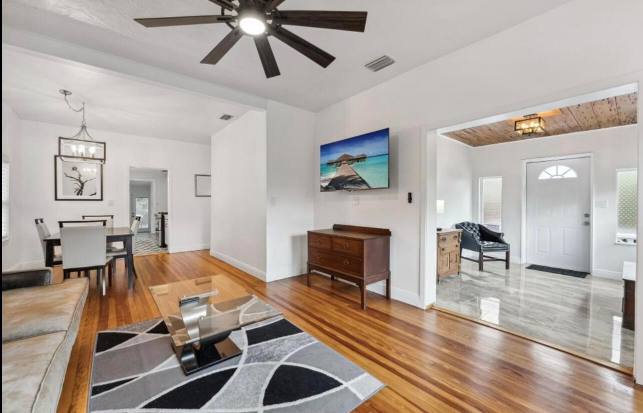 Introducing 349 Plymouth Rd, located on a multi-million dollar street nestled in the sought-after SoSo neighborhood. This comfy home boasts 2 bedrooms plus a den and 2 baths, offering both space and functionality. Down the street from the intracoastal, it provides a picturesque coastal lifestyle.The upgraded kitchen features sleek stainless steel appliances and elegant quartz countertops, perfect for culinary enthusiasts. Original wooden flooring adds charm and character, refurbished to perfection. For added peace of mind, impact glass and shutters offer hurricane protection.Entertain in style with a screened-in patio, outdoor kitchen, and spacious backyard, creating an ideal setting for gatherings. Conveniently located near shopping, dining, and attractions.