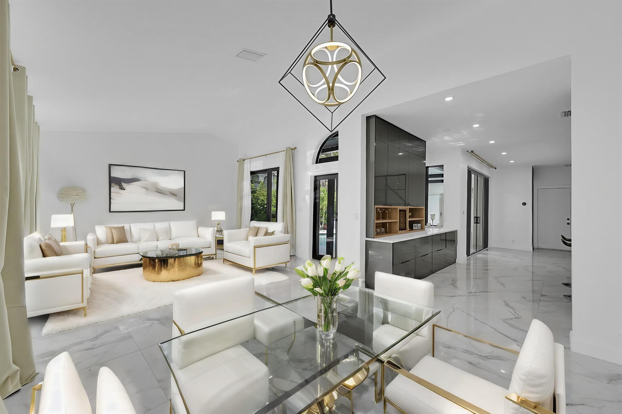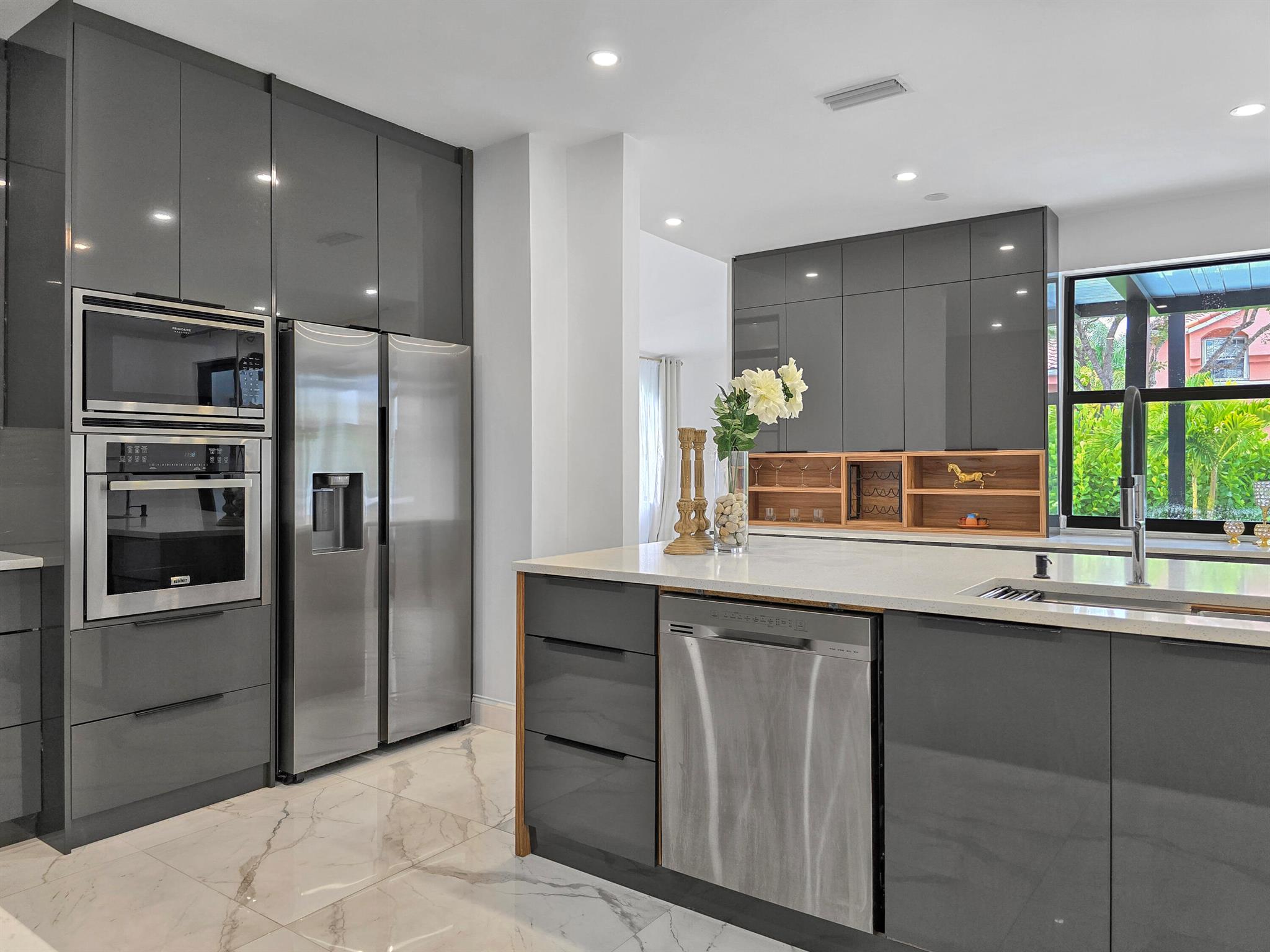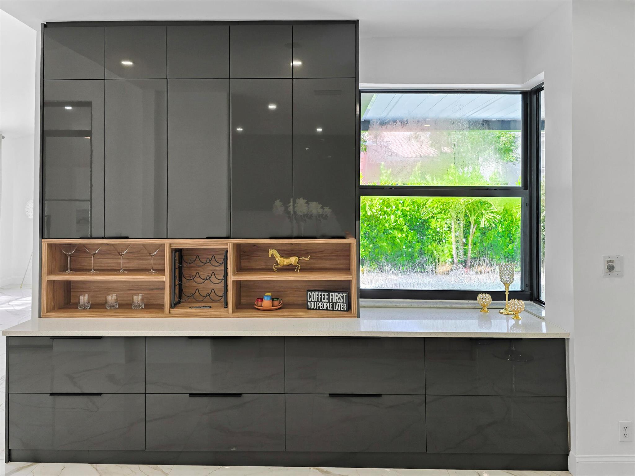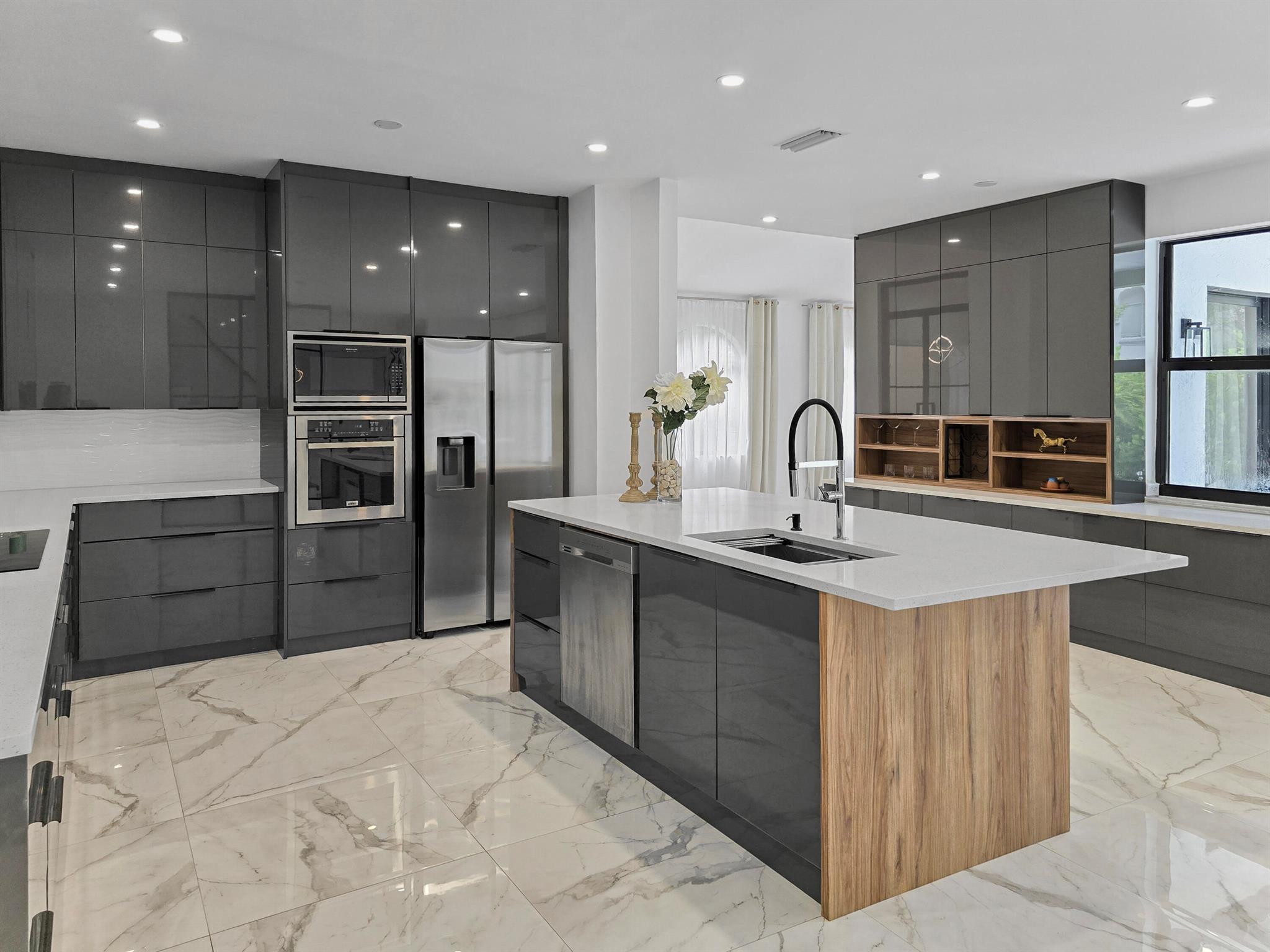 This meticulously remodeled home in the tree-lined neighborhood of Kensington is located near both Parkland and Coral Springs. It falls within the Country Hills Elementary and Marjory Stoneman Douglas High School districts. The bespoke kitchen stands out with its floor-to-ceiling imported Egger and Krono Swiss grey gloss cabinets lined with Austrian oak, showcasing the latest in European design. It also features a custom coffee/wine bar and a storage island accommodating six stools. The kitchen is equipped with a new stainless vertical fridge, an in-wall oven/microwave, an embedded glass top range, and a touchless exhaust hood, making it a perfect space for gourmet entertaining with glowing pool views.The living room impresses with its 22-foot vaulted ceilings, panoramic pool views,