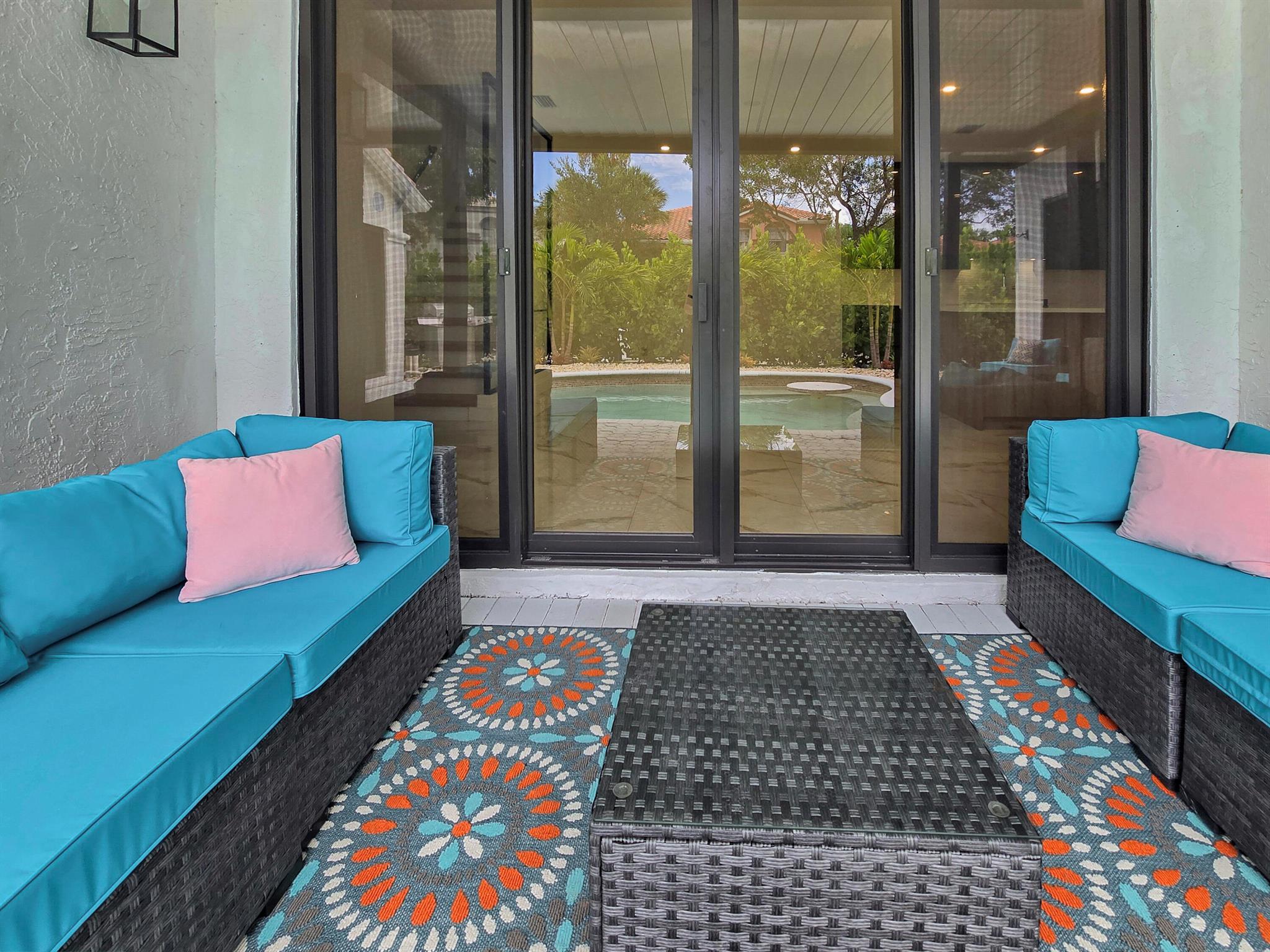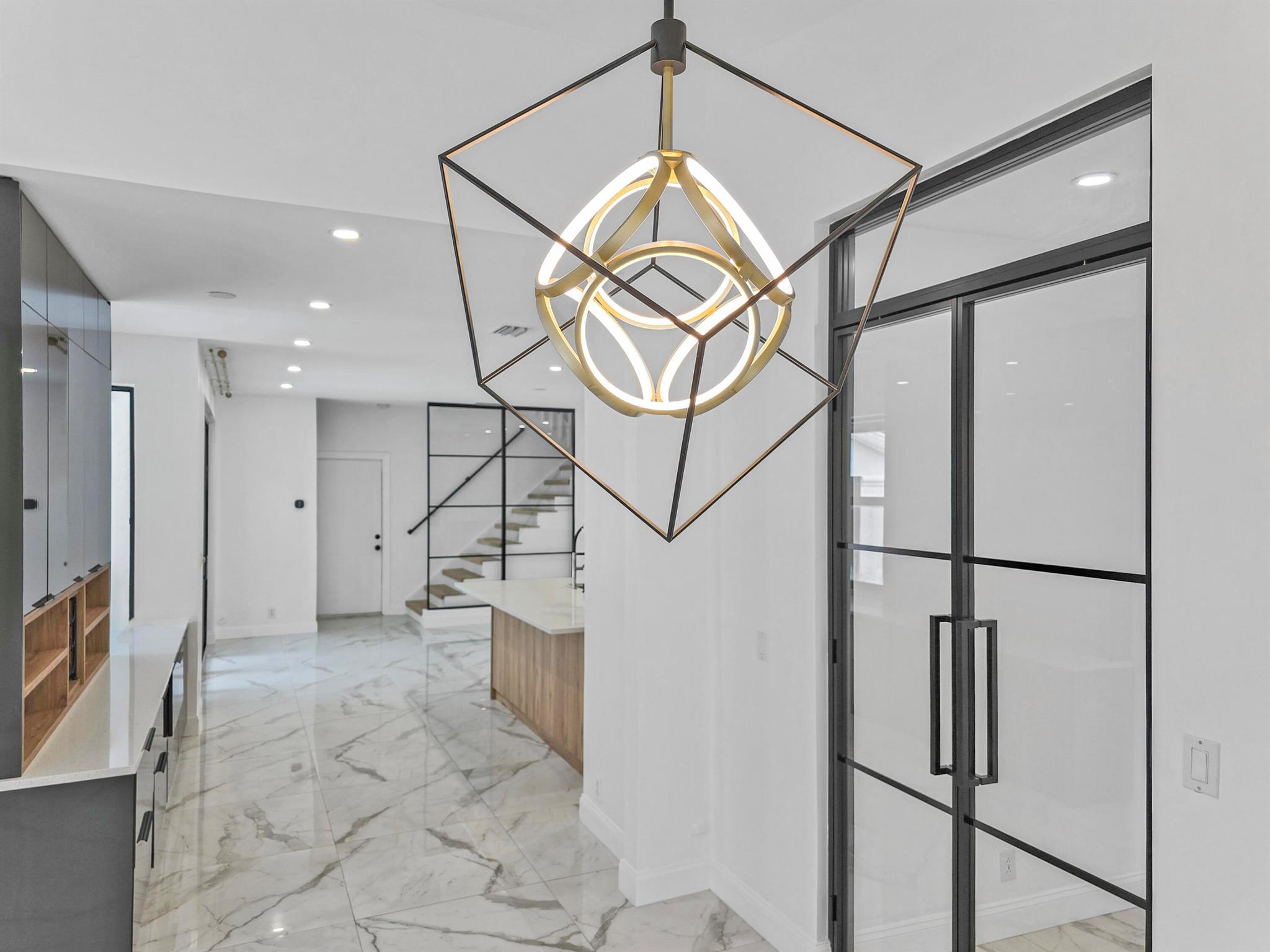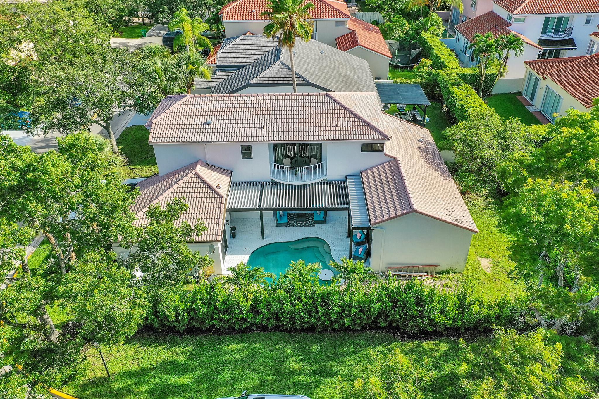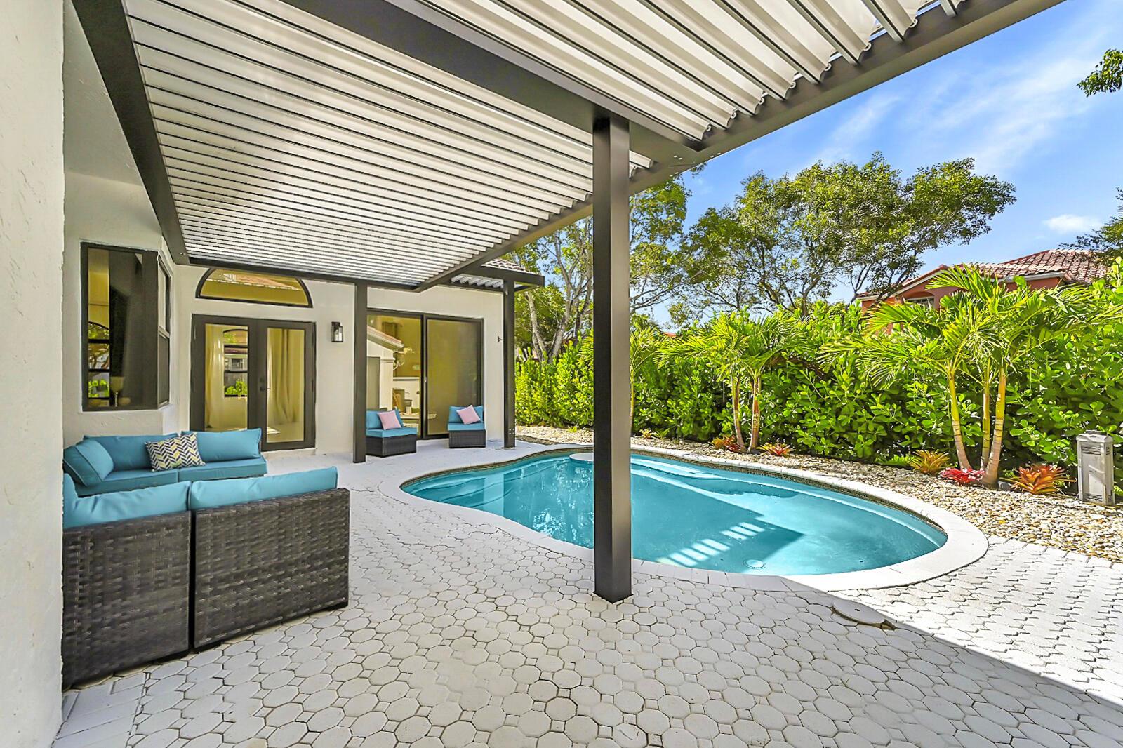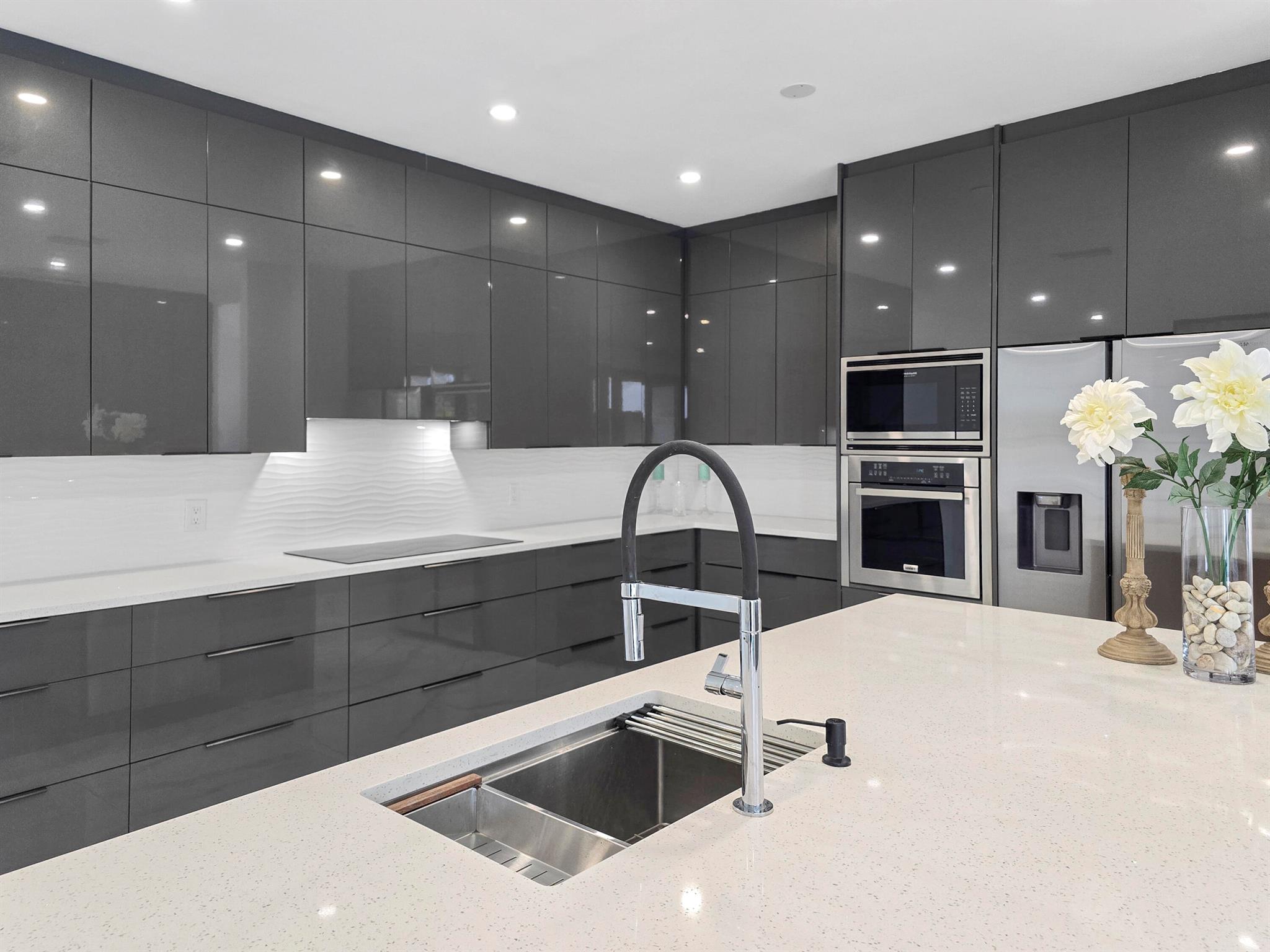 This meticulously remodeled home in the tree-lined neighborhood of Kensington is located near both Parkland and Coral Springs. It falls within the Country Hills Elementary and Marjory Stoneman Douglas High School districts. The bespoke kitchen stands out with its floor-to-ceiling imported Egger and Krono Swiss grey gloss cabinets lined with Austrian oak, showcasing the latest in European design. It also features a custom coffee/wine bar and a storage island accommodating six stools. The kitchen is equipped with a new stainless vertical fridge, an in-wall oven/microwave, an embedded glass top range, and a touchless exhaust hood, making it a perfect space for gourmet entertaining with glowing pool views.The living room impresses with its 22-foot vaulted ceilings, panoramic pool views,