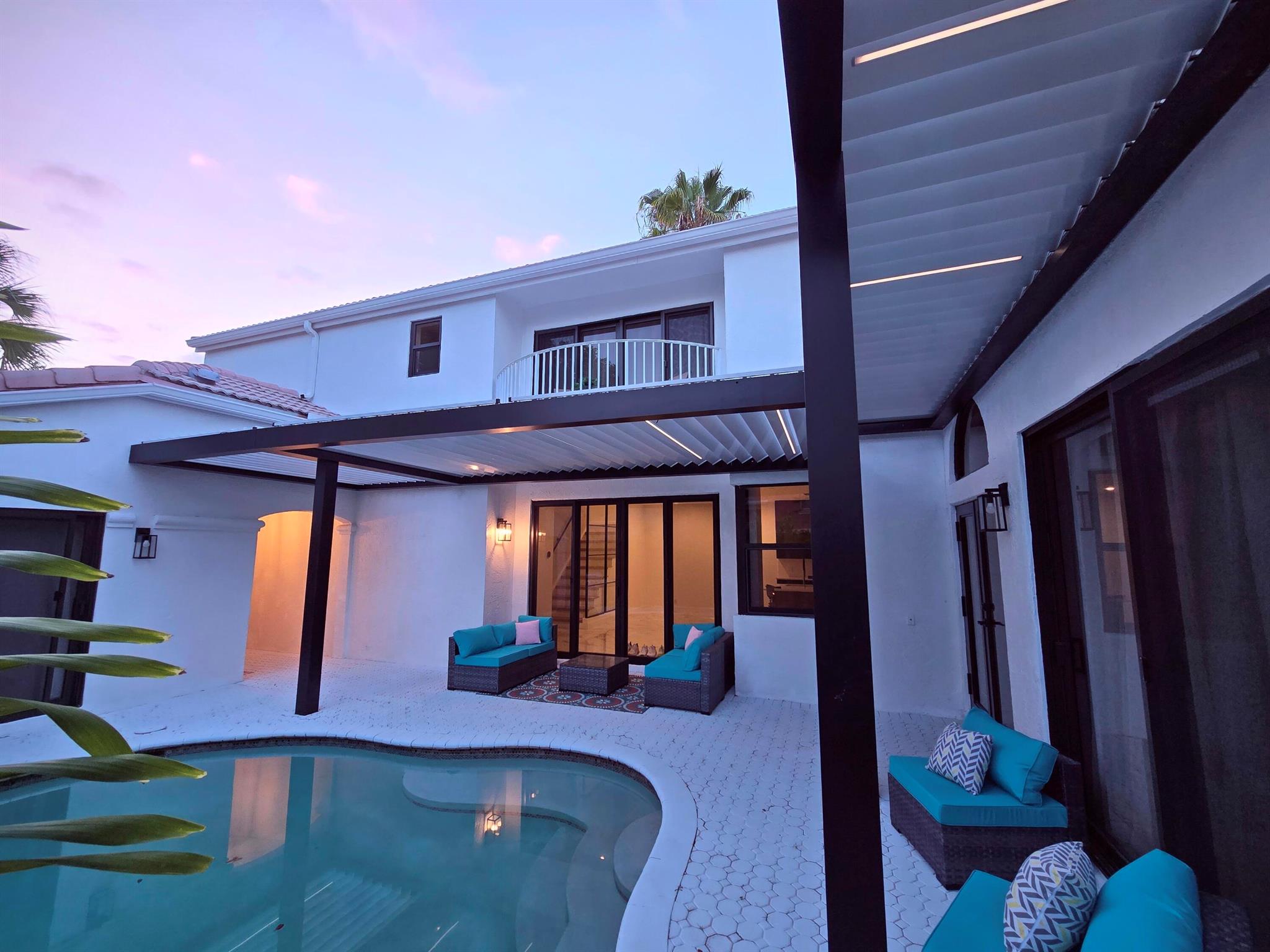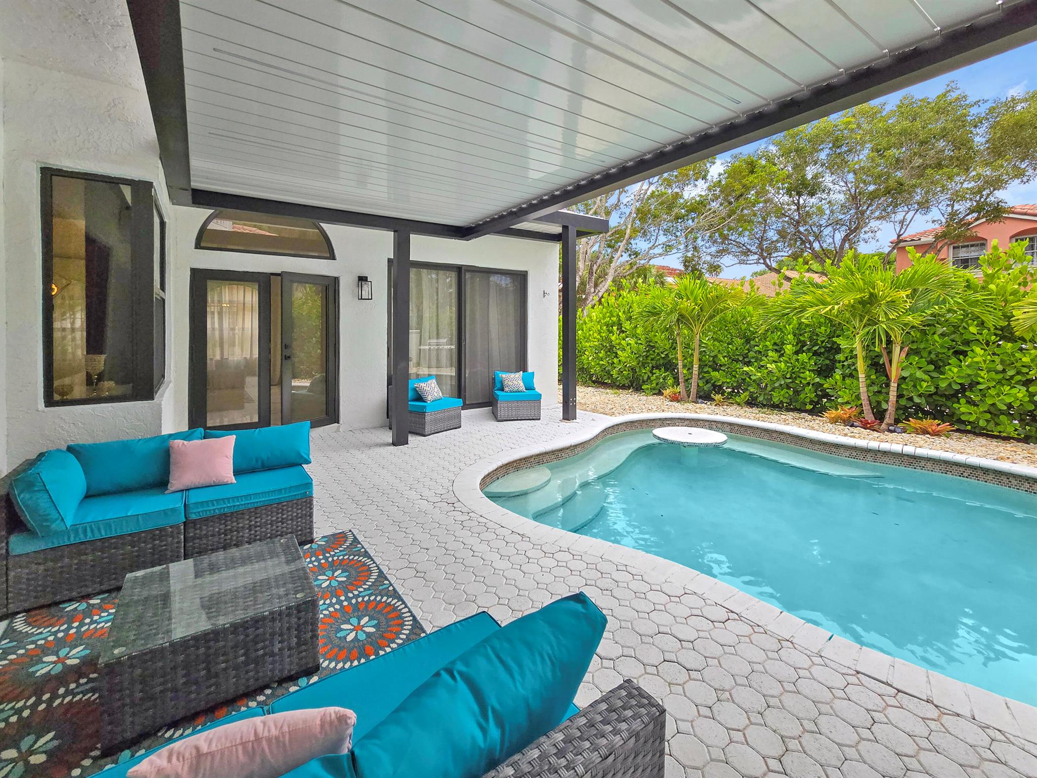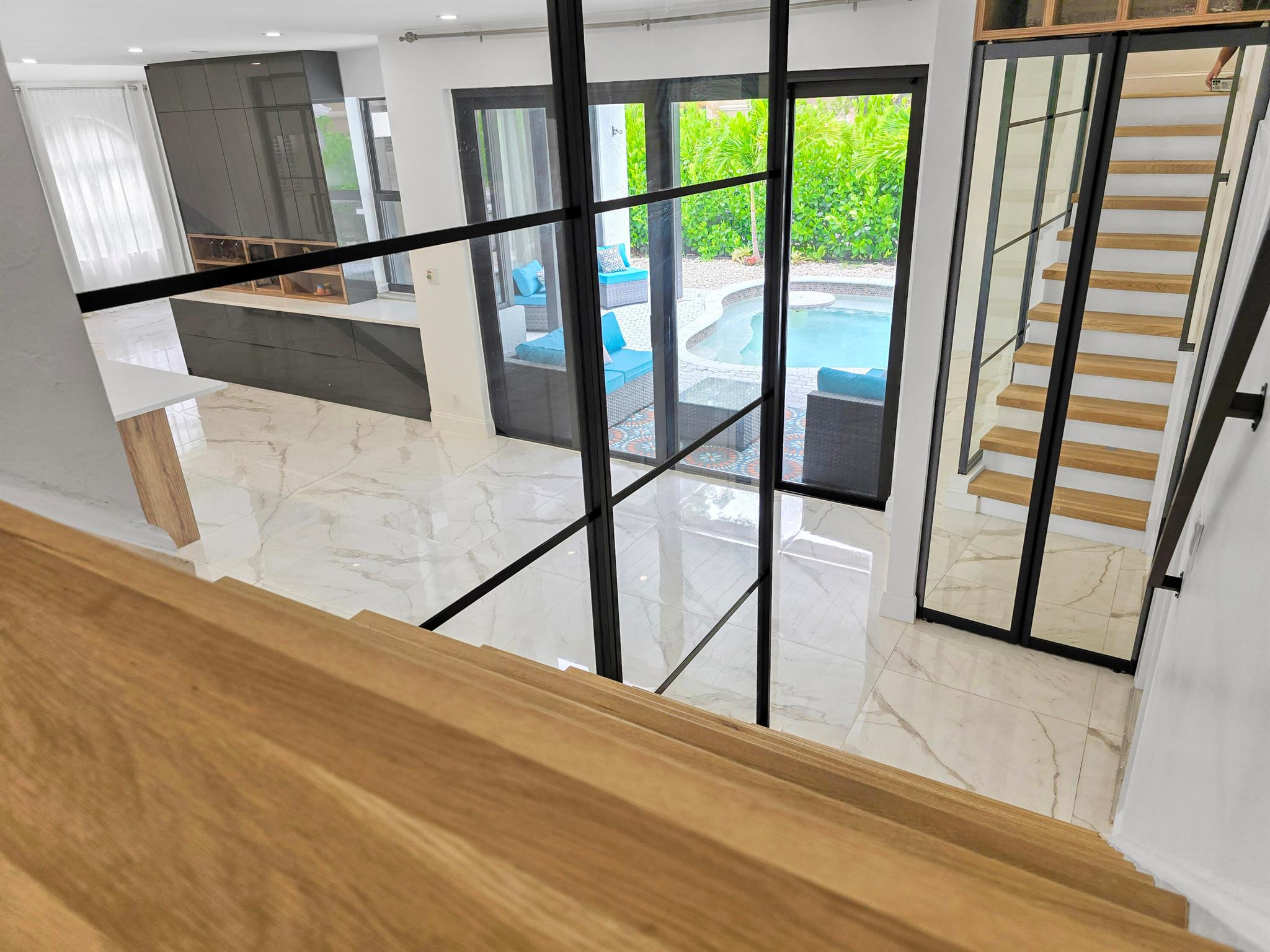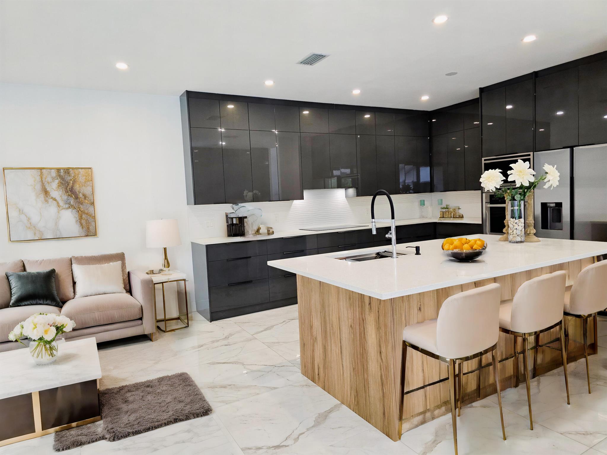 This meticulously remodeled home in the tree-lined neighborhood of Kensington is located near both Parkland and Coral Springs. It falls within the Country Hills Elementary and Marjory Stoneman Douglas High School districts. The bespoke kitchen stands out with its floor-to-ceiling imported Egger and Krono Swiss grey gloss cabinets lined with Austrian oak, showcasing the latest in European design. It also features a custom coffee/wine bar and a storage island accommodating six stools. The kitchen is equipped with a new stainless vertical fridge, an in-wall oven/microwave, an embedded glass top range, and a touchless exhaust hood, making it a perfect space for gourmet entertaining with glowing pool views.The living room impresses with its 22-foot vaulted ceilings, panoramic pool views,