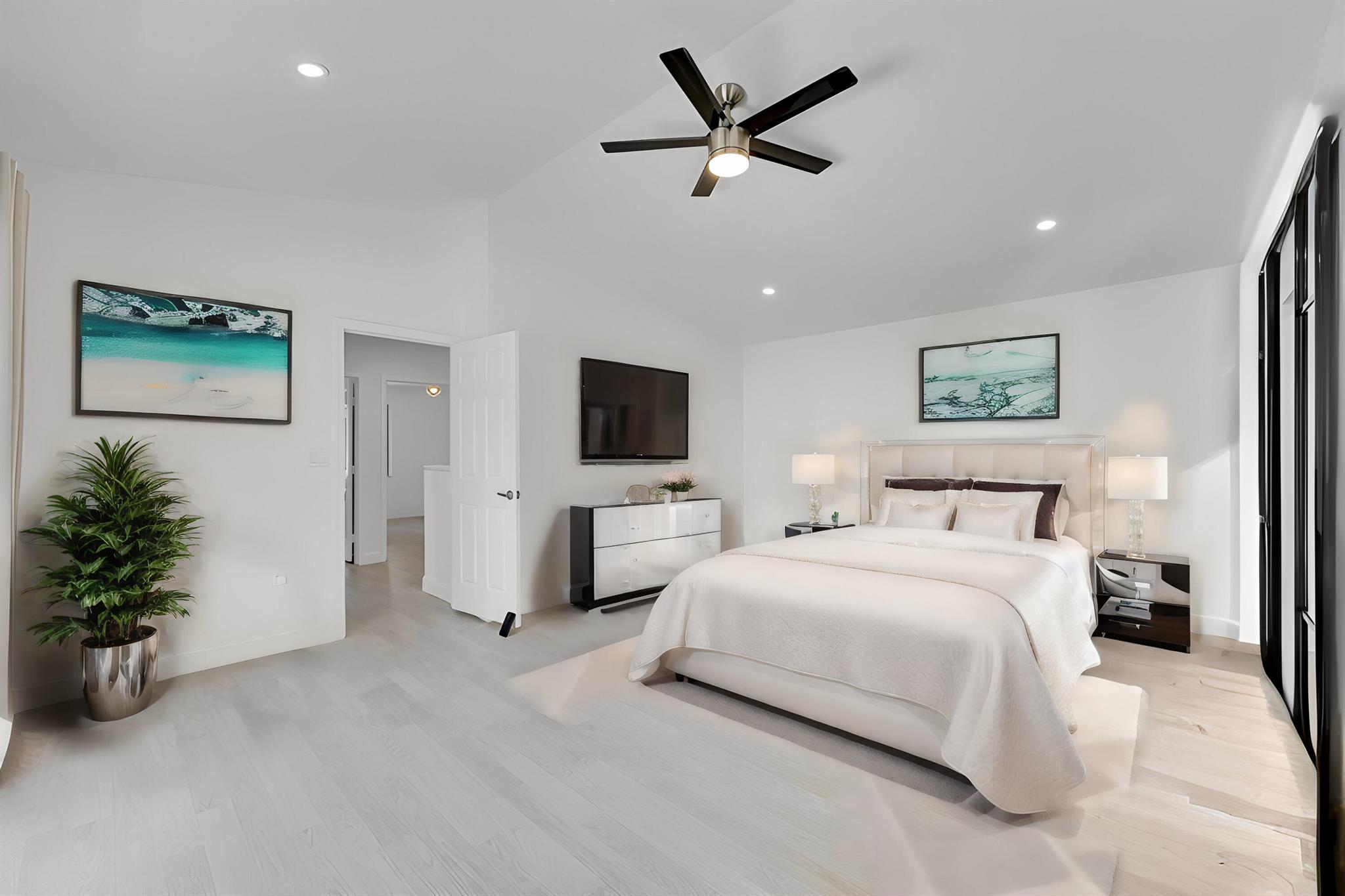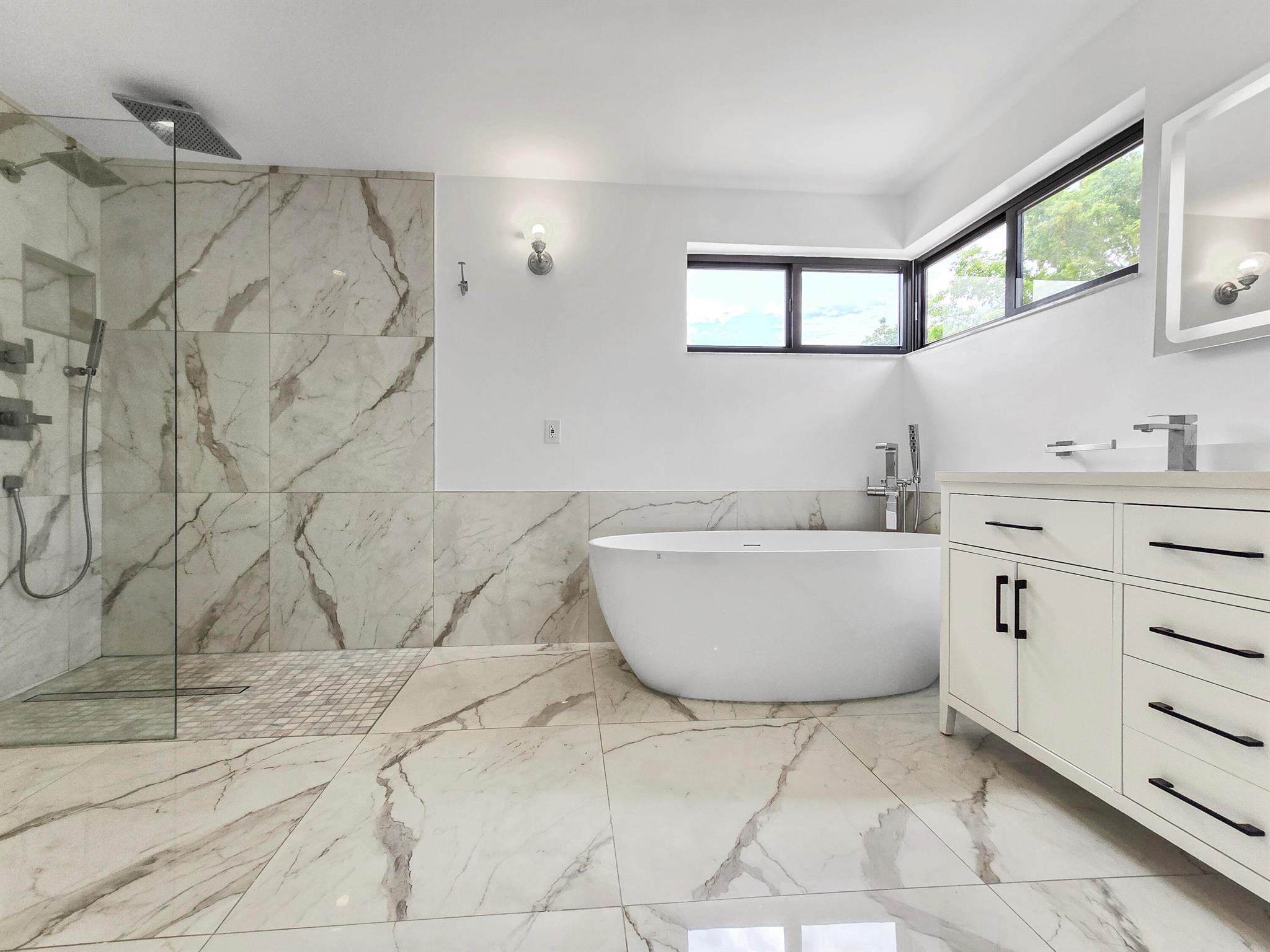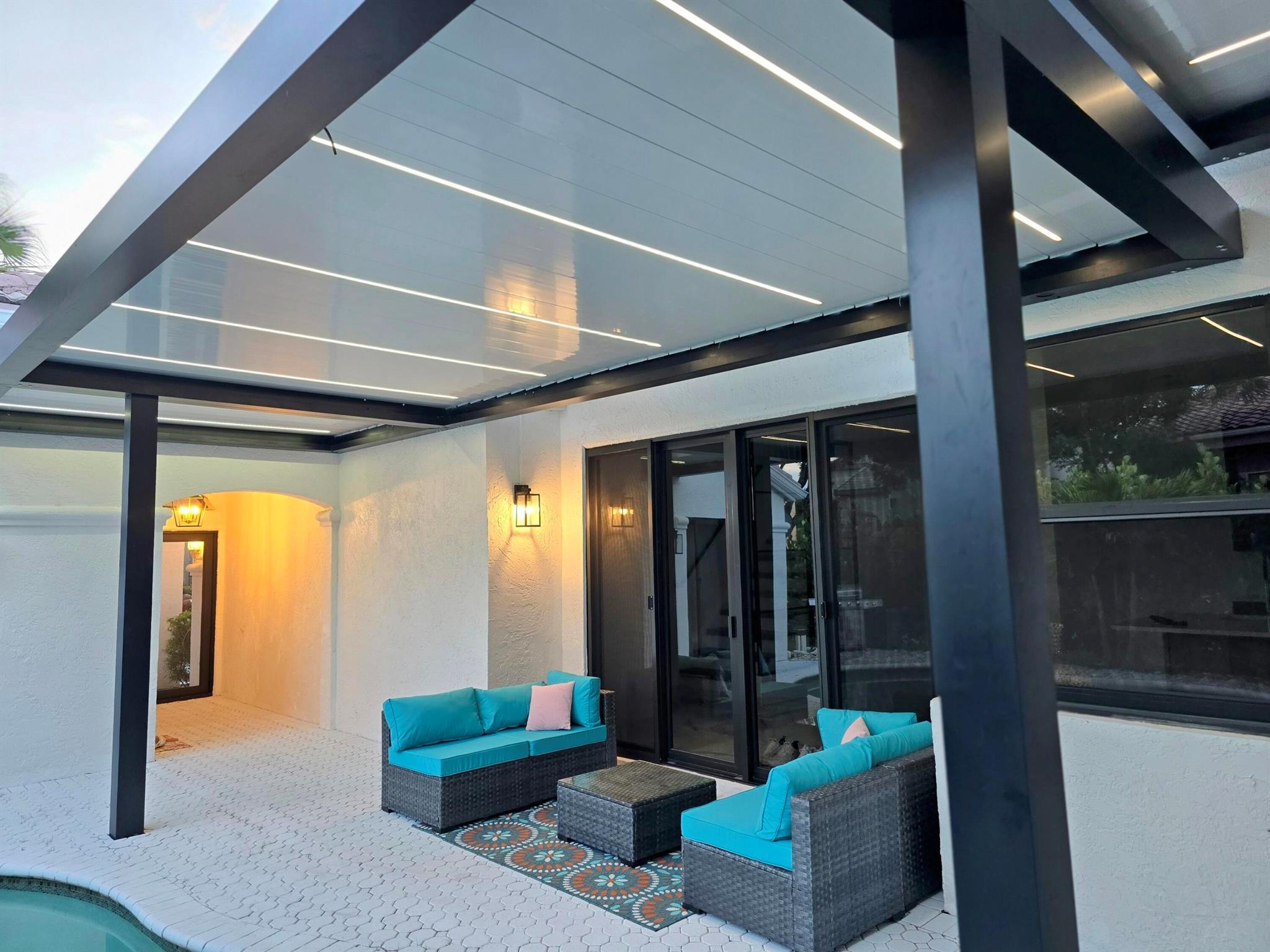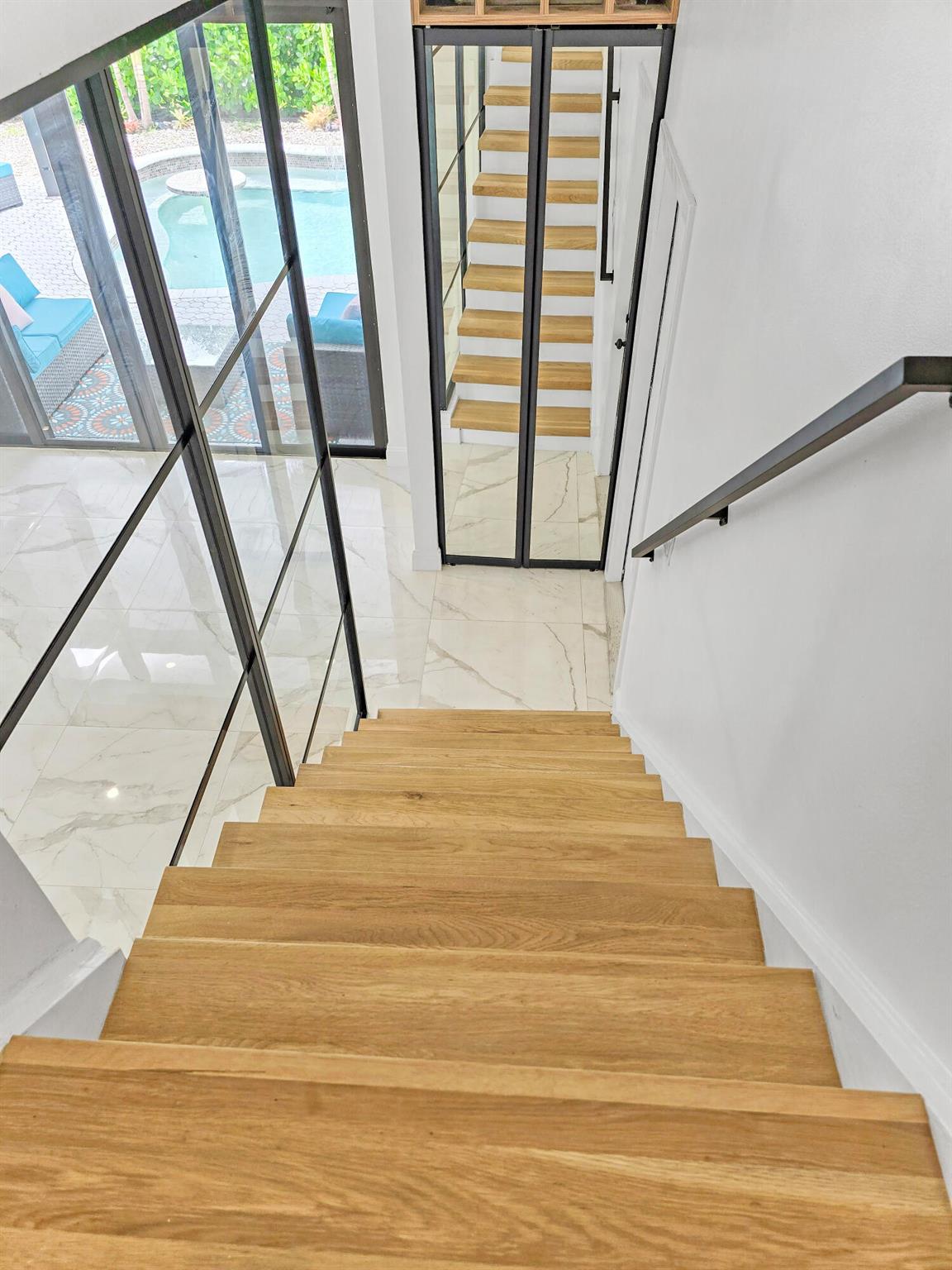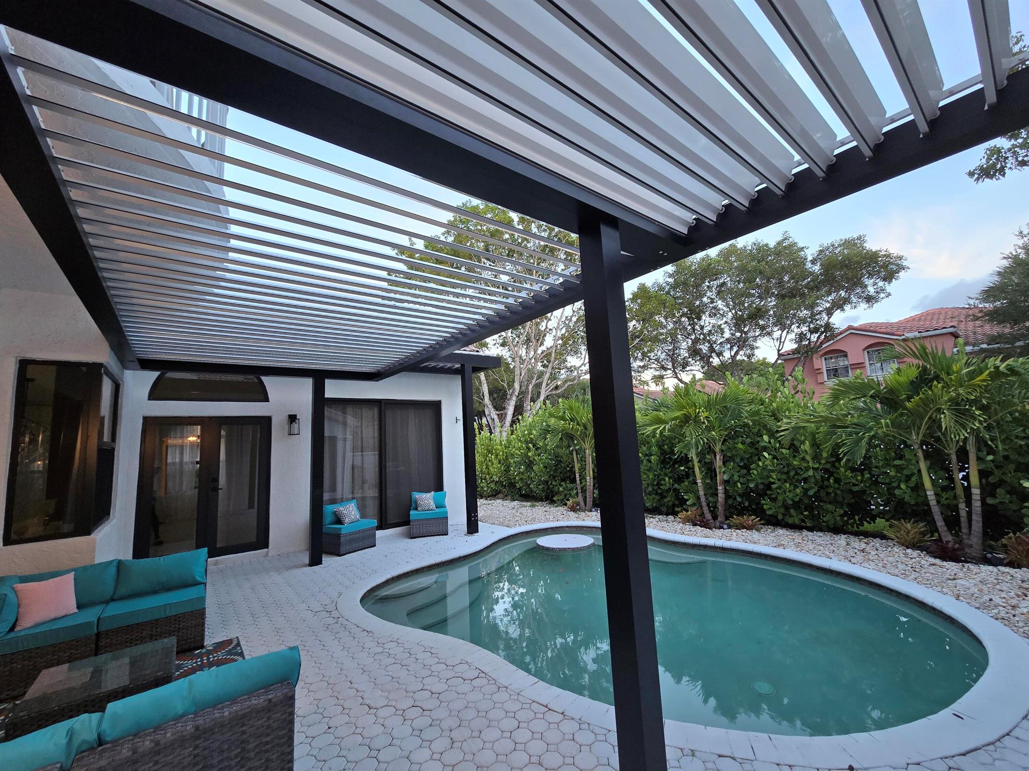 This meticulously remodeled home in the tree-lined neighborhood of Kensington is located near both Parkland and Coral Springs. It falls within the Country Hills Elementary and Marjory Stoneman Douglas High School districts. The bespoke kitchen stands out with its floor-to-ceiling imported Egger and Krono Swiss grey gloss cabinets lined with Austrian oak, showcasing the latest in European design. It also features a custom coffee/wine bar and a storage island accommodating six stools. The kitchen is equipped with a new stainless vertical fridge, an in-wall oven/microwave, an embedded glass top range, and a touchless exhaust hood, making it a perfect space for gourmet entertaining with glowing pool views.The living room impresses with its 22-foot vaulted ceilings, panoramic pool views,