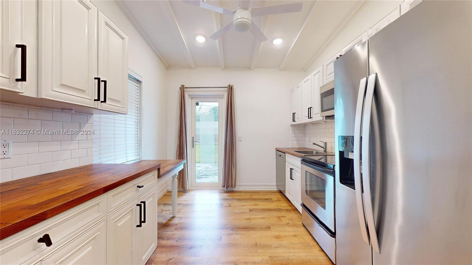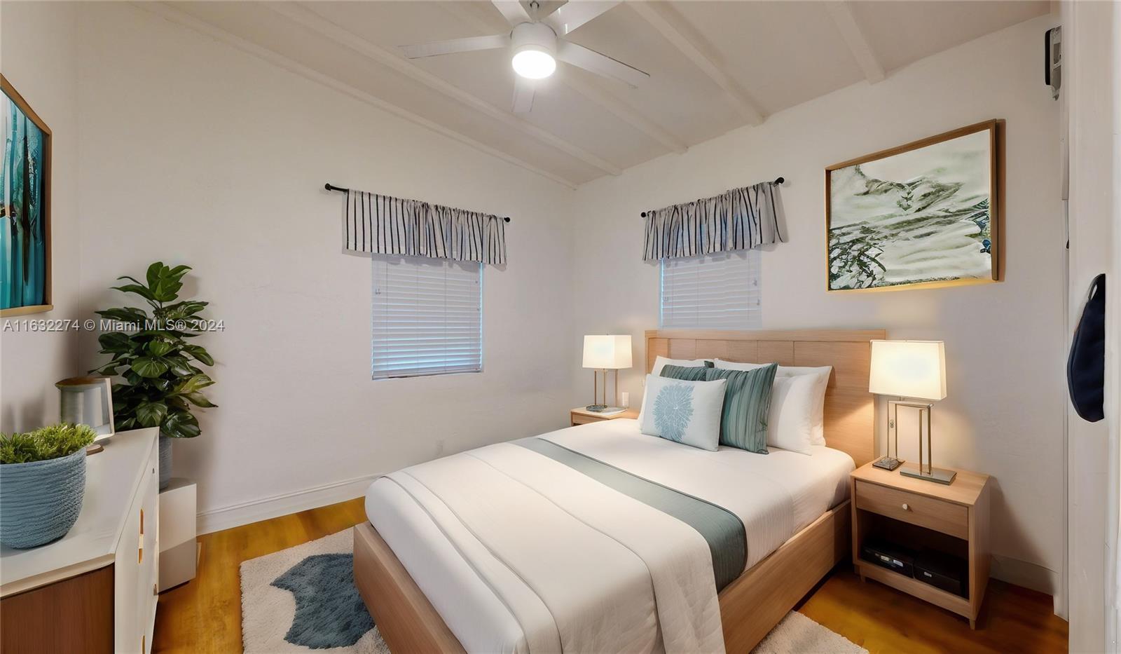 Immaculate South Miami gem on oversized lot (approx. 1/4 acre) with lush mature live oaks. This meticulously maintained 1950s home blends vintage charm with modern updates. Featuring vaulted ceilings, an efficient layout, and stylish wood-look vinyl flooring throughout. 2020 roof replacement includes newly insulated beamed ceilings with elegant recessed LED lighting. The modern kitchen boasts custom cabinetry, stainless steel appliances, and sleek fixtures. New PVC plumbing ensures reliability. Hurricane-resistant impact windows and doors for peace of mind. Desirable location: quiet blocks from the University of Miami, minutes to Metrorail, South Miami Hospital, Larkin Hospital, Dadeland Mall, and vibrant downtown South Miami's shops and eateries.