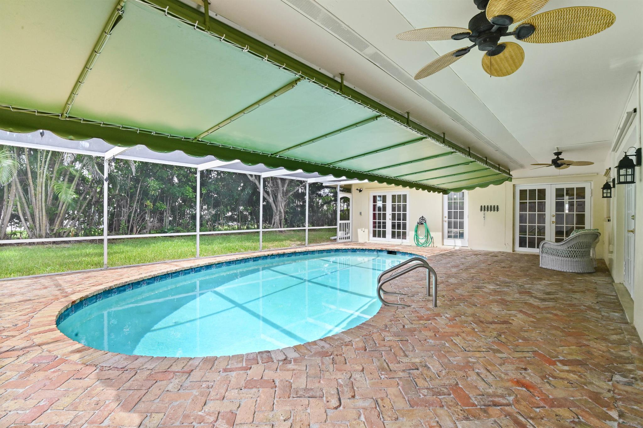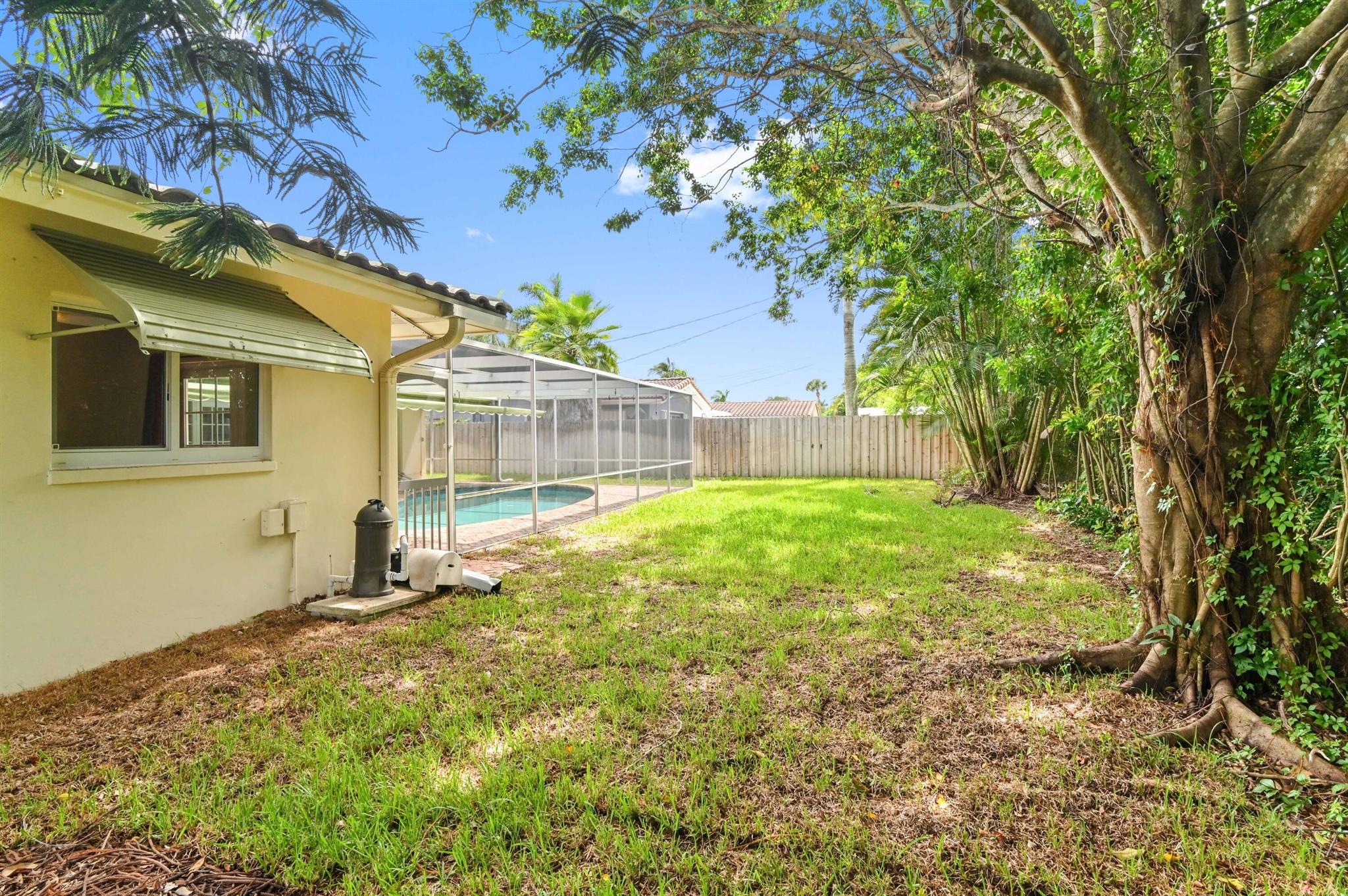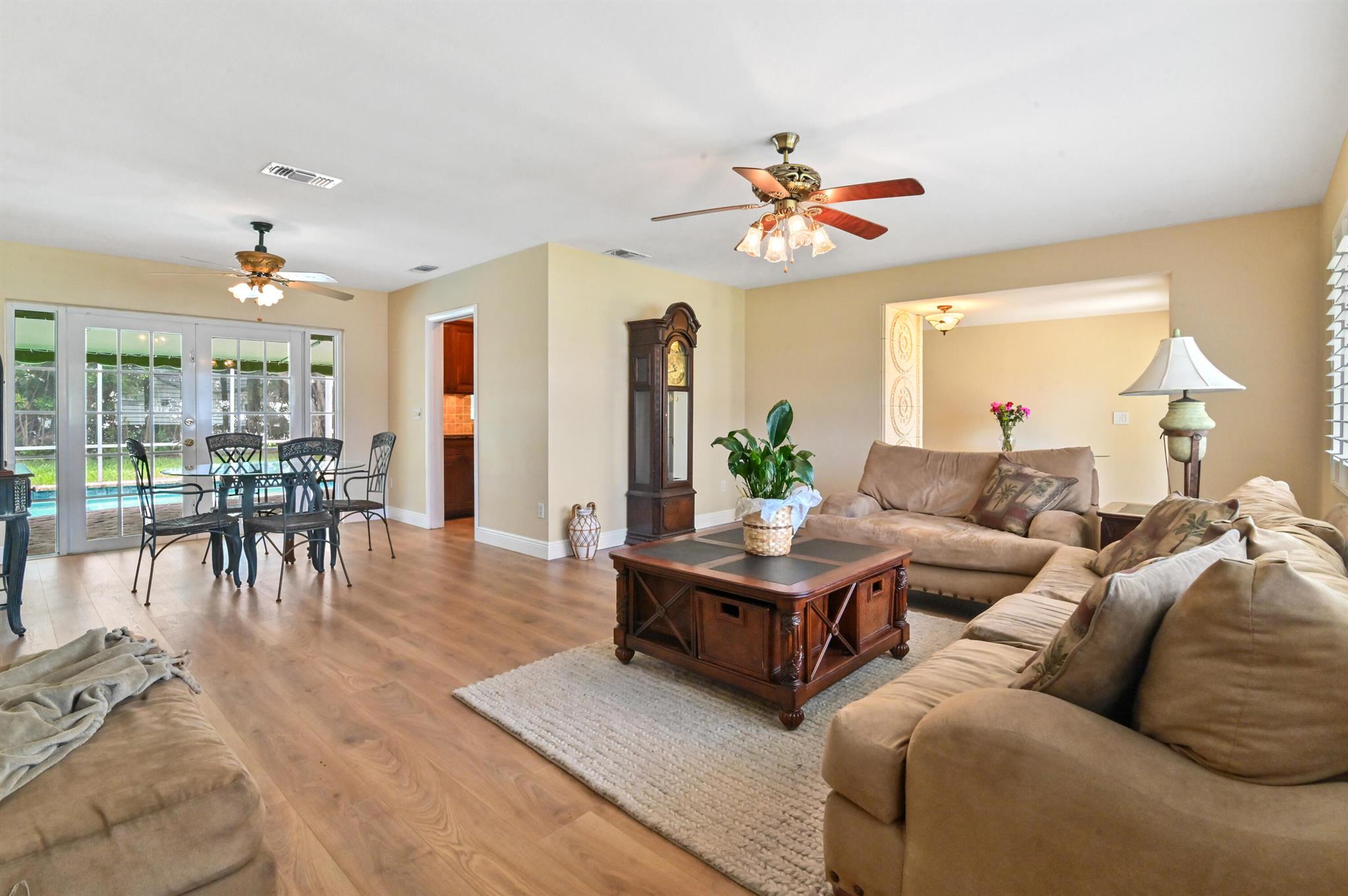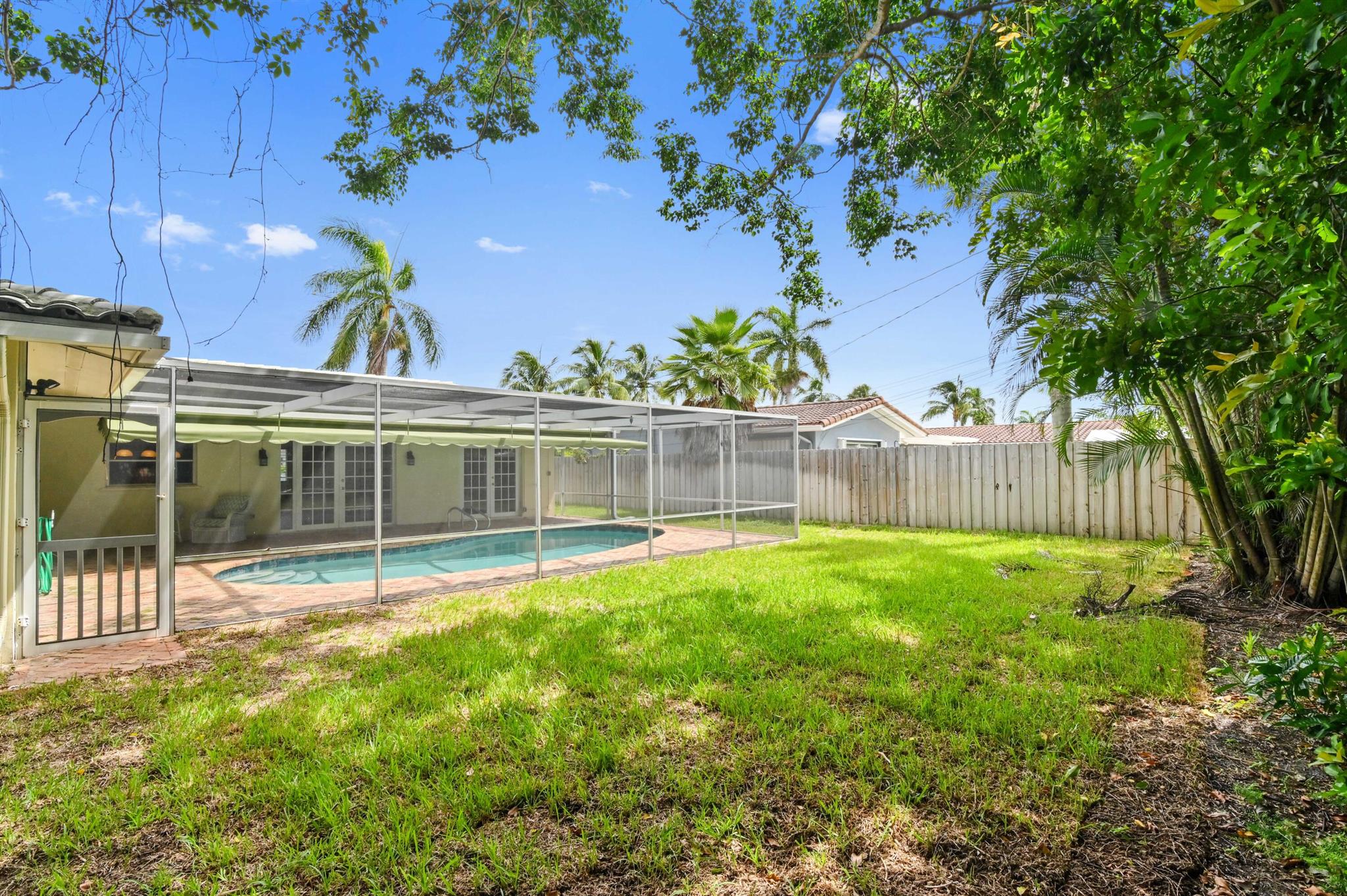 Welcome to your dream home in the highly sought-after, non-HOA community of Boca Raton Square! This immaculate single-story pool home boasts 4 spacious bedrooms and 3 pristine bathrooms, perfectly designed for comfortable family living. The charming front porch invites you into a bright and airy open living and dining area, with elegant French doors leading directly to a stunning patio and pool. The galley-style kitchen is a chef's delight, featuring gorgeous granite countertops, custom cabinets with pull out shelving, a stylish tiled backsplash, and seamless connectivity to the cozy family room.