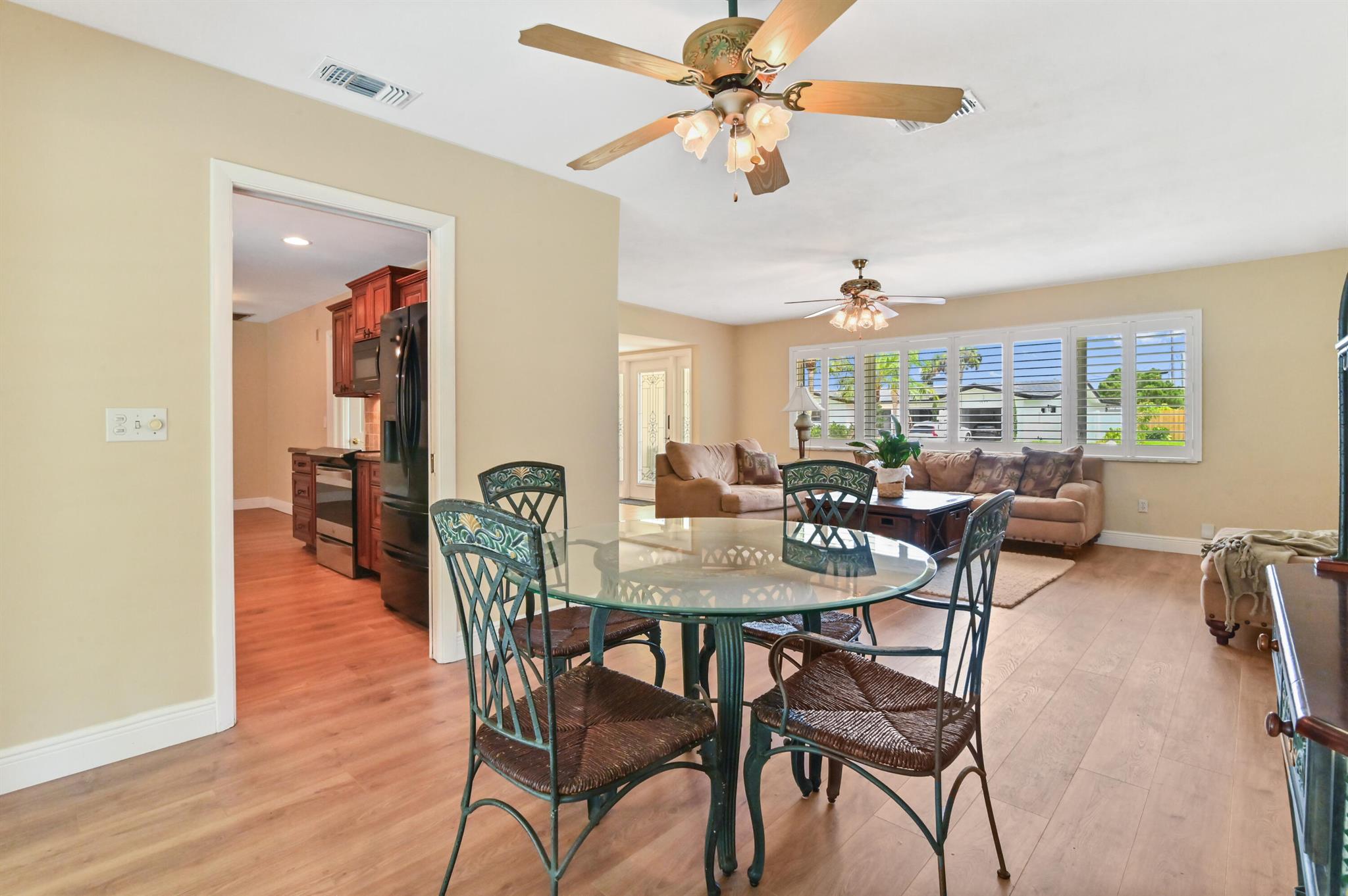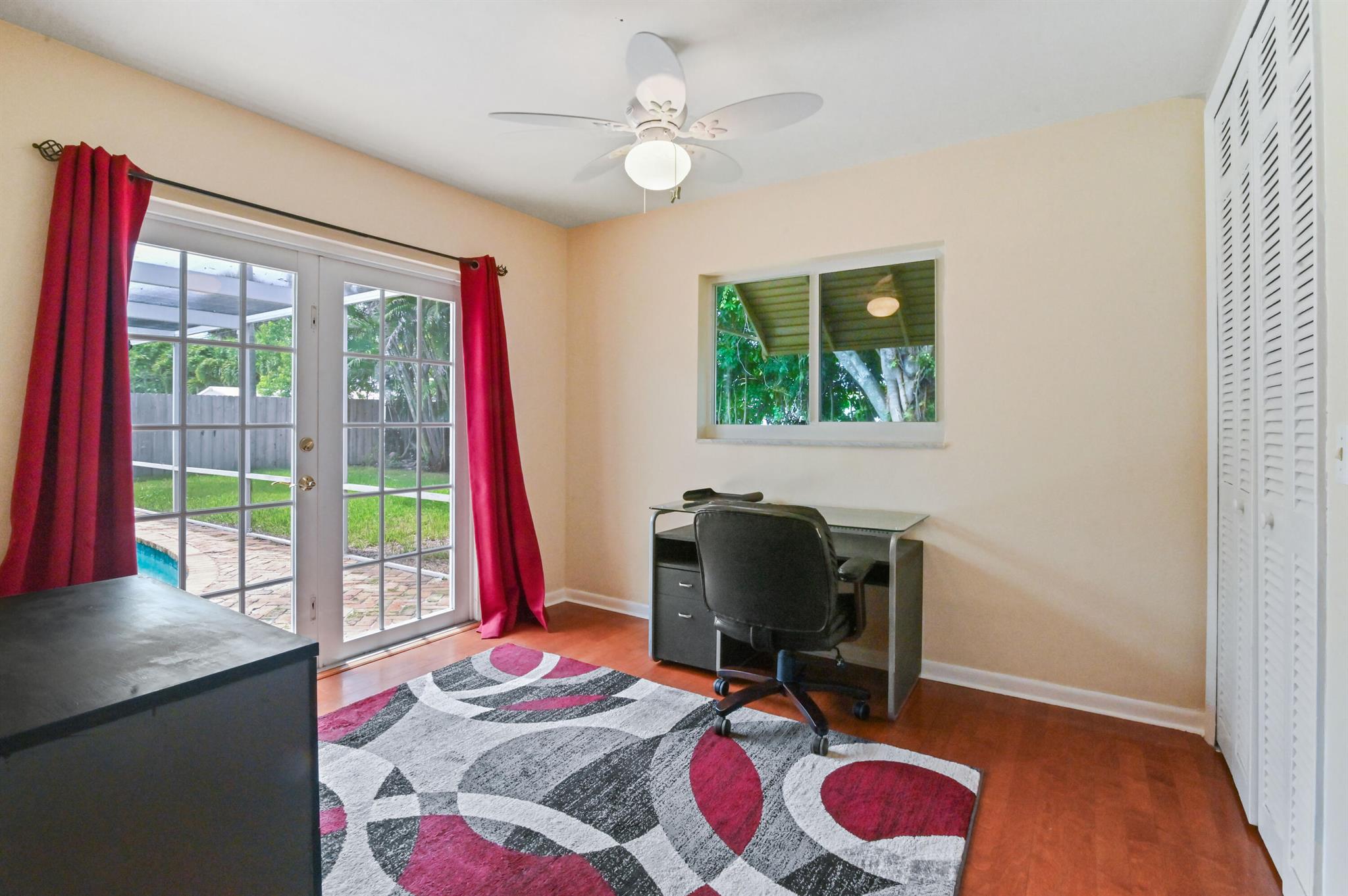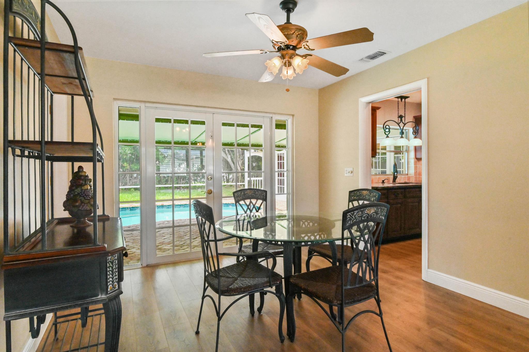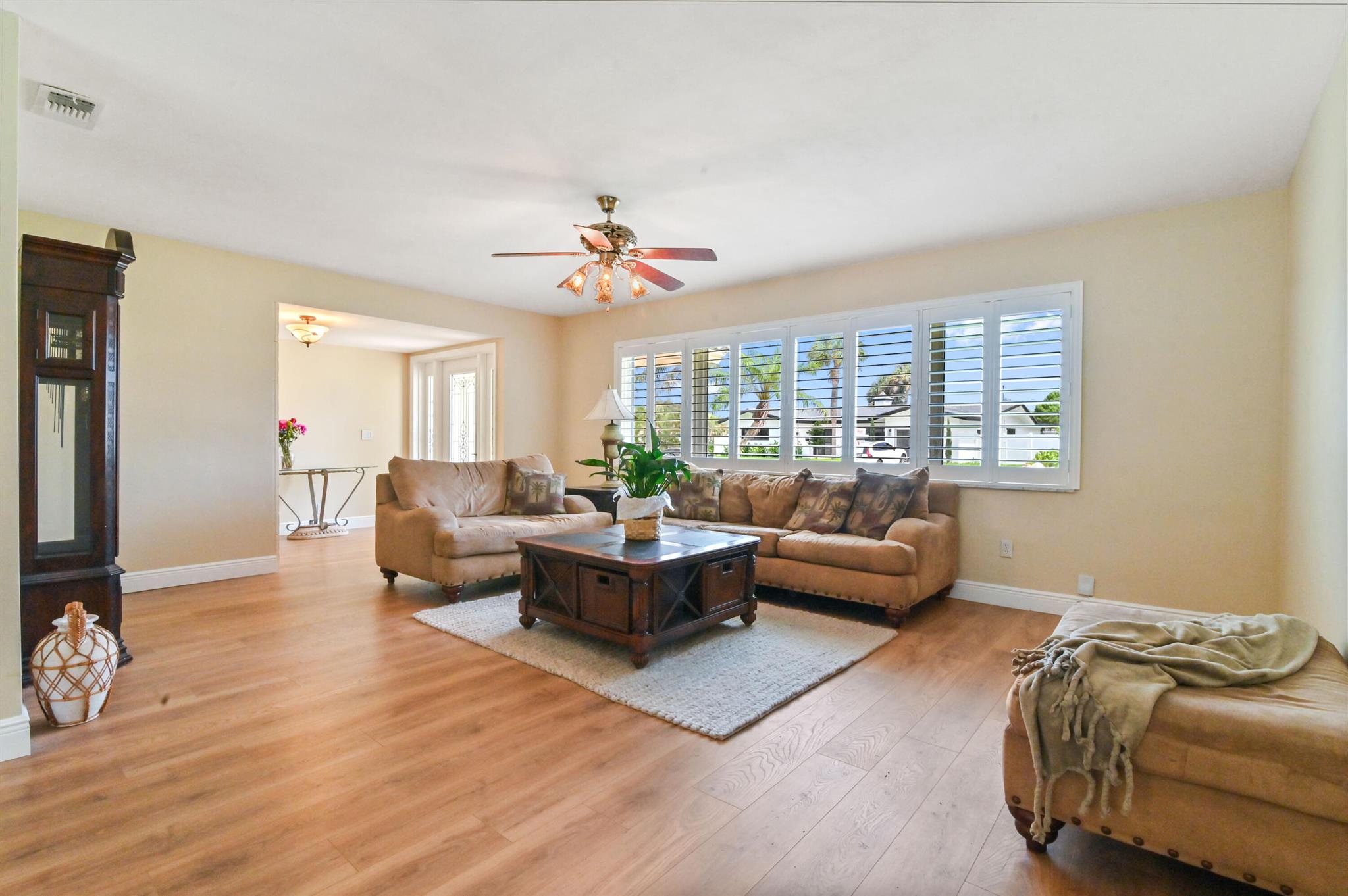 Welcome to your dream home in the highly sought-after, non-HOA community of Boca Raton Square! This immaculate single-story pool home boasts 4 spacious bedrooms and 3 pristine bathrooms, perfectly designed for comfortable family living. The charming front porch invites you into a bright and airy open living and dining area, with elegant French doors leading directly to a stunning patio and pool. The galley-style kitchen is a chef's delight, featuring gorgeous granite countertops, custom cabinets with pull out shelving, a stylish tiled backsplash, and seamless connectivity to the cozy family room.