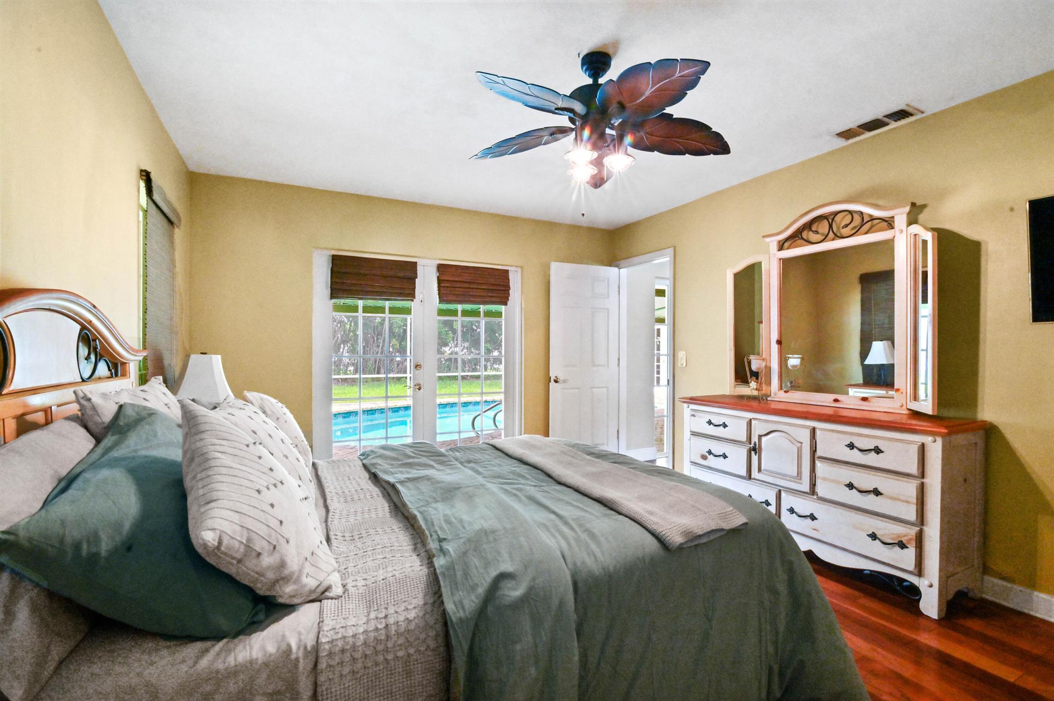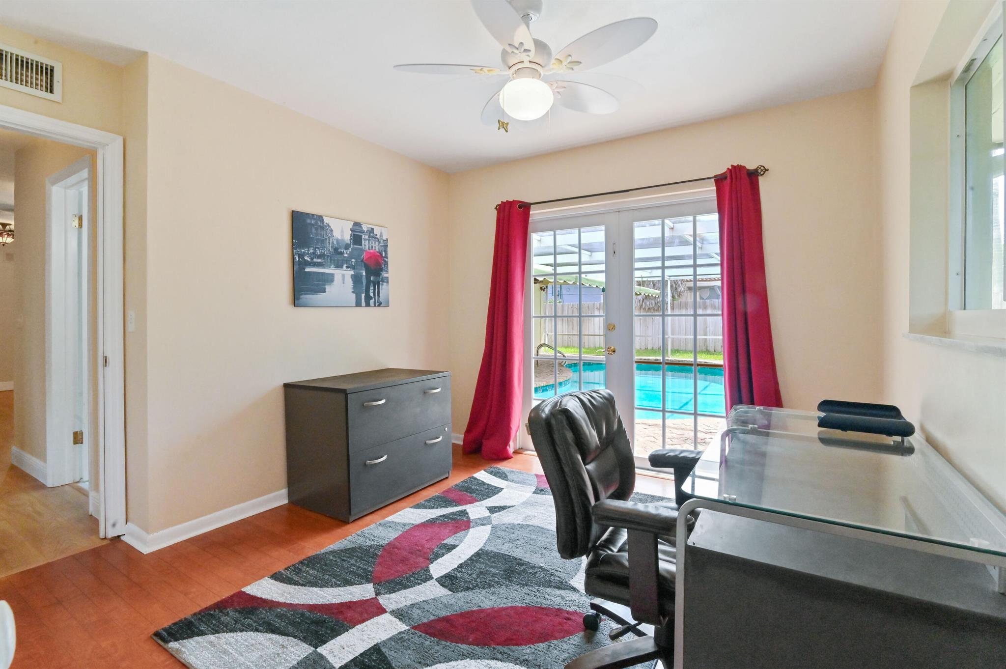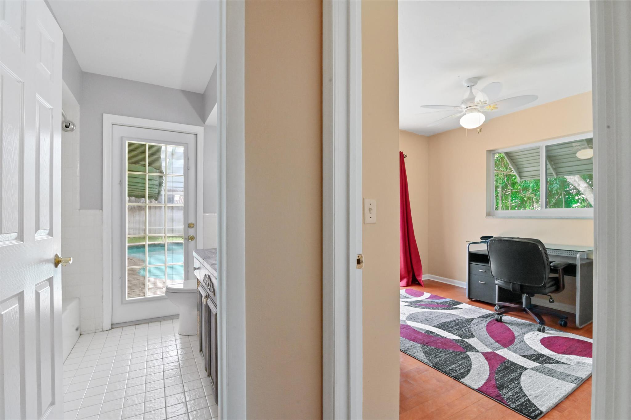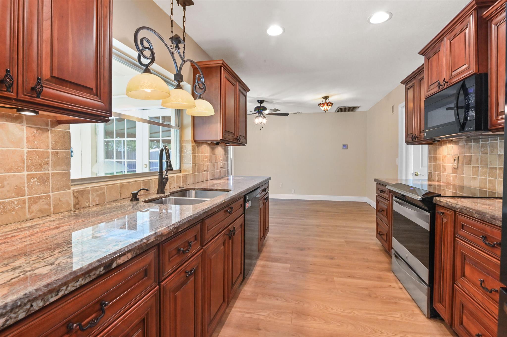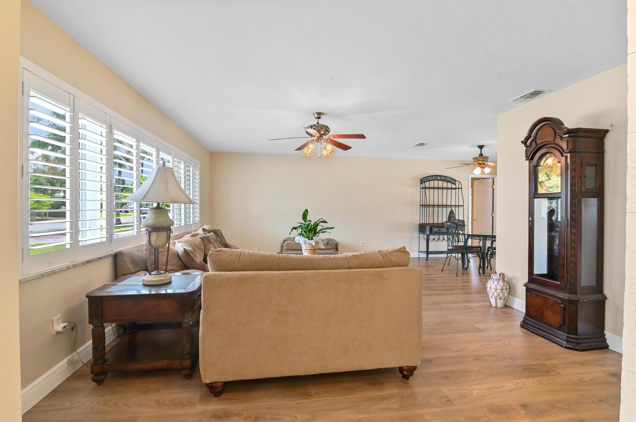 Welcome to your dream home in the highly sought-after, non-HOA community of Boca Raton Square! This immaculate single-story pool home boasts 4 spacious bedrooms and 3 pristine bathrooms, perfectly designed for comfortable family living. The charming front porch invites you into a bright and airy open living and dining area, with elegant French doors leading directly to a stunning patio and pool. The galley-style kitchen is a chef's delight, featuring gorgeous granite countertops, custom cabinets with pull out shelving, a stylish tiled backsplash, and seamless connectivity to the cozy family room.
