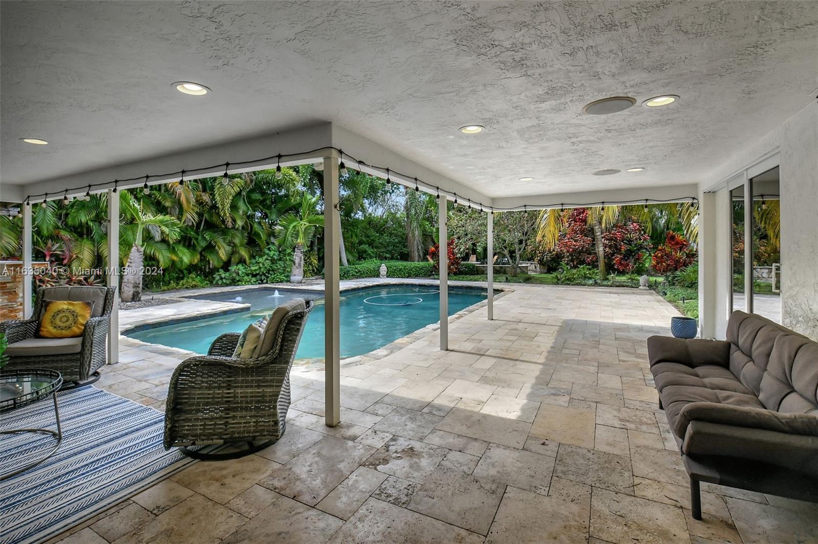 Enjoy a tropically landscaped garden, pool views, & natural light w/northern & southern exposures. Your private oasis features a custom oversized solar-heated salt chlorinated pool w/swim jet, water features, &glass-tiled swim shelf. Travertine patio includes a flagstone fire pit, built-in BBQ grill, fridge, sink, & fenced backyard w/RV space. Bright interior w/impact windows/doors, split floor plan, updated baths, LED lights, built-in speakers, & smart home features. Open kitchen w/energy-star stainless appliances & pantry. Primary bed w/ walk-in closet; guest bath w/ dual vanity. PVC pipes, relined copper sewer lines, large garage w/'24 washer/dryer, '22 AC, shop vac, & generator switch. Minutes to top schools, FAU, beach, & shops. Cameras on site.