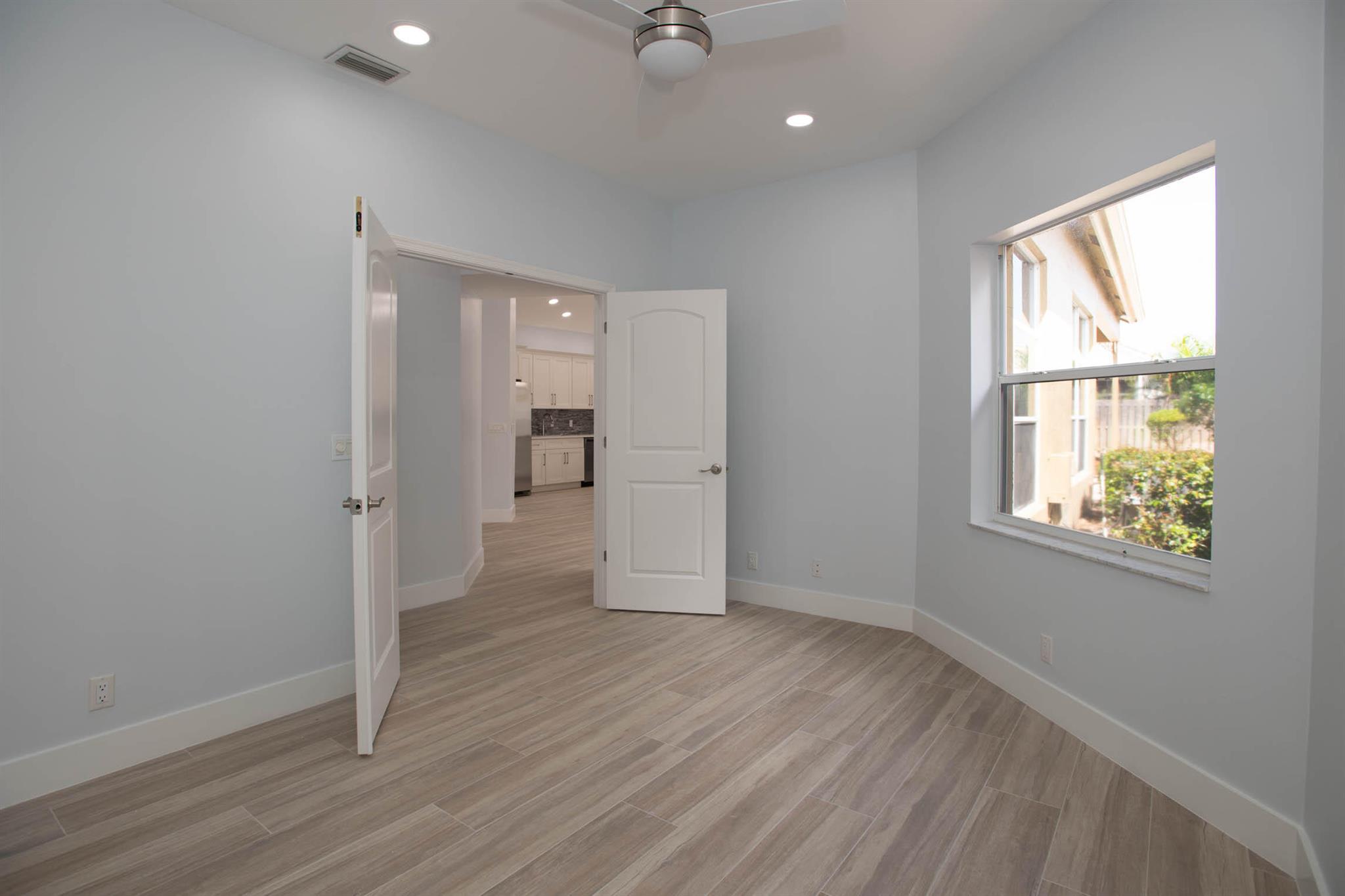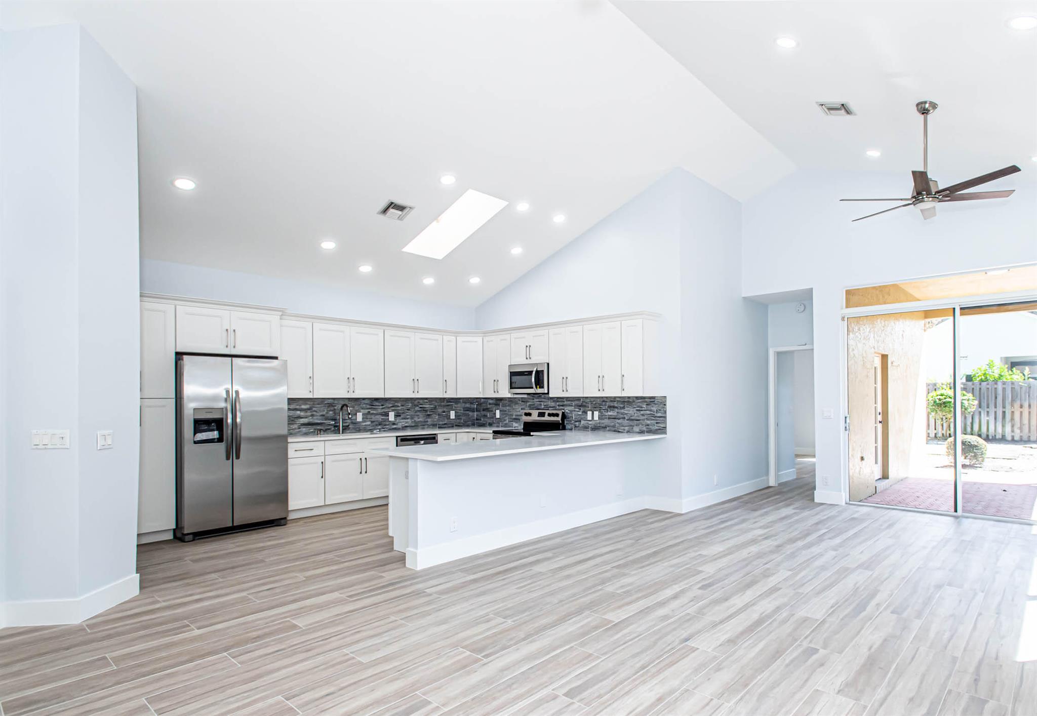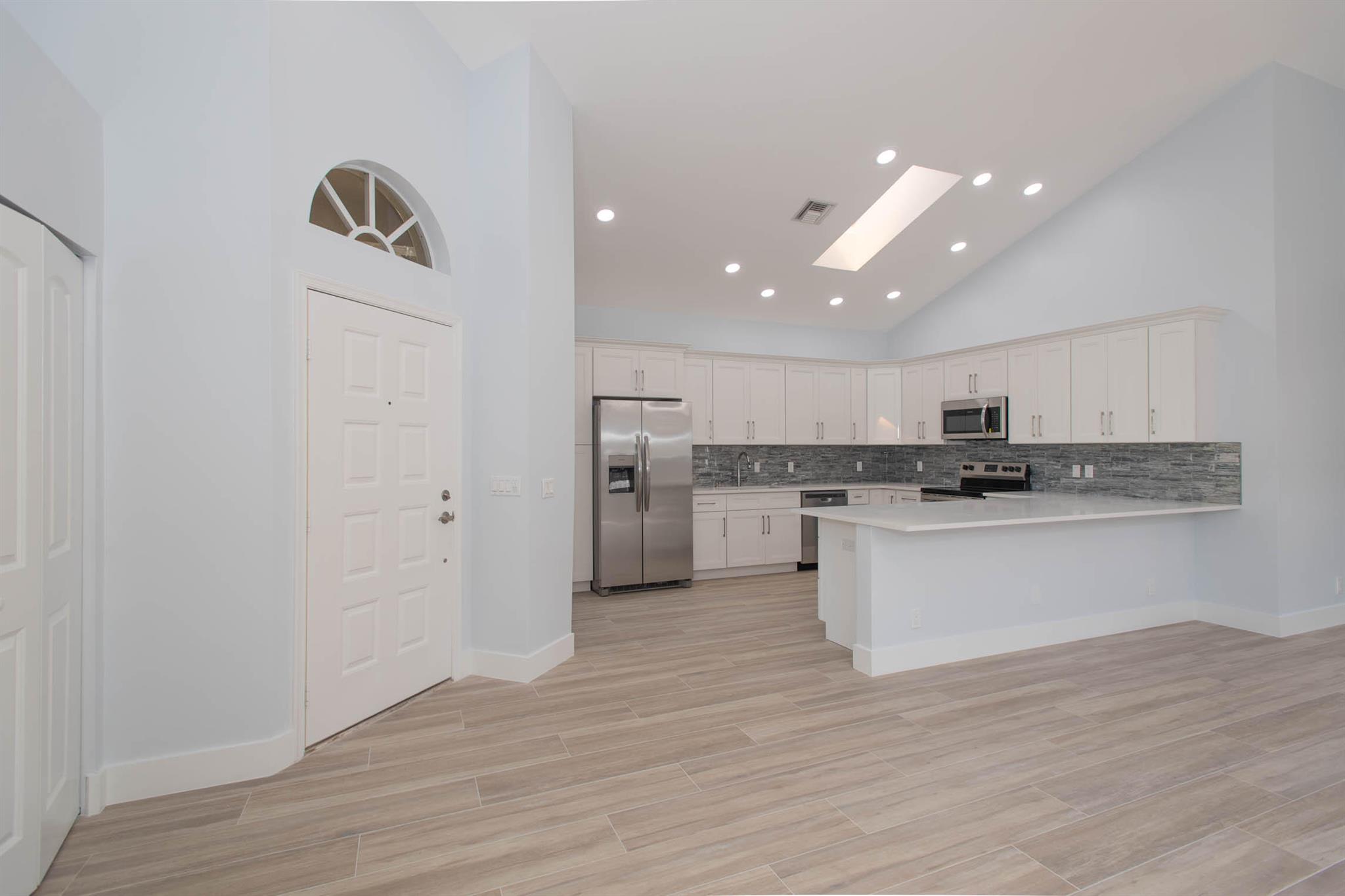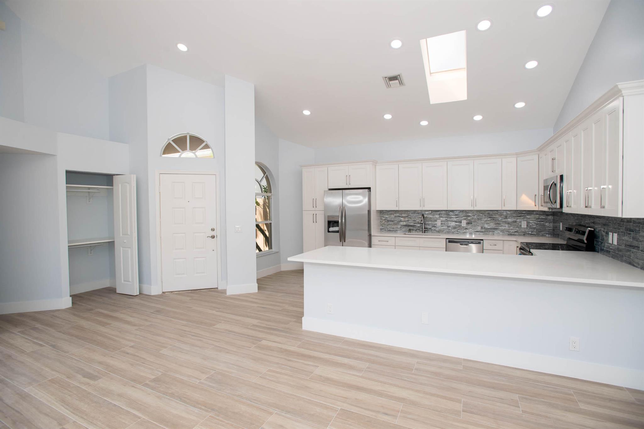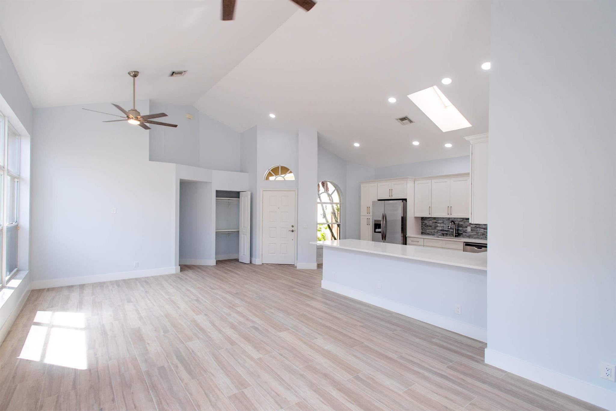 Located in Broken Sound Club ; minimum $110,000 non refundable. Perfect and pristine as a year-round or winter retreat, this stunningly chic newly renovated three-bedroom, two-bathroom home has been thoughtfully designed to showcase a modern aesthetic, neutral color palette, high ceilings, and natural light you'll enjoy from first light in the morning through sunset. Every detail of this single-family home has been carefully considered and executed, ensuring a truly luxurious living experience. The open concept chef-inspired kitchen includes stainless steel appliances, a magnificent bespoke backsplash, seating at the counter for four, and seamless integration into the spacious living and dining room areas. Additional highlights include impressive, spa-like baths and split bedrooms