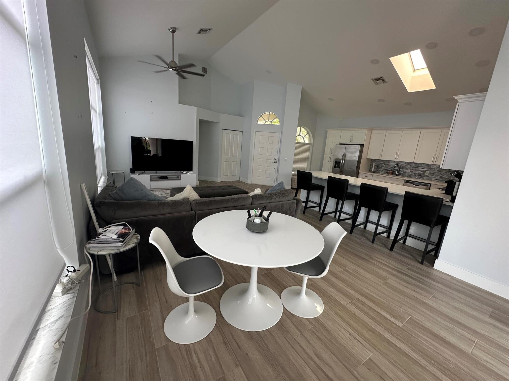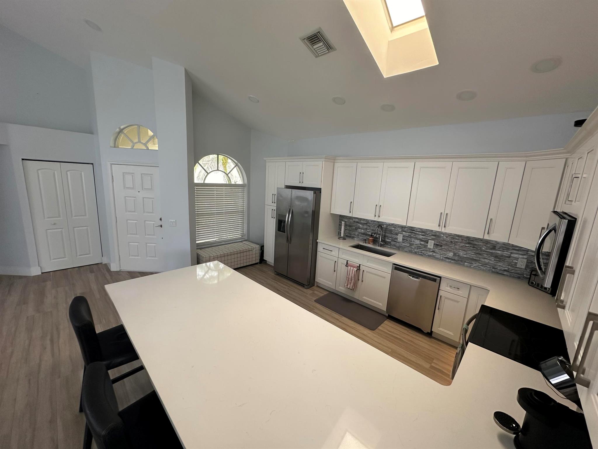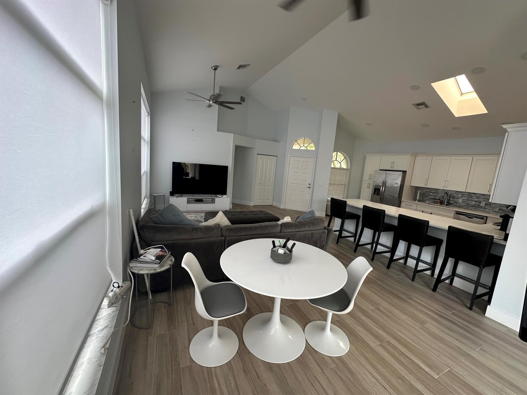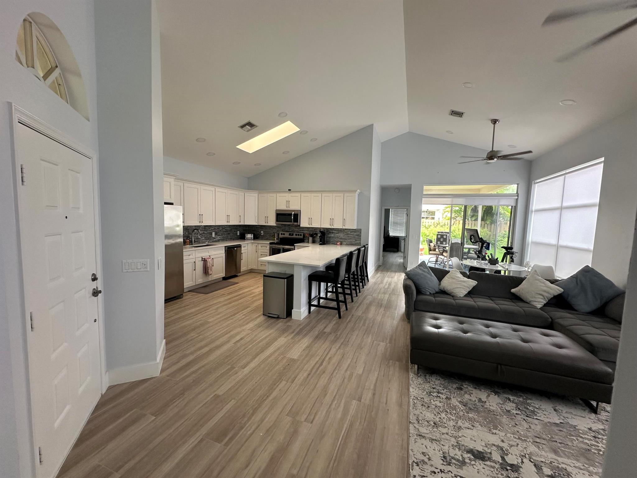 Located in Broken Sound Club ; minimum $110,000 non refundable. Perfect and pristine as a year-round or winter retreat, this stunningly chic newly renovated three-bedroom, two-bathroom home has been thoughtfully designed to showcase a modern aesthetic, neutral color palette, high ceilings, and natural light you'll enjoy from first light in the morning through sunset. Every detail of this single-family home has been carefully considered and executed, ensuring a truly luxurious living experience. The open concept chef-inspired kitchen includes stainless steel appliances, a magnificent bespoke backsplash, seating at the counter for four, and seamless integration into the spacious living and dining room areas. Additional highlights include impressive, spa-like baths and split bedrooms