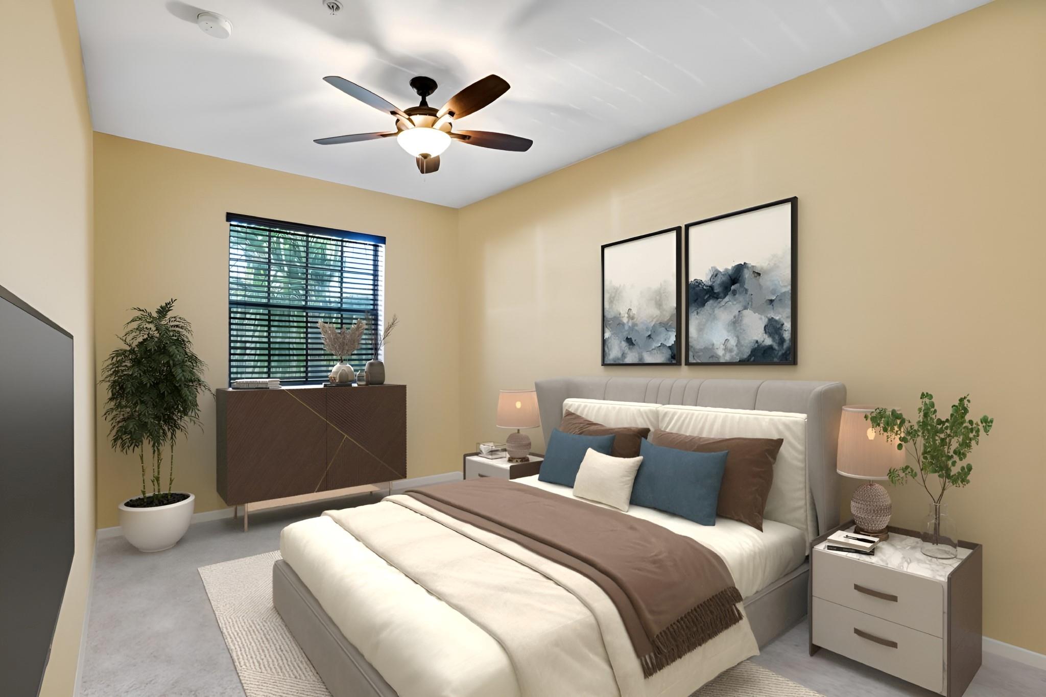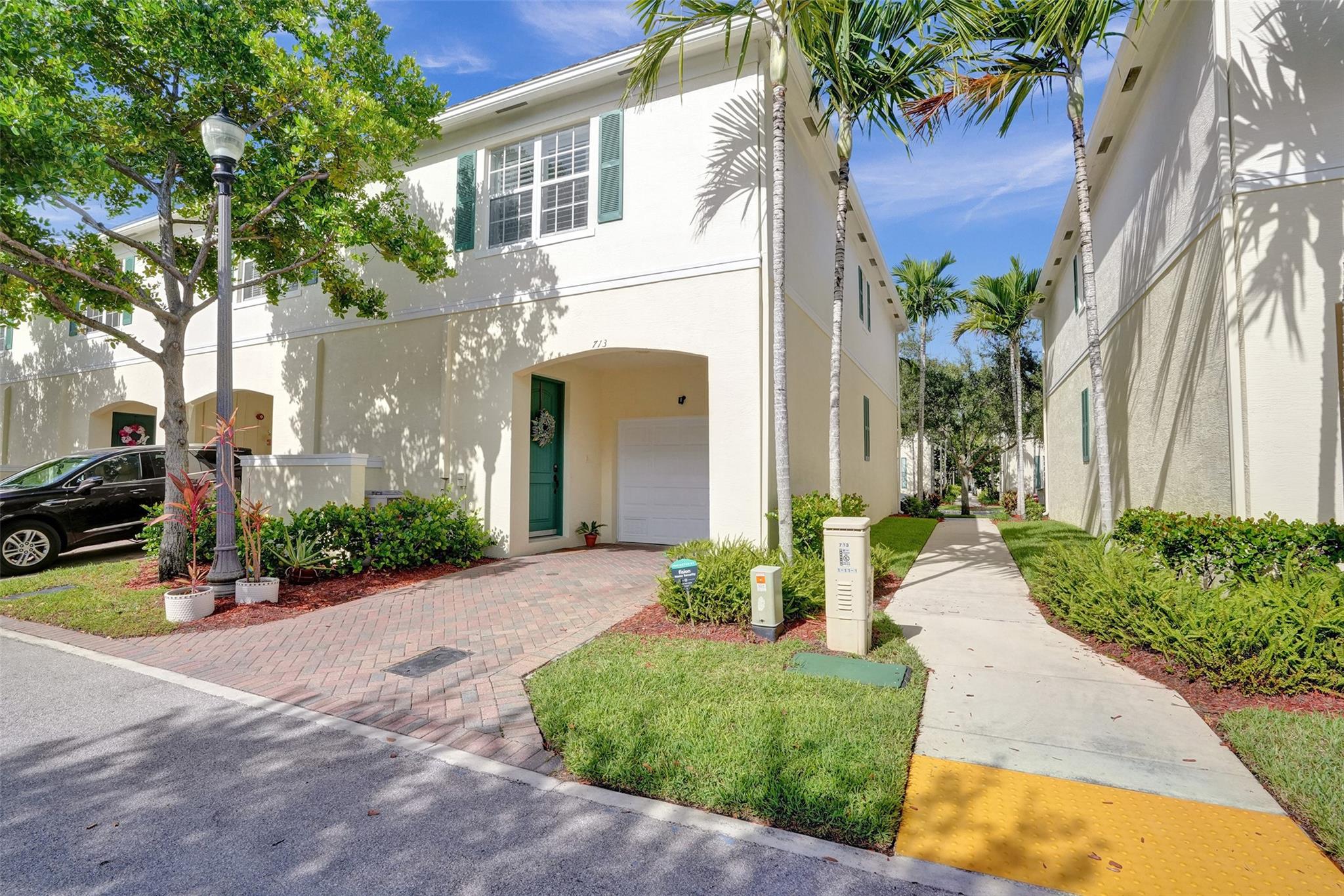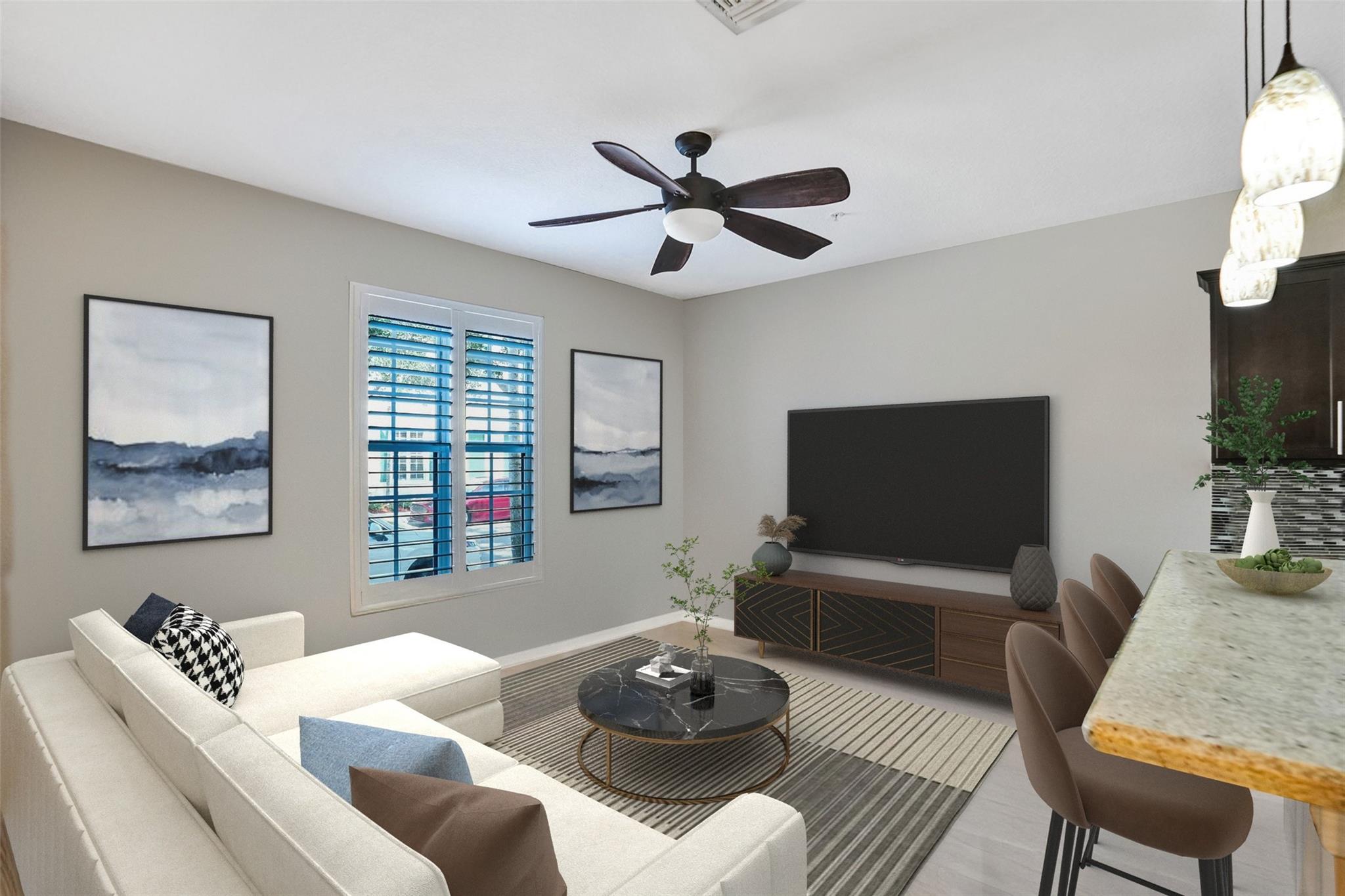 Welcome to this beautiful CORNER unit featuring 3 bedrooms, 2.5 baths, 1,784 under A/C of open concept living. This home offers high ceilings, hurricane IMPACT windows & GARAGE door. Garage roof rack will remain for extra storage. Only 1 neighbor on the side. This spacious living area is adorned with new Plantation shutters which extend into the oversized master bedroom and master bath. The master suite includes a sitting area, a huge walk-in closet and additional closet . Master bathroom with dual sink, window and a water closet. A conveniently located full size WASHER and DRYER are found on the 2nd floor. Additional features include a GUEST bathroom on the 1st floor. Fire sprinklers . PET, investor friendly .Gym, lake, trail, fiber optic internet/ cable, roof repairs included in HOA.