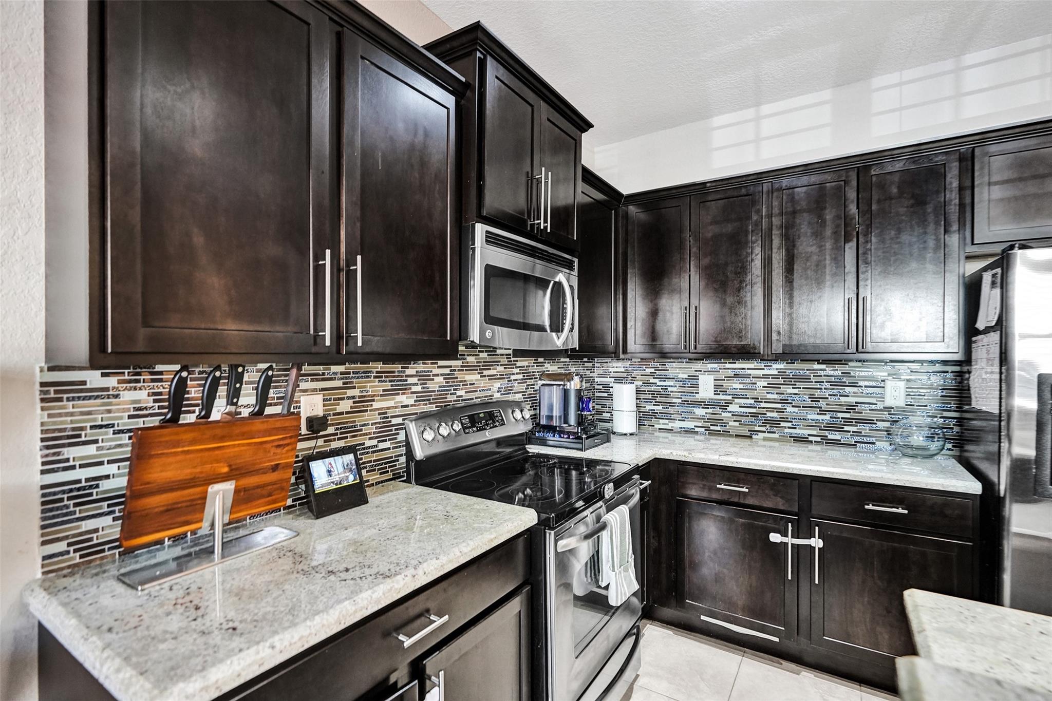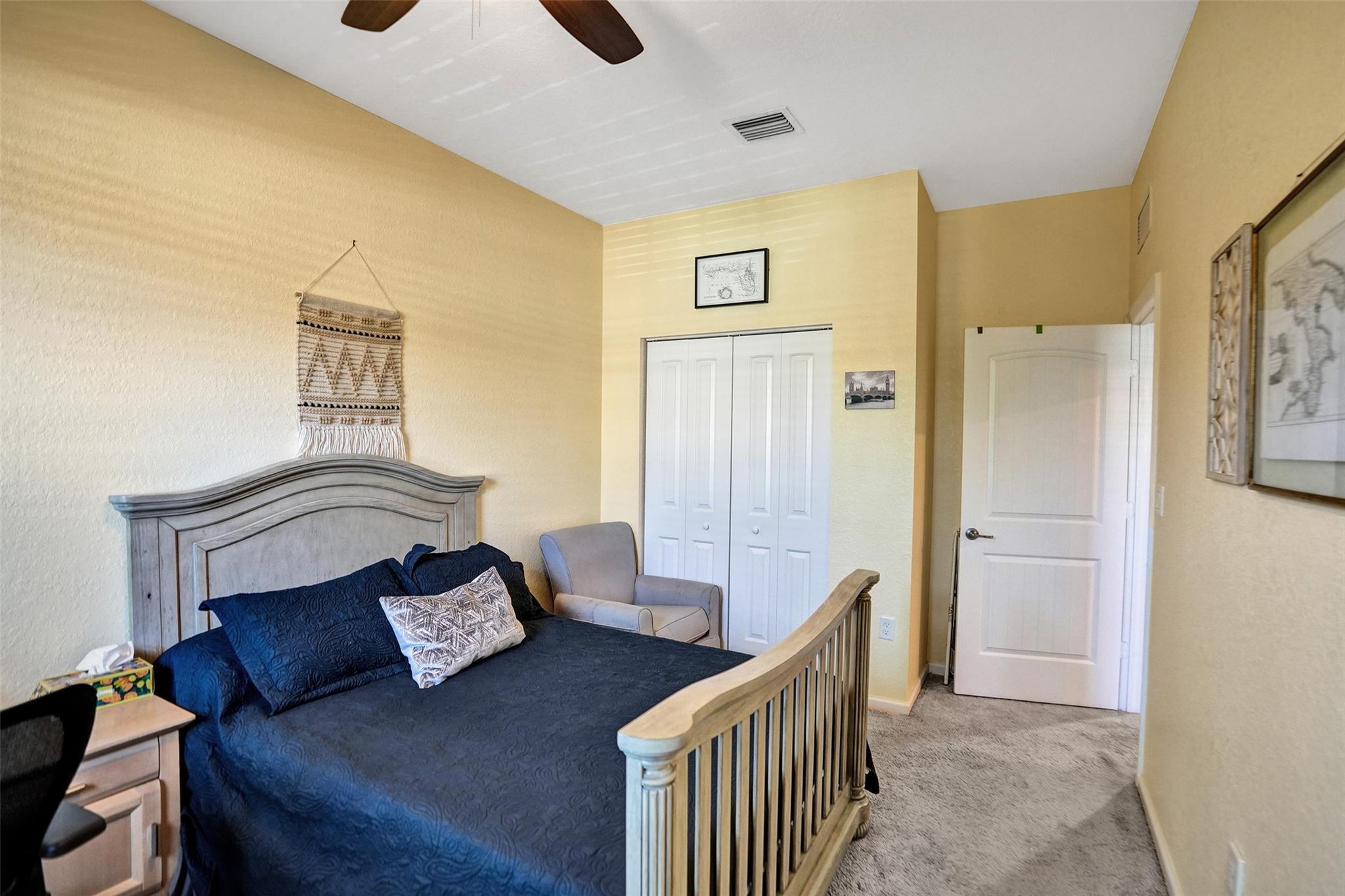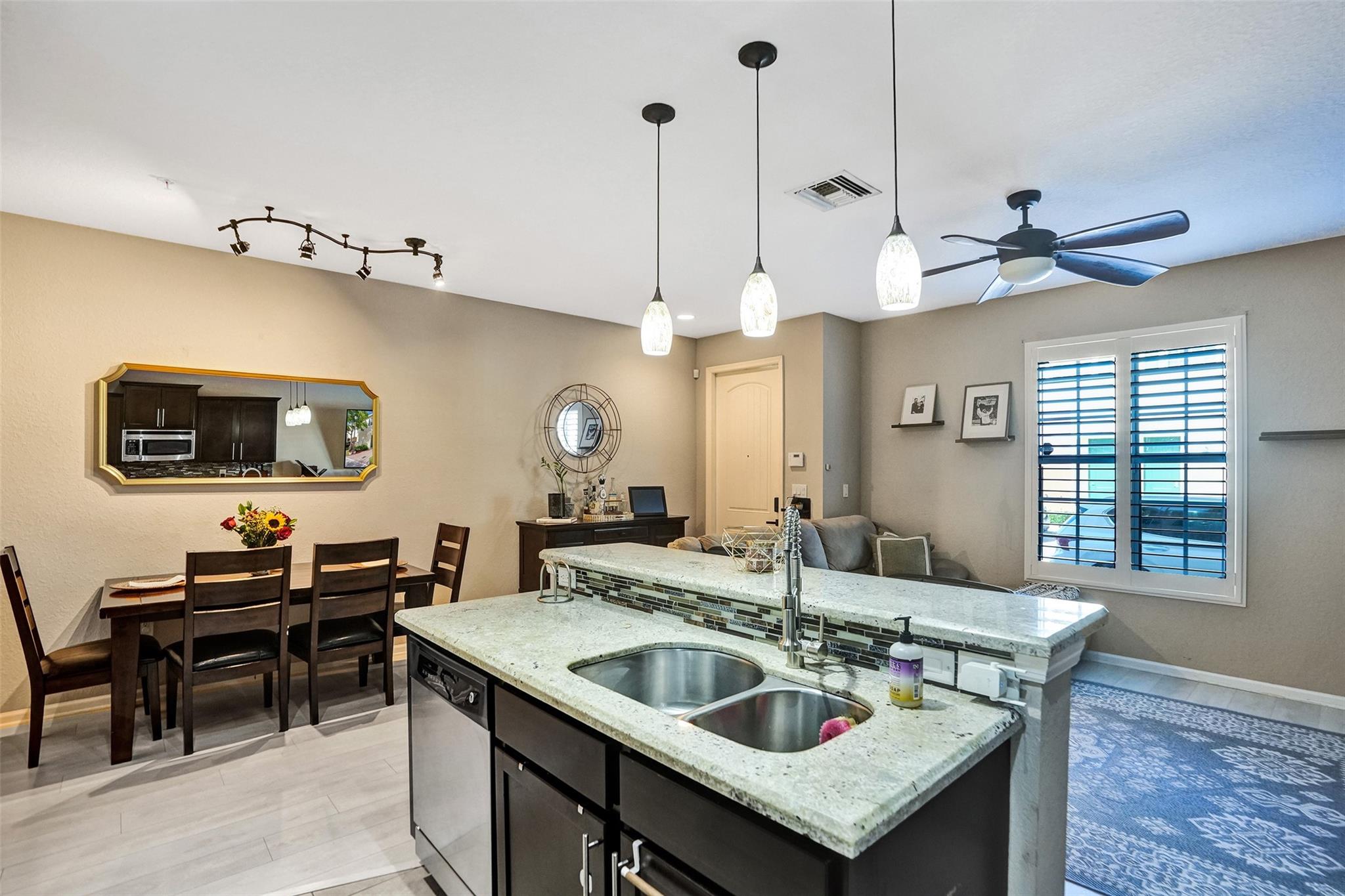 Welcome to this beautiful CORNER unit featuring 3 bedrooms, 2.5 baths, 1,784 under A/C of open concept living. This home offers high ceilings, hurricane IMPACT windows & GARAGE door. Garage roof rack will remain for extra storage. Only 1 neighbor on the side. This spacious living area is adorned with new Plantation shutters which extend into the oversized master bedroom and master bath. The master suite includes a sitting area, a huge walk-in closet and additional closet . Master bathroom with dual sink, window and a water closet. A conveniently located full size WASHER and DRYER are found on the 2nd floor. Additional features include a GUEST bathroom on the 1st floor. Fire sprinklers . PET, investor friendly .Gym, lake, trail, fiber optic internet/ cable, roof repairs included in HOA.