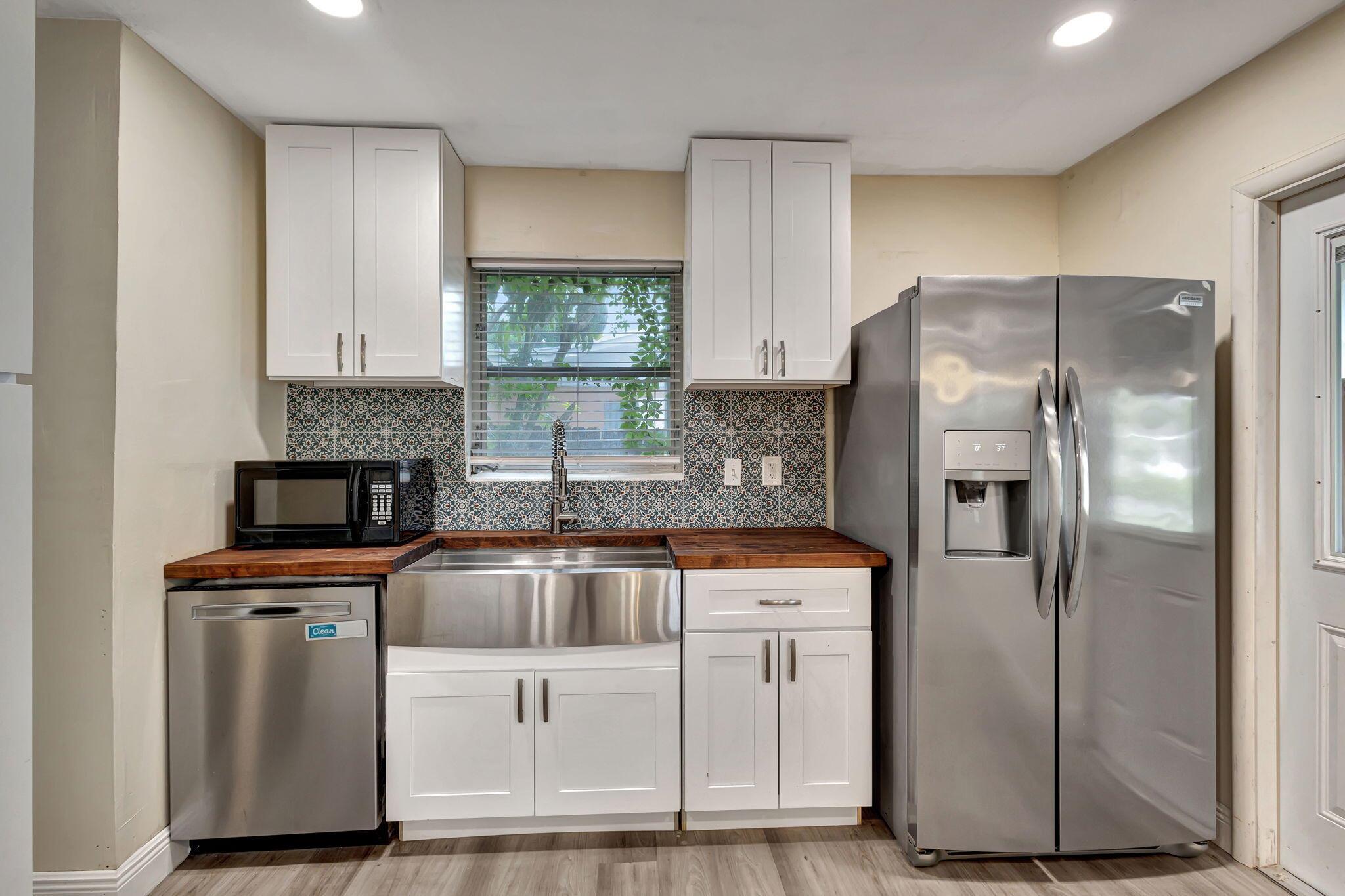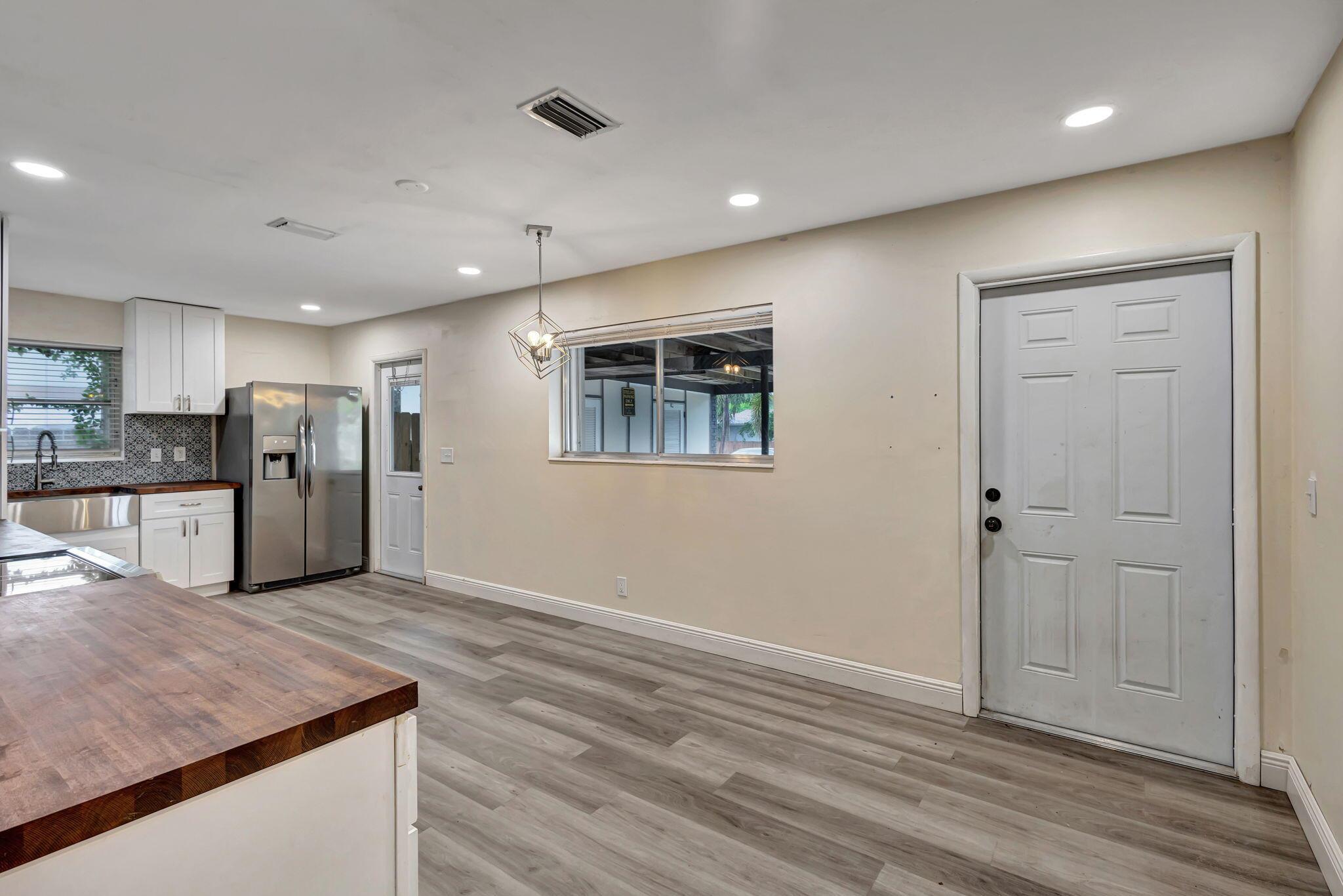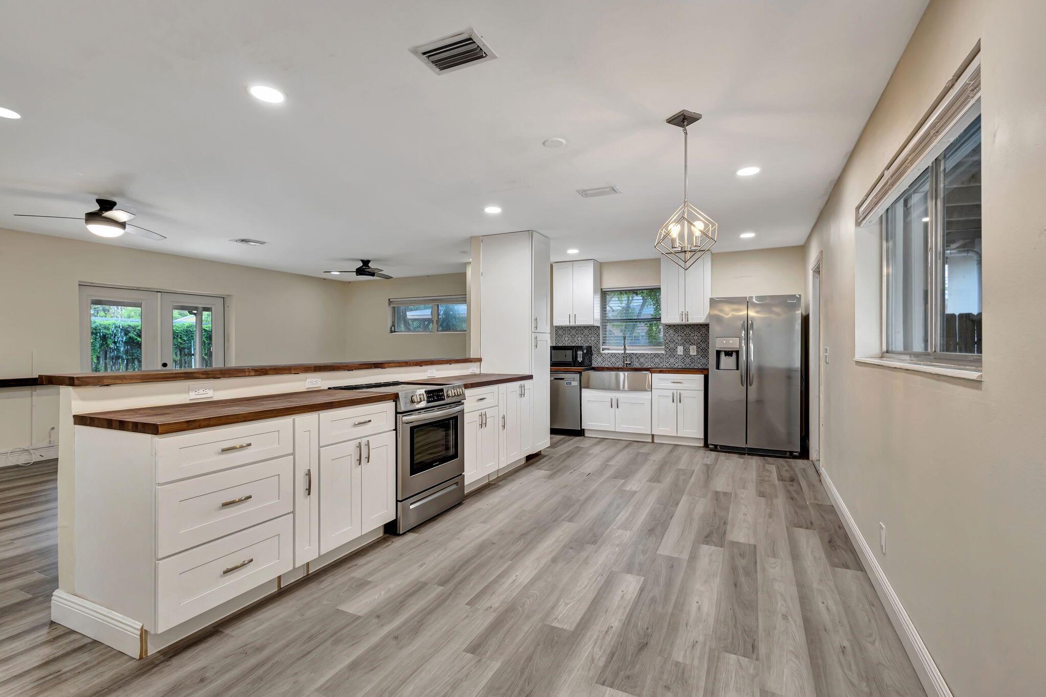 Welcome to this delightful 3-bedroom, 2-bath home in the heart of West Palm Beach, where comfort meets convenience. Situated just a short stroll from Dreher Park, this residence offers a prime location. As you enter, you'll be greeted by a spacious and open kitchen that's truly the heart of the home. The kitchen boasts white, soft close cabinetry, extensive butcher block counters and a large picture window that floods the space with natural light. This inviting area is perfect for both everyday meals and entertaining guests. The home features durable waterproof flooring throughout. The bathrooms have been updated, offering a fresh and modern feel. LED lighting throughout the home enhances its brightness and energy efficiency. Roof, A/C, water heater, baths, appliances,