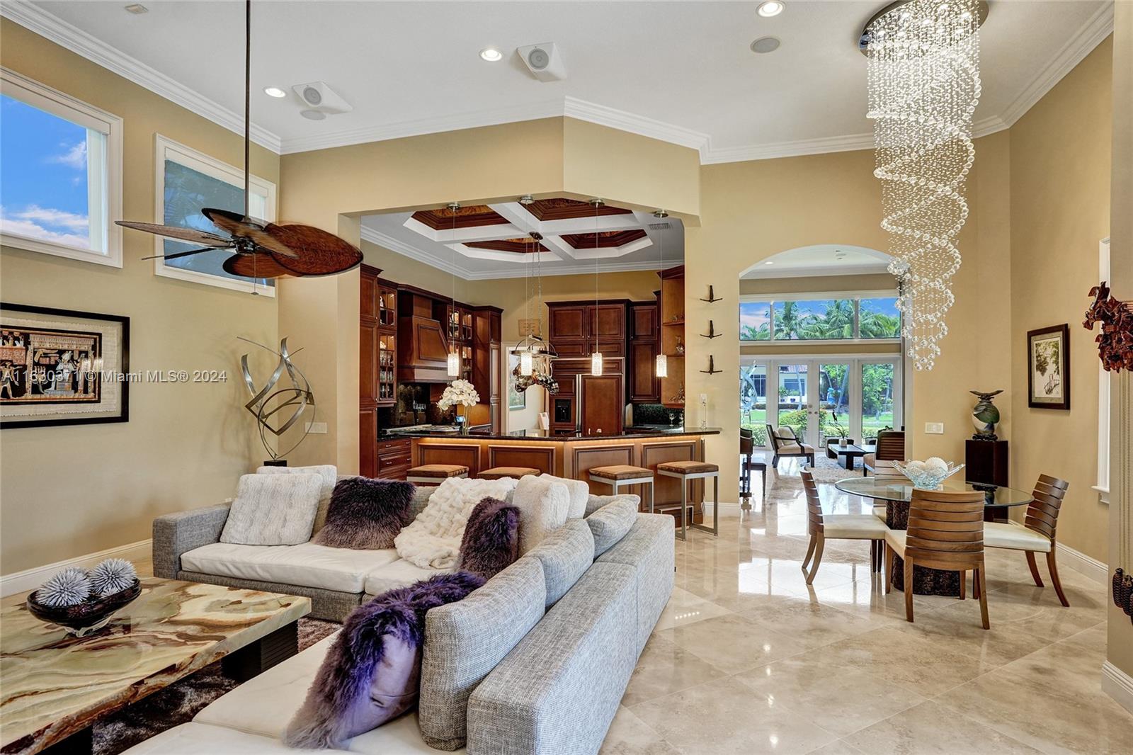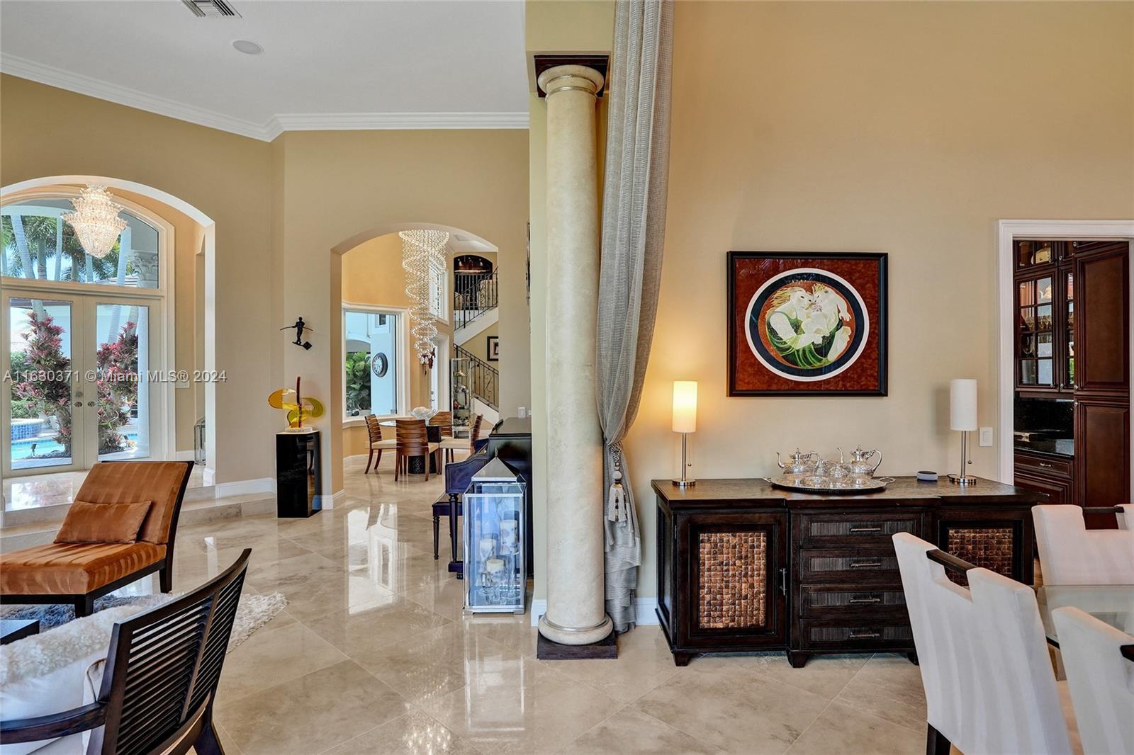 YOUR PRIVATE TROPICAL OASIS AWAITS YOU! Stunning 2 story house on a quiet cul-de-sac in the 24/7 guard gated Hawks Landing. It features 5 bed/4.5 bths w/ waterfront views. A New Roof, exterior paint 2023, all impact windows/doors in 2022. Smart Home, security cameras, security lights. The first floor has the sumptuous primary w/dbl W.I.C., marble spa bath. Wood floors & high volume ceilings make this a true retreat. Enjoy your large chef's kitchen with dbl. stacked wood & glass cabinets. High end appliances w/ 6 burner gas stove & dbl. ovens. New wine & beverage cooler makes for easy entertaining. marble & wood floors throughout. The separate guest house has views of the pool & spa plus amazing courtyard landscaping, W.I.C. and refreshment bar plus full bath. Look no further, you’re home.