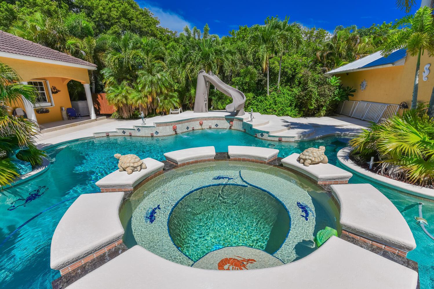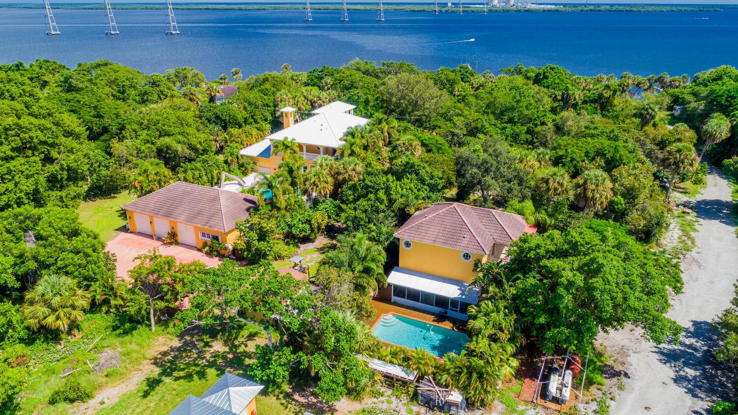 Estate Home with Guest House sitting on a 7.25 Acre parcel of Riverfront land, w/ 460' walk out dock. Calling all Car Collectors ,Very Private Estate Home with attached 2 car garage set back over 250'. Plus 2 Separate Large Garages perfect for Car collection ,3 car detached garage with A/C ,gym & bath,CBS 32X55, plus a new 5 car garage 72' X 32' with apartment , full A/C . High & Dry w/30 ft elevation ''per owner''. Main House 4600 under a/c 6,400 total. 10 ft ceiling Height,3 story, 4 bed, 4 bath, Granite Counters Kitchen & Baths,Double Oven, Media Room, Covered Balconies front and rear, Newer Aluminum Roof, Impact Windows 2nd & 3rd Floors, Electric Hurricane Panels first floor, 60,000 gallon free form resort salt water pool w/Spa , Horses OK