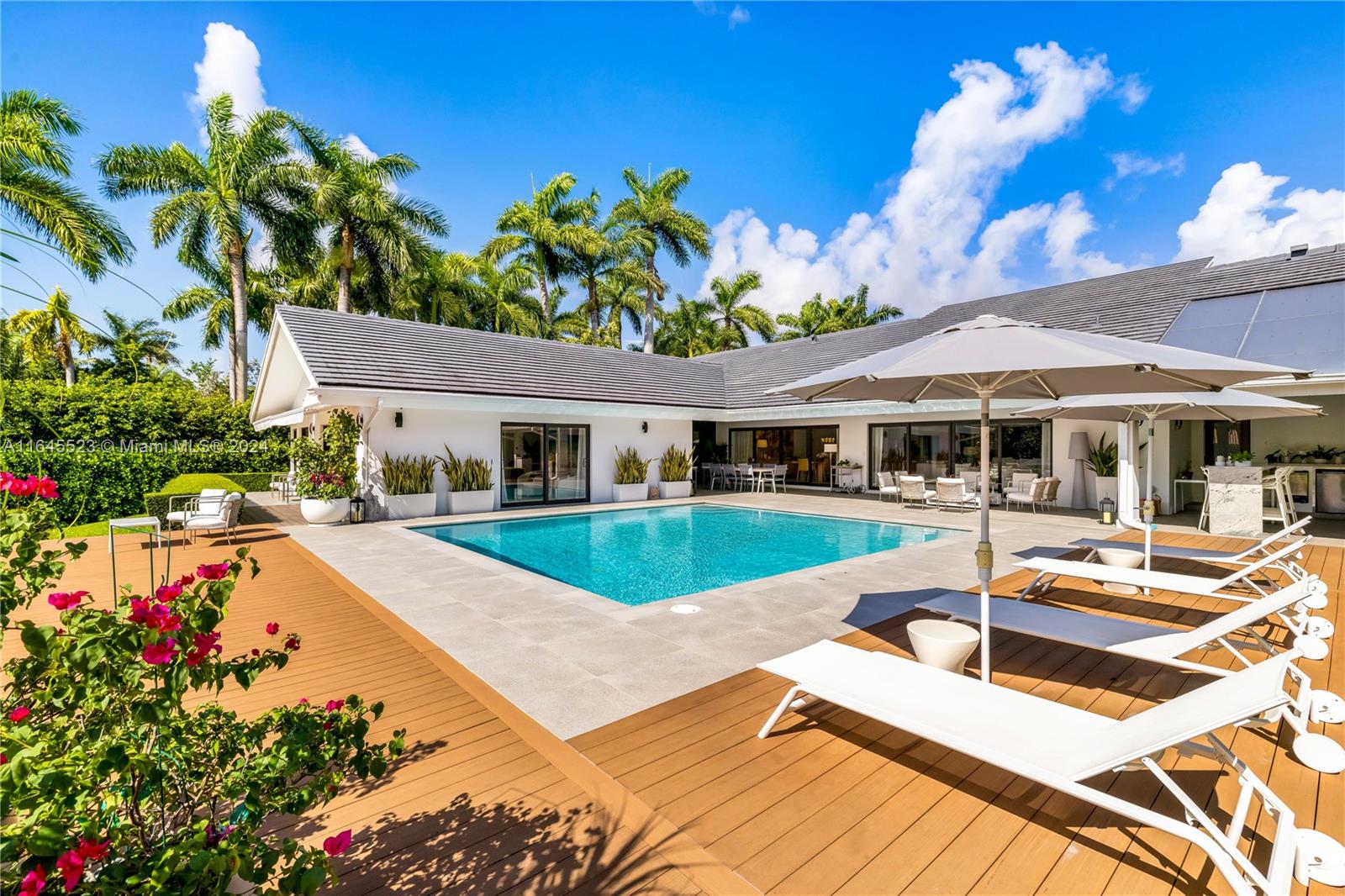 One story waterfront Jewel home exquisitely finished to the last detail. Architectural beams, open floor plan overlooking the pool & 114 ft. of waterfront. 3/4 bedrms, 5 bathrms, office + large family rm. Croatian Oak floors throughout. Kitchen w/Dell Anno cabinetry, Miele appliances, Subzero refrig, pantry & laundry rm. Hallway features a glass wine cellar that leads you to the main suite w/sliding glass doors overlooking terrace & water. The main suite w/2 separate ensuite bathrms, one w/Jacuzzi & steam bath, automatic toilets & 2 separate walk-in closets. Covered terrace w/2 BBQ’s, 1 propane,1 charcoal, icemaker & small fridge.2-car garage. Impact w/d, prop. generator. 65’ Dock.Sec1 voluntary Civic Assoc. to use tennis cts. Sec 1 Sp. Tax District.Furniture available for sale separately.