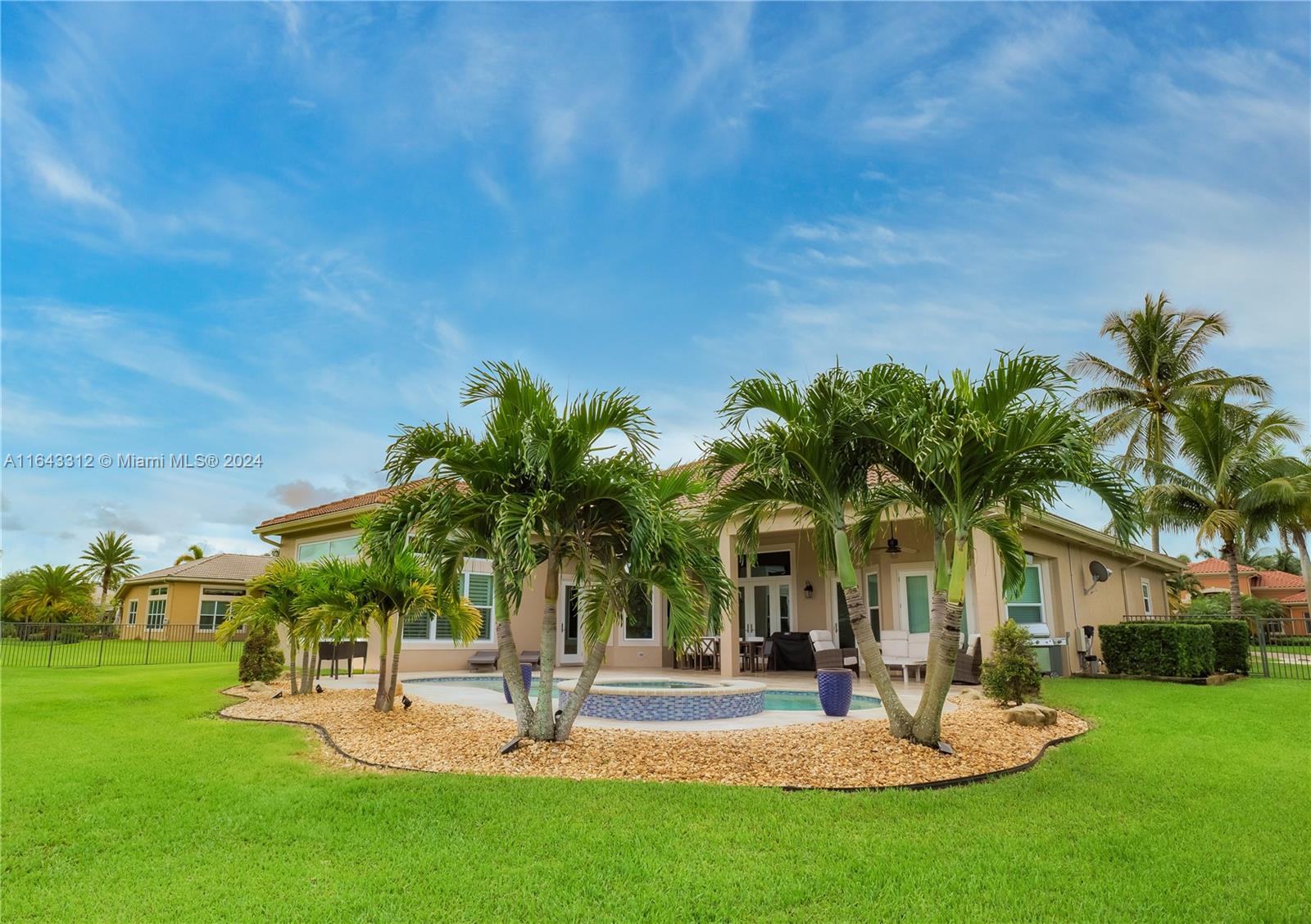 Welcome to this elegant lakefront estate located in the guard gated community of Riverstone. This magnificent one-story home features 5 bedrooms, 4 bathrooms, high ceilings and an open concept of sophisticated living space. The home exudes charm and elegance, with plantation shutters throughout and impact windows and doors for added security and peace of mind. Nestled on an expansive oversized fenced lot, the property offers a beautifully landscaped, fenced yard, perfect for privacy and relaxation. The spacious backyard and patio are designed for entertaining with a magnificent lake, pool and spa views from every living space of the house. 2022 Roof. Experience unparalleled refinement in this stunning home.