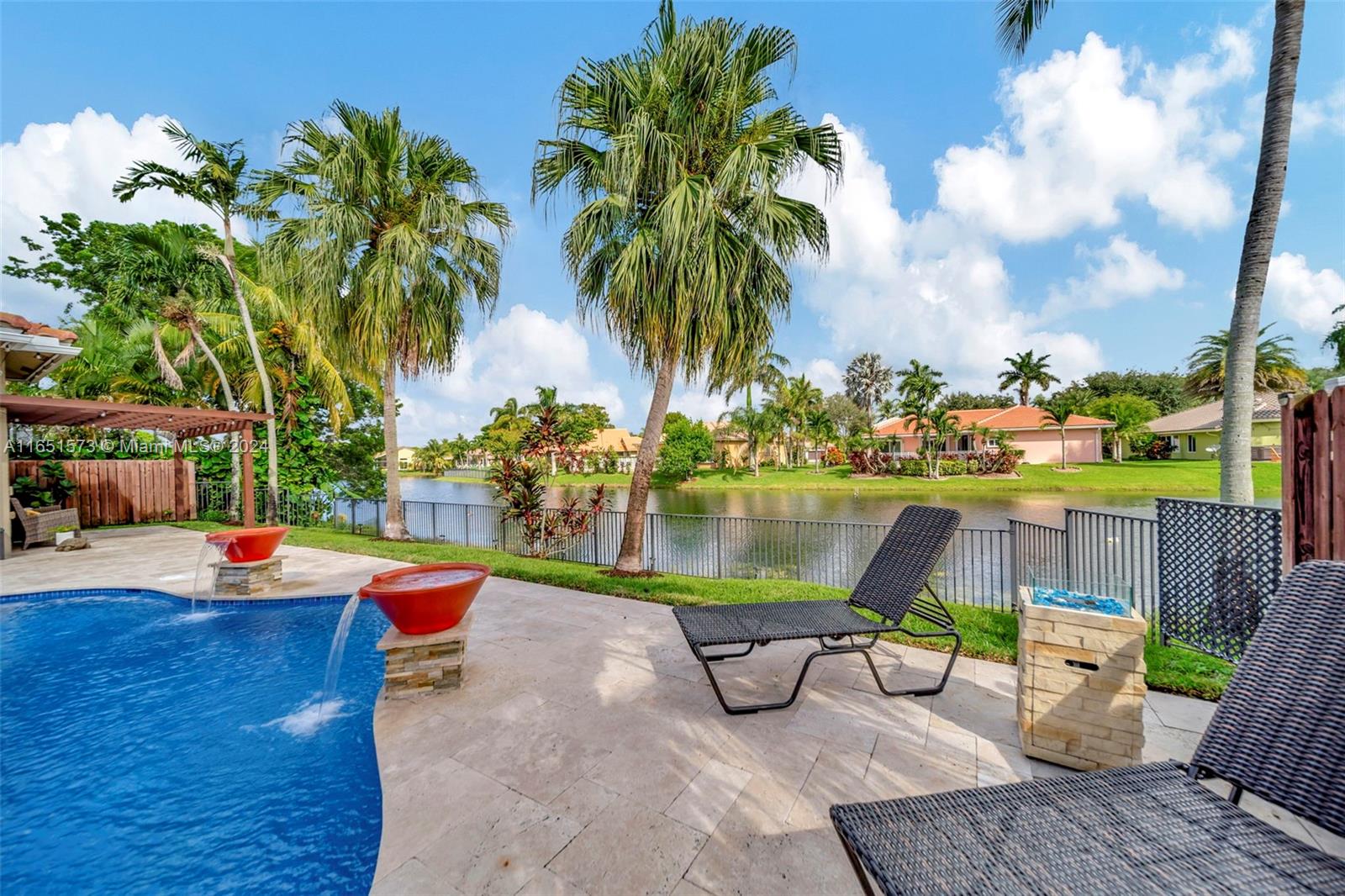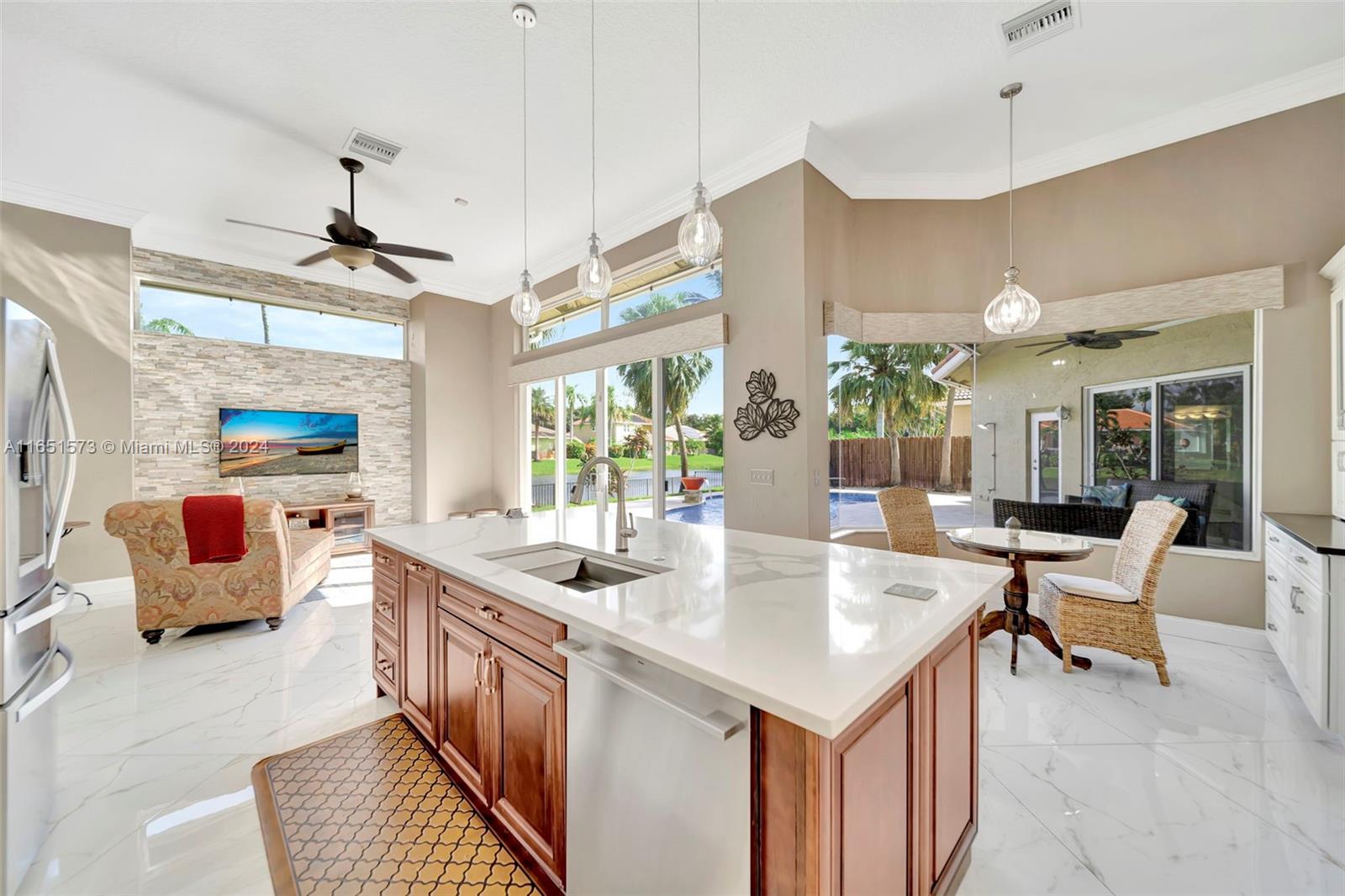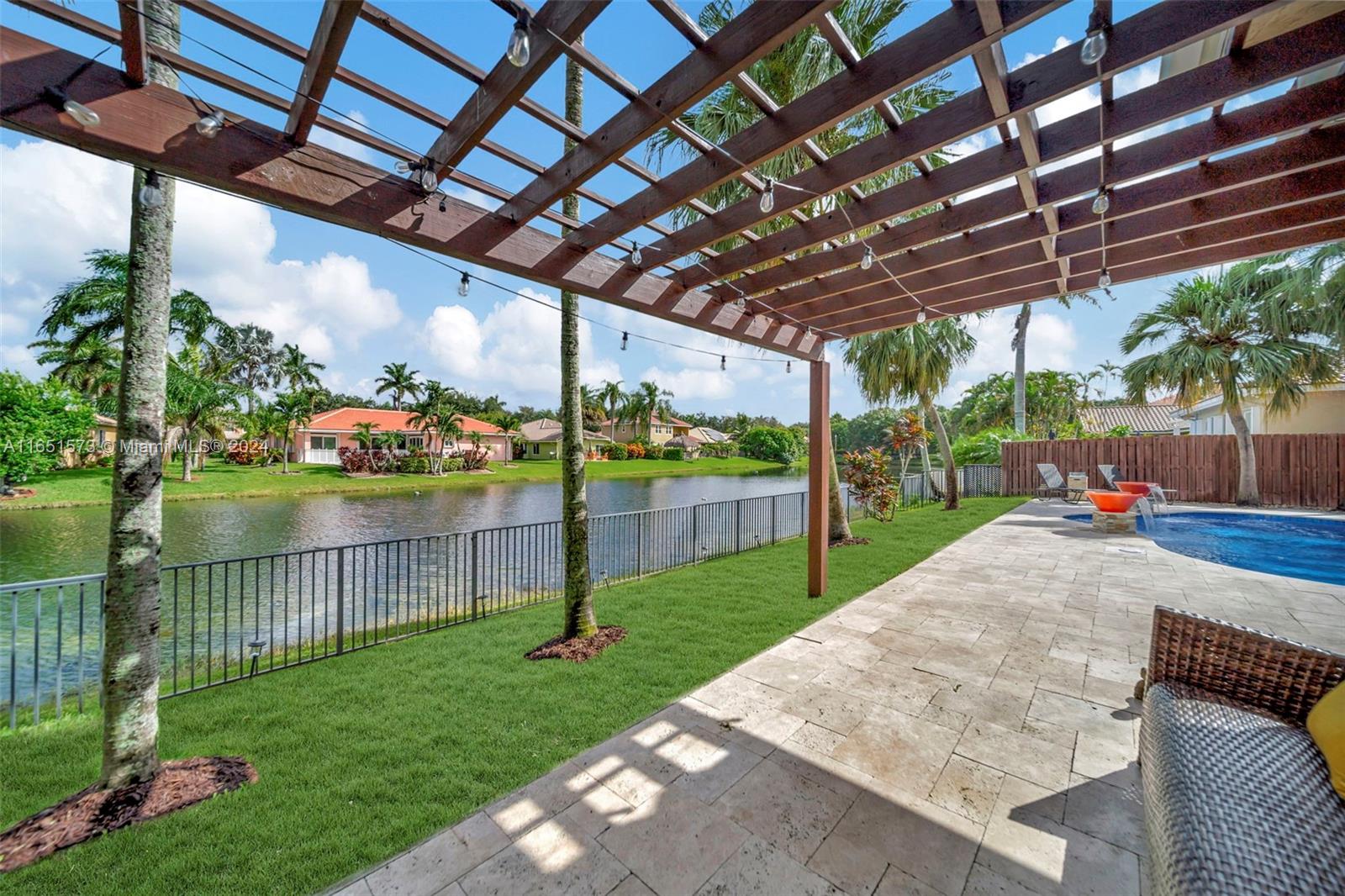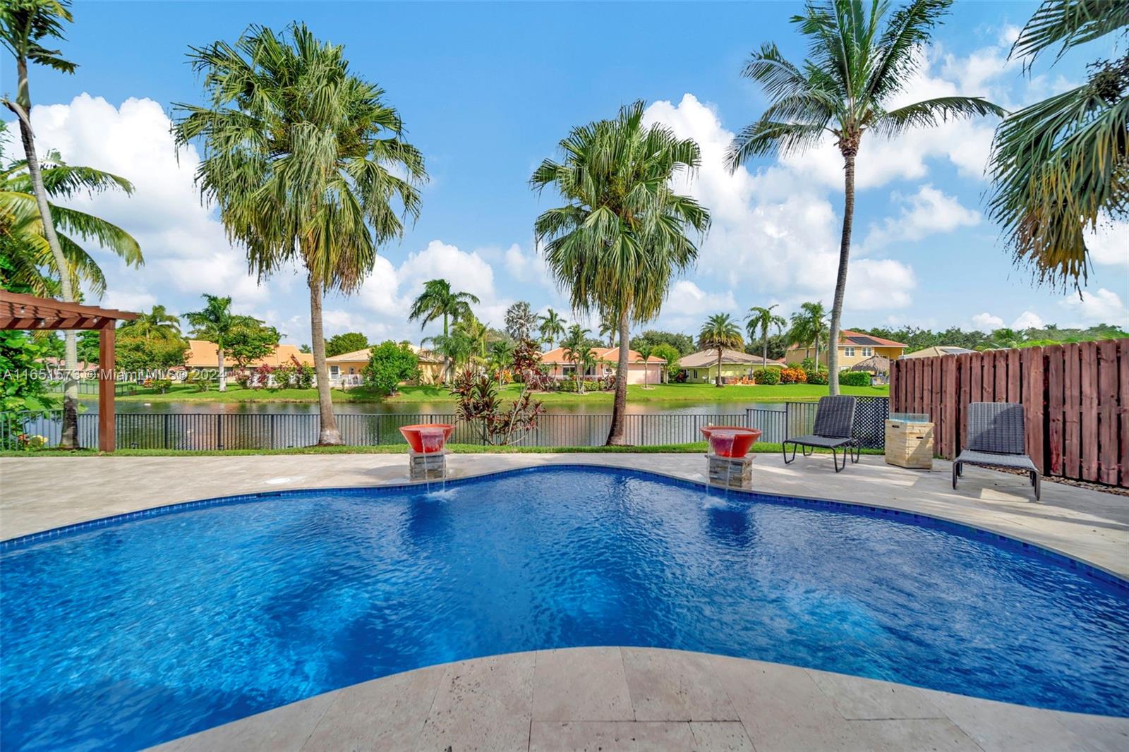 This stunning four-bedroom, two-and-a-half-bath single-family home offers breathtaking views of a serene lake, complemented by a luxurious pool surrounded by elegant travertine pavers. The interior is bathed in natural light, highlighting the elegant bamboo wood & porcelain tile flooring throughout. The chef's dream kitchen is a masterpiece, featuring high-end Thomasville cabinets, sleek quartz countertops, and monogram SS appliances. Every corner of the home showcases thoughtful upgrades such as hurricane impact windows/doors,stacked natural stone wall, new lighting, crown molding adding to its luxurious appeal. With the added benefit of an assumable mortgage at 1.99% and low HOA, this property truly has it all and much more! For a private showing, call TODAY!