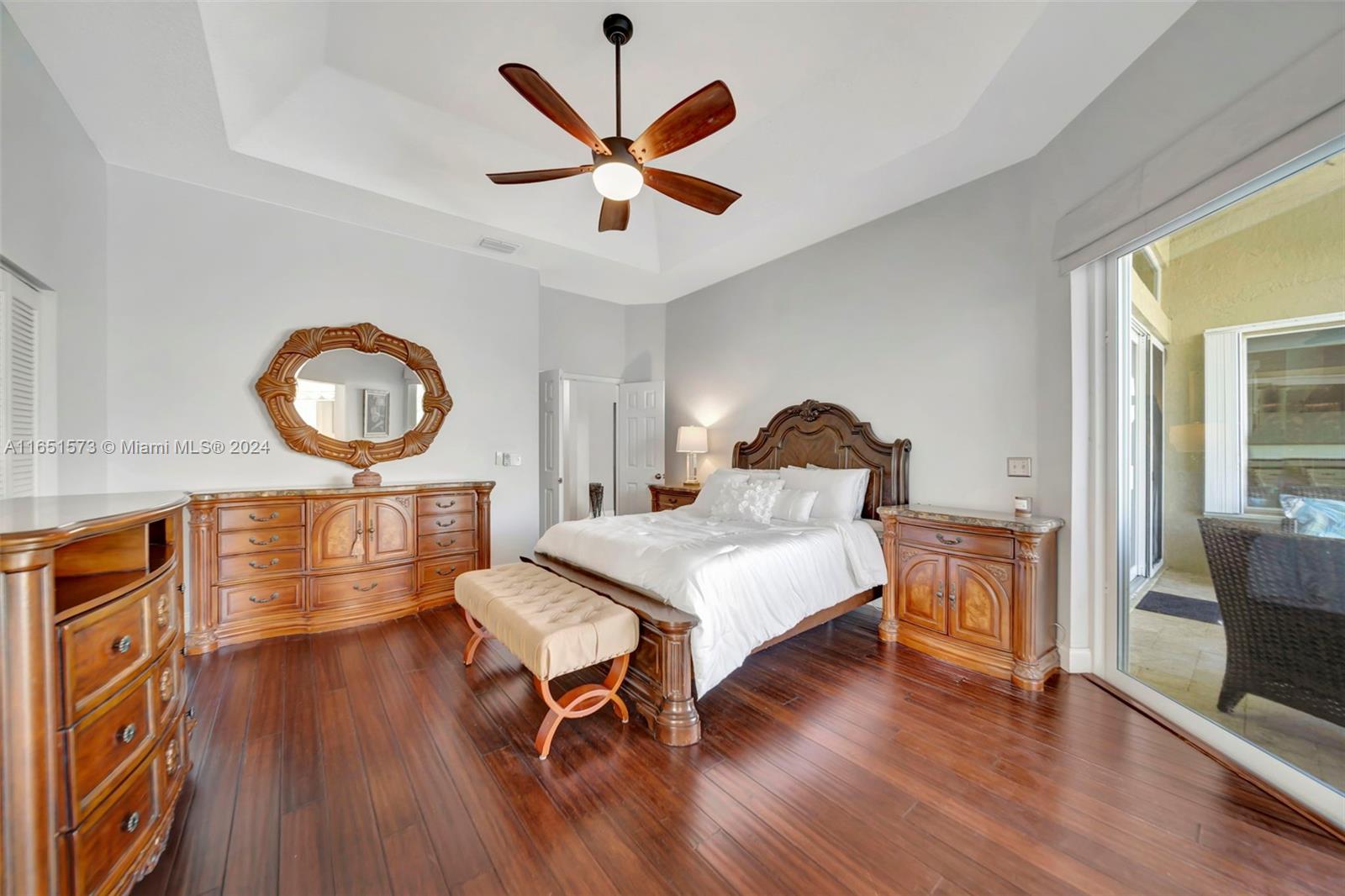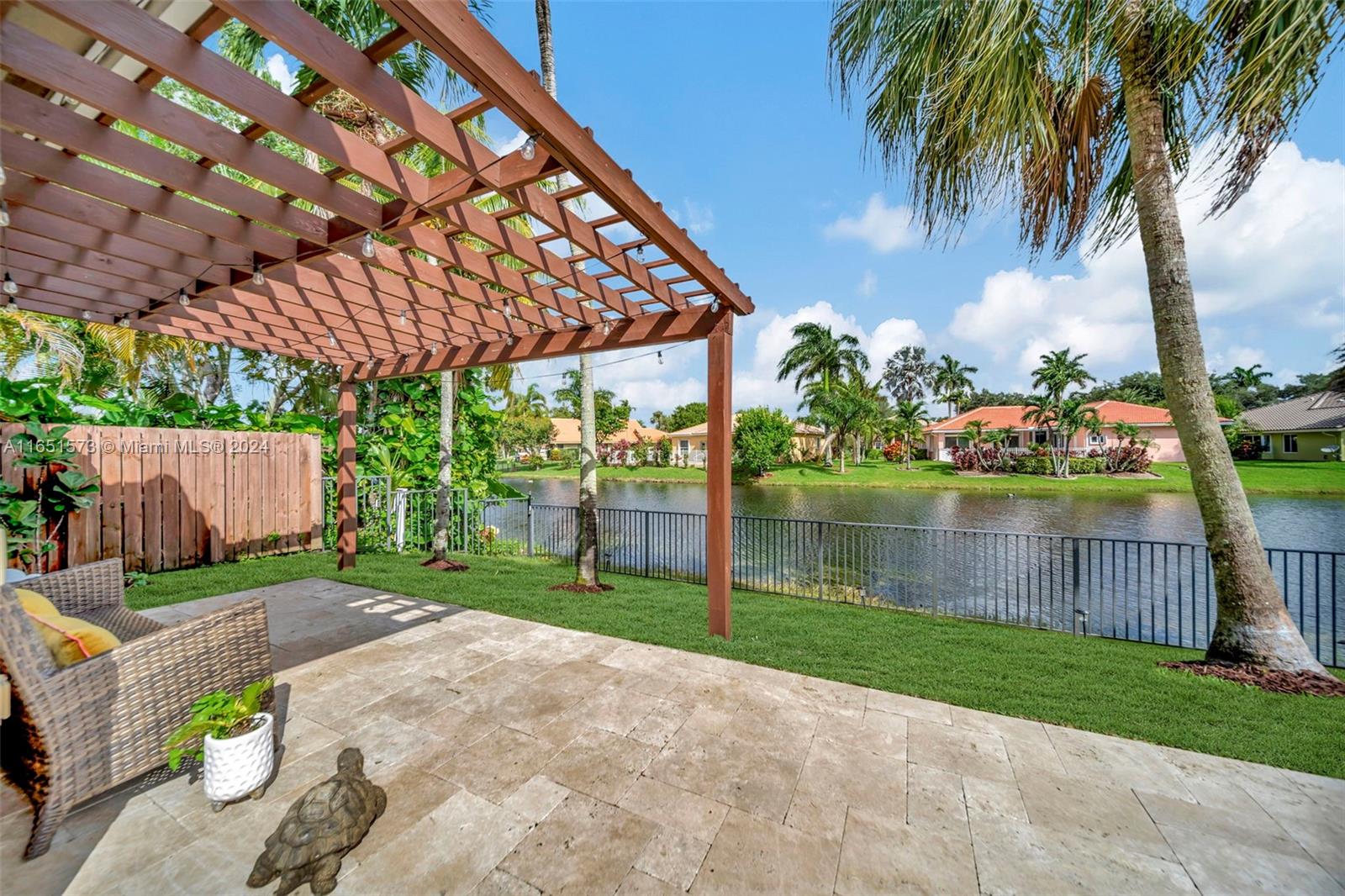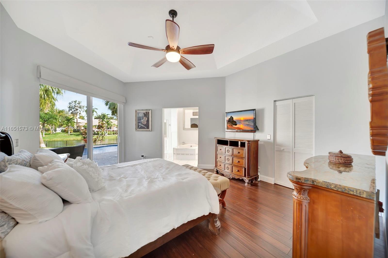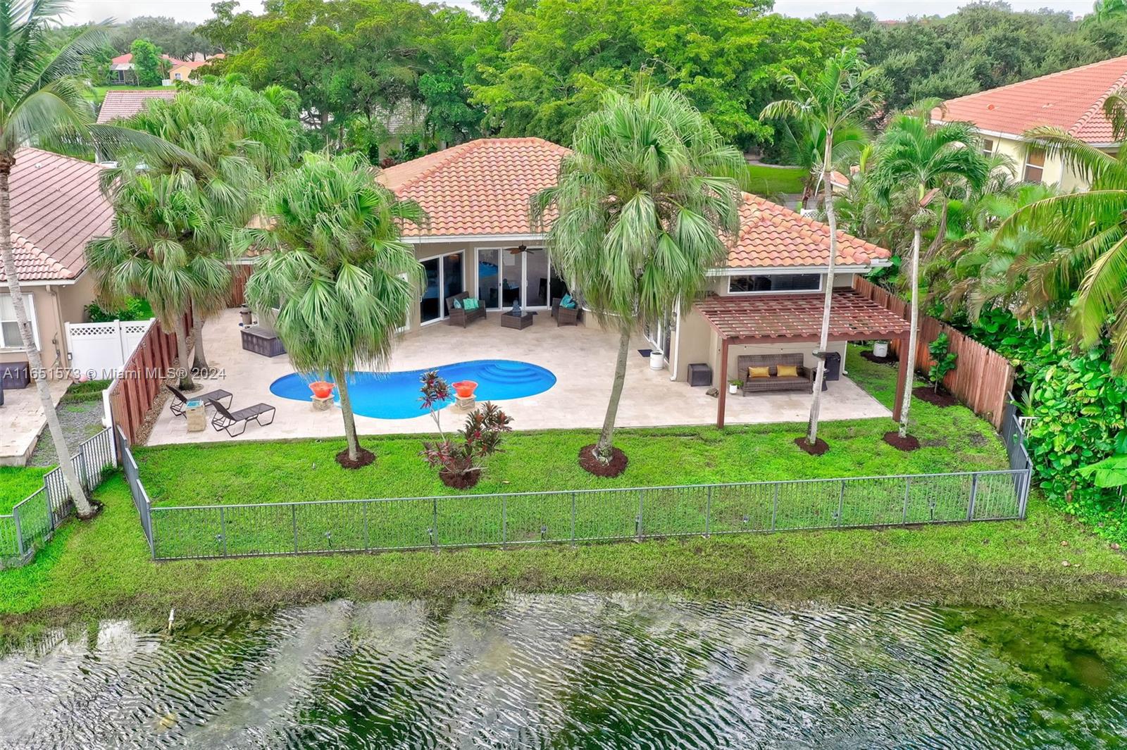 This stunning four-bedroom, two-and-a-half-bath single-family home offers breathtaking views of a serene lake, complemented by a luxurious pool surrounded by elegant travertine pavers. The interior is bathed in natural light, highlighting the elegant bamboo wood & porcelain tile flooring throughout. The chef's dream kitchen is a masterpiece, featuring high-end Thomasville cabinets, sleek quartz countertops, and monogram SS appliances. Every corner of the home showcases thoughtful upgrades such as hurricane impact windows/doors,stacked natural stone wall, new lighting, crown molding adding to its luxurious appeal. With the added benefit of an assumable mortgage at 1.99% and low HOA, this property truly has it all and much more! For a private showing, call TODAY!
