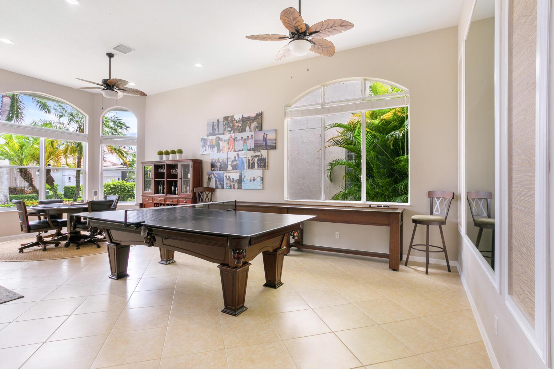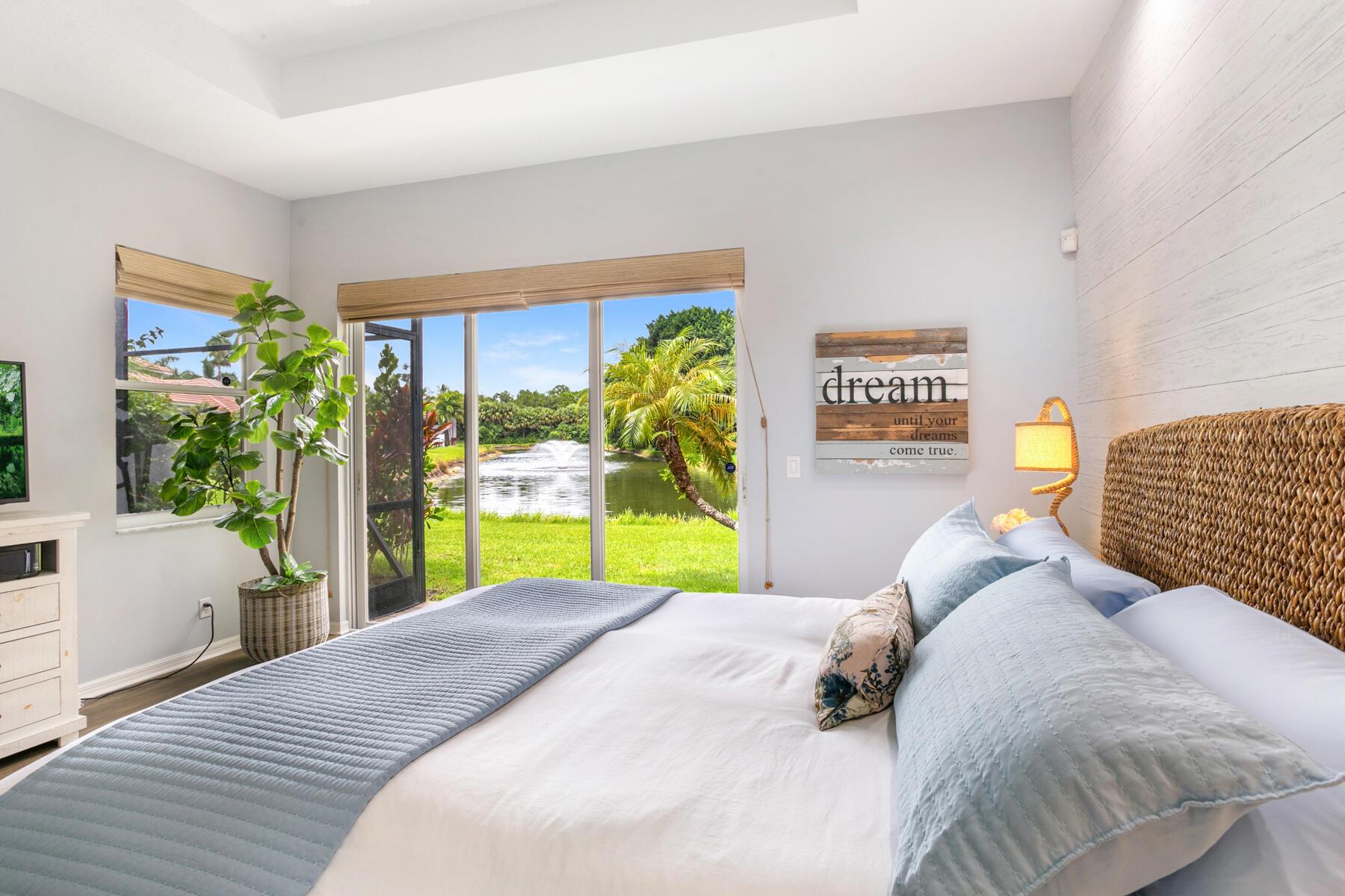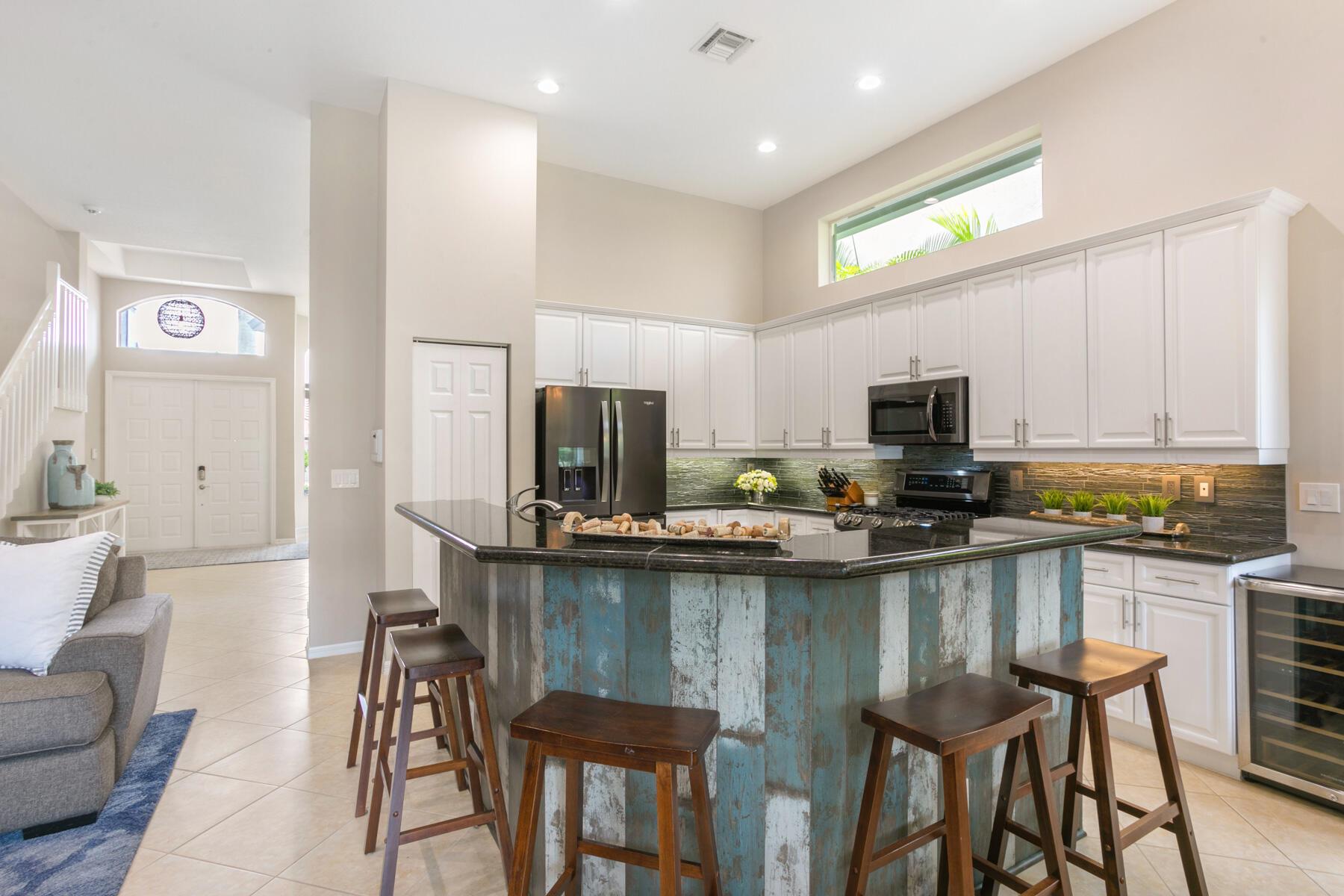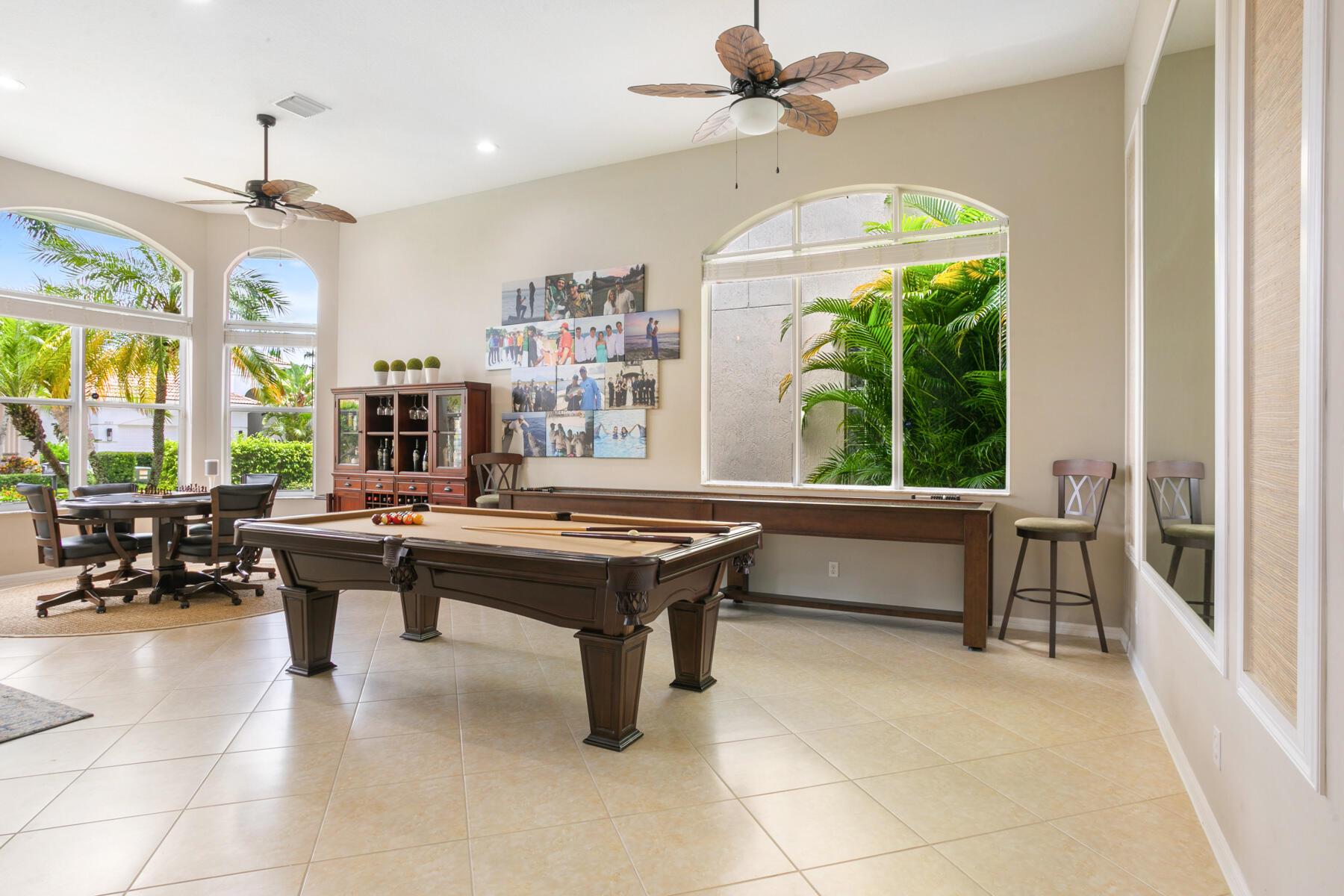 PRIVATE LAKE VIEWS and lush tropical greenery surround this lovely 3BR/2.5BA+Den home. With a NEW ROOF, new gutters and freshly painted exterior in 2024 - the hard work is done for you! Move in and enjoy the Ibis experience in this lovely open floor plan home from day-one! The formal living and dining area has been reimagined as a game room perfect entertaining family and friends. The soaring ceilings, spacious foyer and expansive windows in this area allow this versatile space to easily accommodate a more formal and elegant vibe if desired. The kitchen has newer black stainless appliances, a casual dining space, counter seating and an adjoining family room with plank feature wall. Stacked slider provides a generous opening to access your screened lanai with private spa (cont)