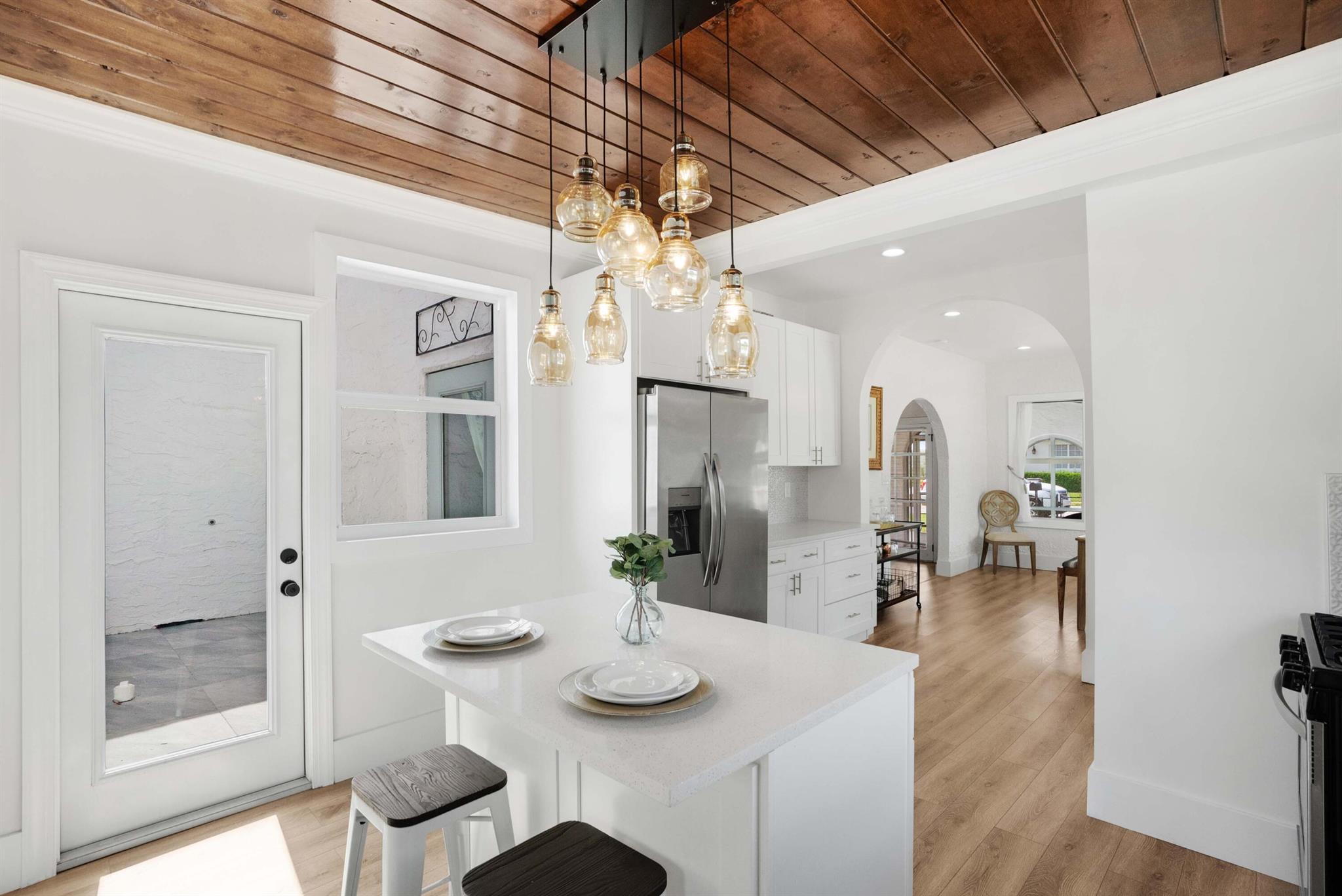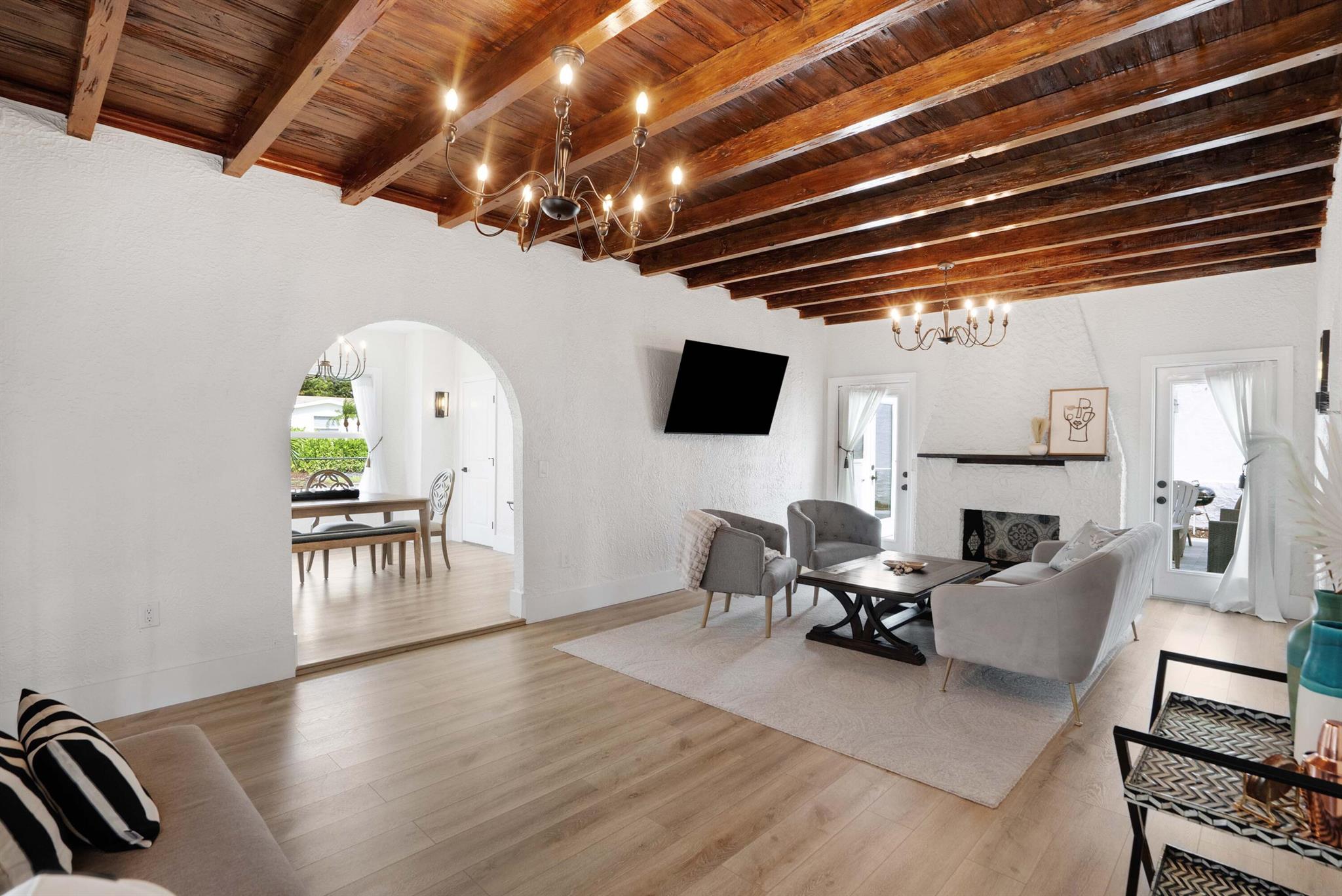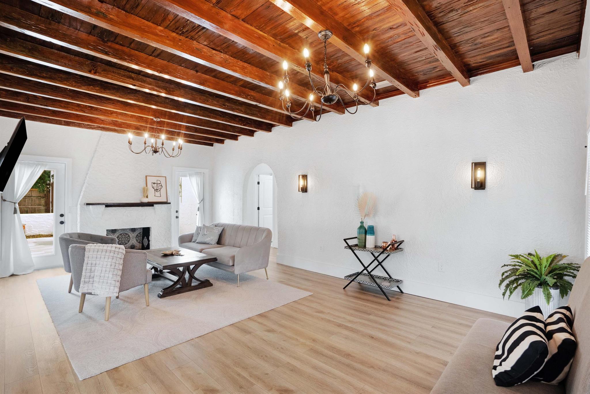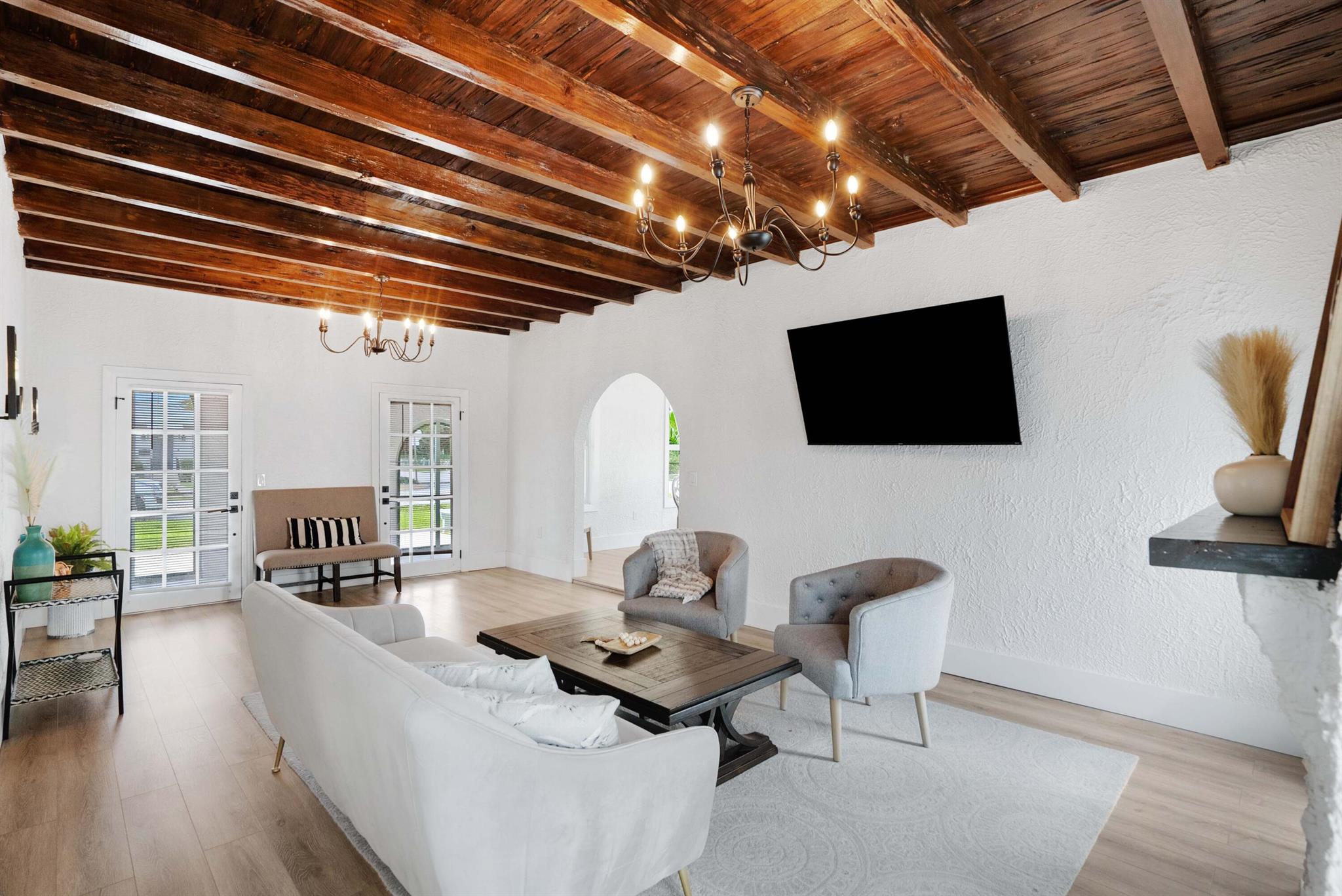 Step into this 1927 West Palm Beach treasure, meticulously renovated to blend historic charm with modern luxury. The home features new plumbing, electrical, A/C systems, and Hurricane Impact Windows and Doors. Situated on a spacious corner lot, it boasts a large courtyard and a garage with electricity, offering potential for a guest suite, creative studio, or home office. Located right off Antique Row in the coveted SoSo neighborhood, one of the hottest areas in West Palm Beach, this home is just minutes from The Park Golf Course, Palm Beach Island, the beach, downtown, and top dining and shopping. Inside, the elegant Pecky Cypress Ceiling complements the expansive living areas, while the kitchen and bathrooms shine with high-end finishes. This gem is waiting for you!