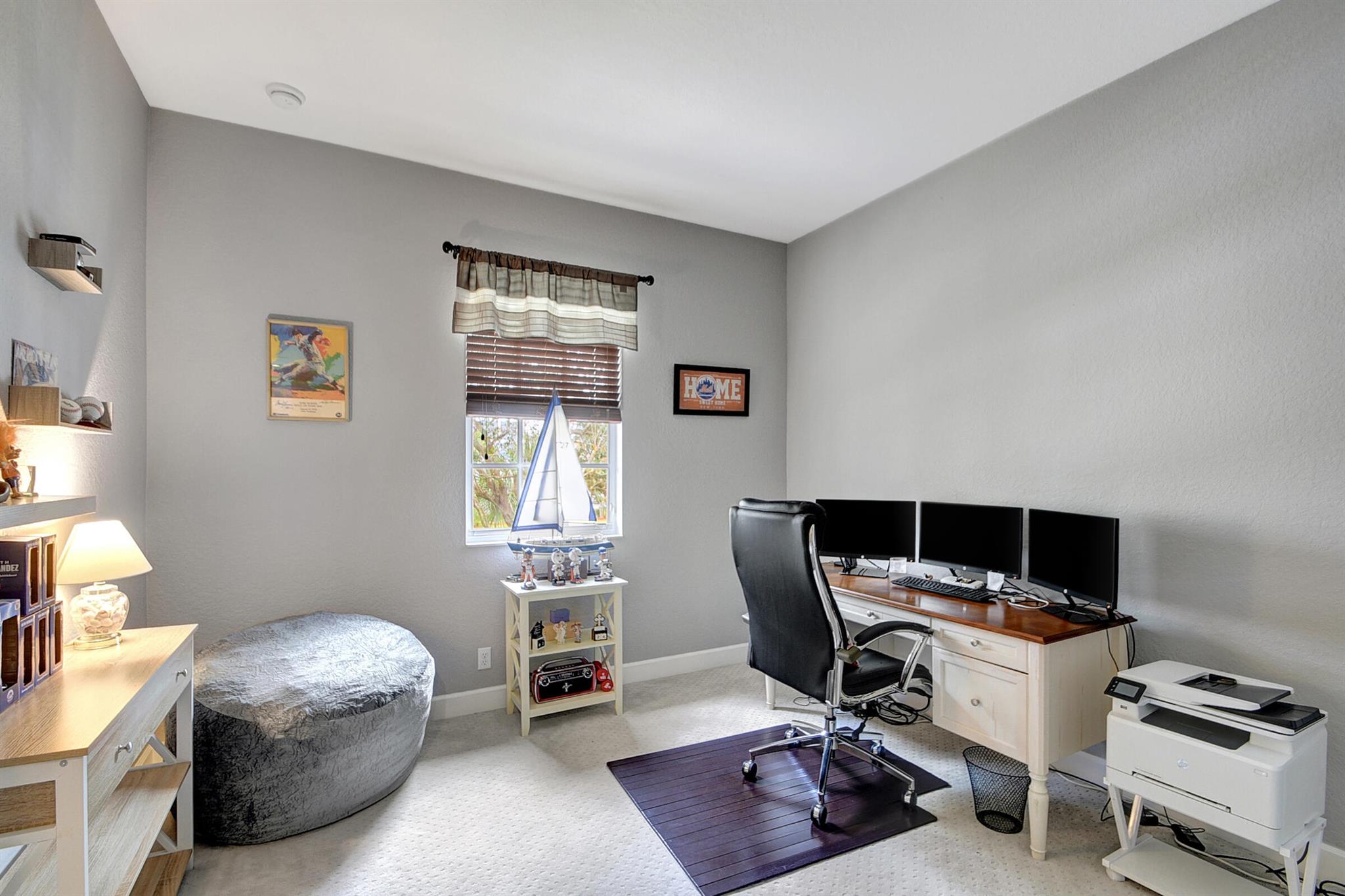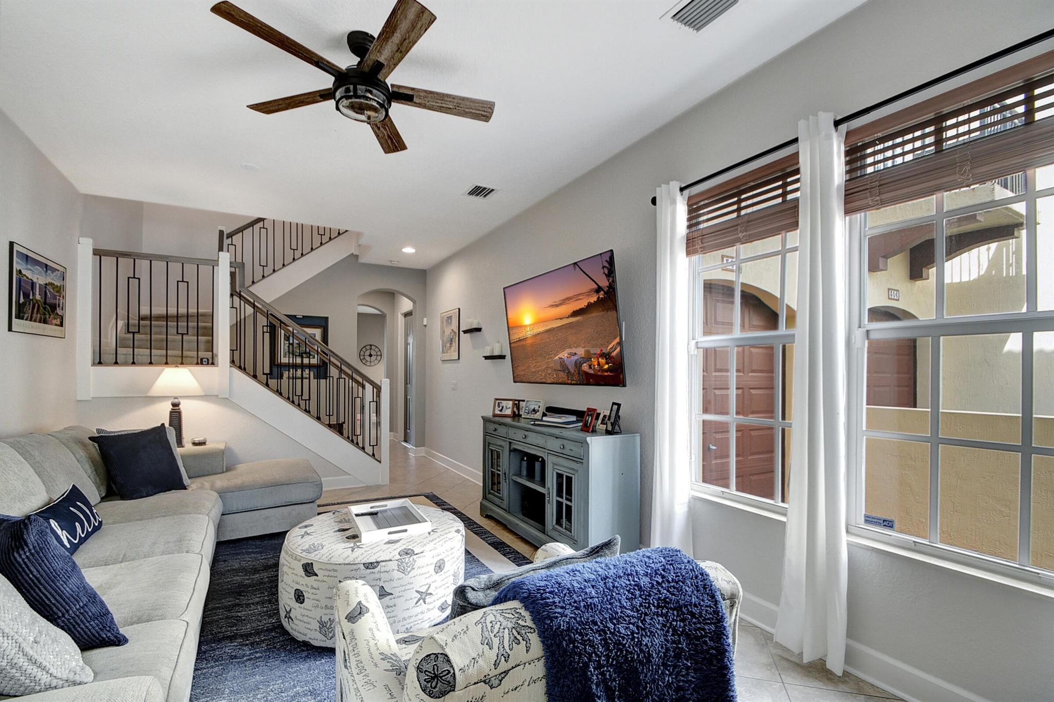 **THE LOW HOA OF 350 PER MONTH INCLUDES ROOF MAINTENANCE, POOL & LANDSCAPING. Immerse yourself in the magnificence of this exceptional 3 bedroom, 2.5 bathroom, 1,900 sq ft townhouse nestled within the secure gated community of Ventura Greens at Emerald Dunes. The unit comes complete with an attached 1 car garage featuring overhead storage, allowing you to efficiently store items without sacrificing parking space. Recently upgraded with new door rollers, a motor, and panels in 2023, the garage ensures both convenience and reliability. Front and back gutters were added in 2023, and the entire unit boasts full impact windows for added safety.