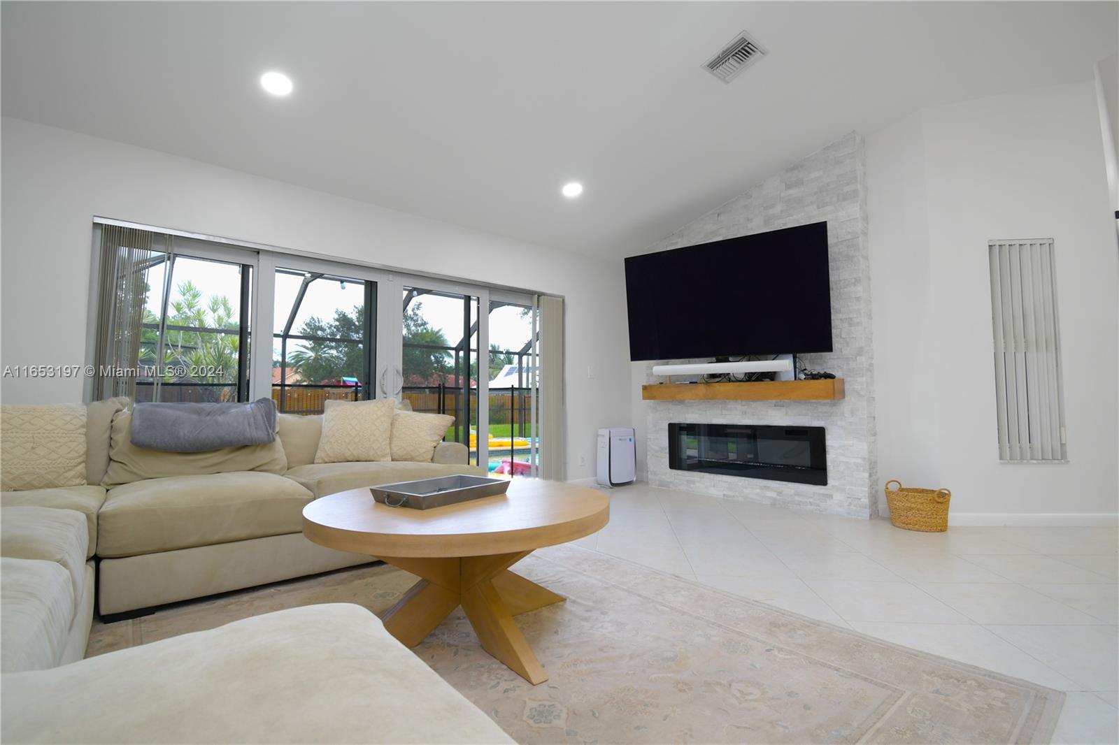 Stunning home situated on a spacious 1/3-acre corner lot on a picturesque street lined with mature oak trees. It boasts exceptional curb appeal with an expansive front lawn, manicured landscaping, a circular driveway, and an elegant double-glass door entry. Enjoy direct views of the beautiful pool area. The interior features volume ceilings, impact glass windows and doors, and recently installed vinyl flooring. Ideal for indoor/outdoor living and entertaining. The large kitchen and family room offer new stainless steel appliances, granite countertops, a pantry, and a bright breakfast area. The exterior features a large screened porch with a solar-heated pool, a renovated primary bathroom, impact windows and doors, a Leaf Filter gutter system, and a newly installed perimeter fence.