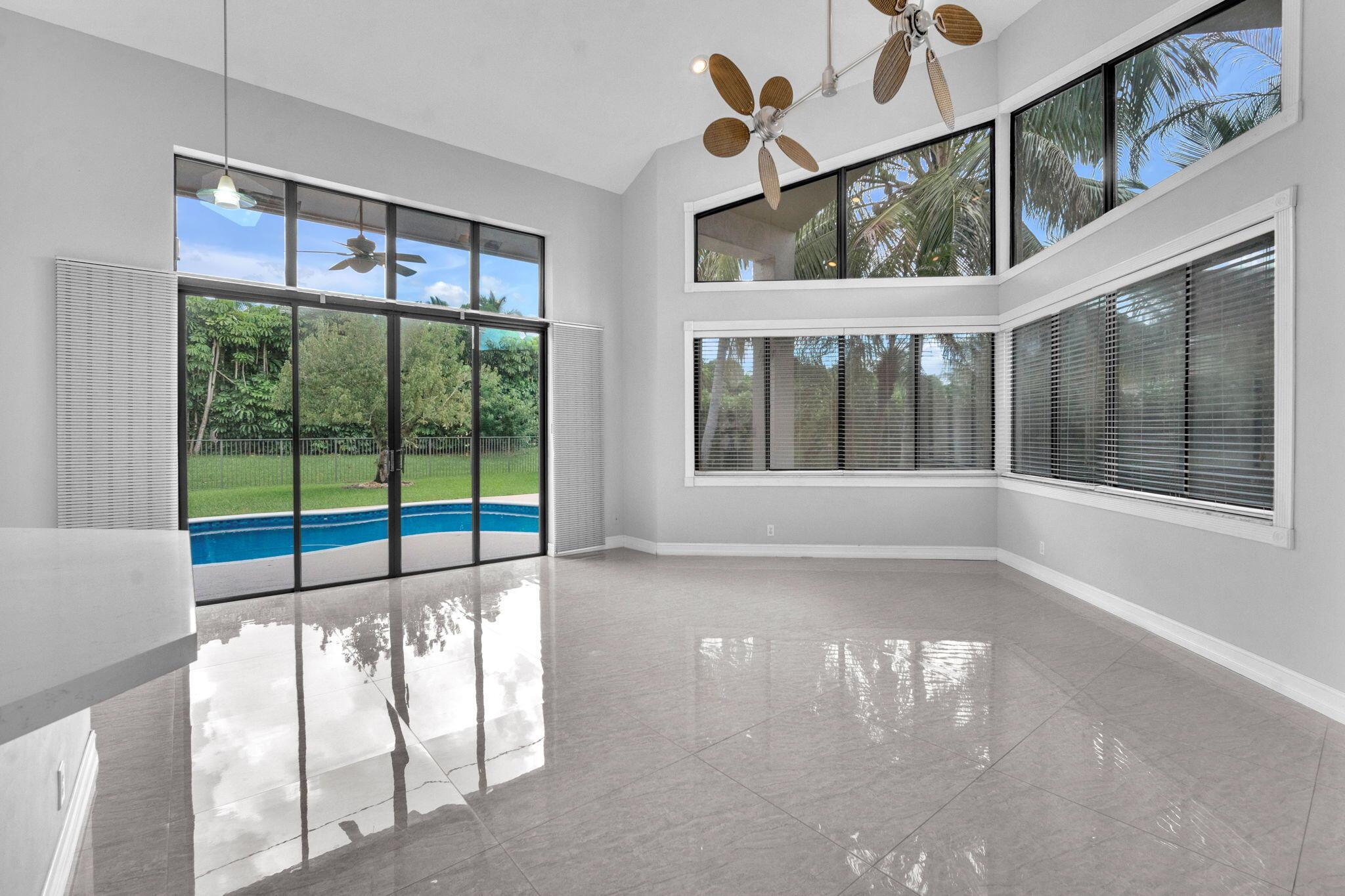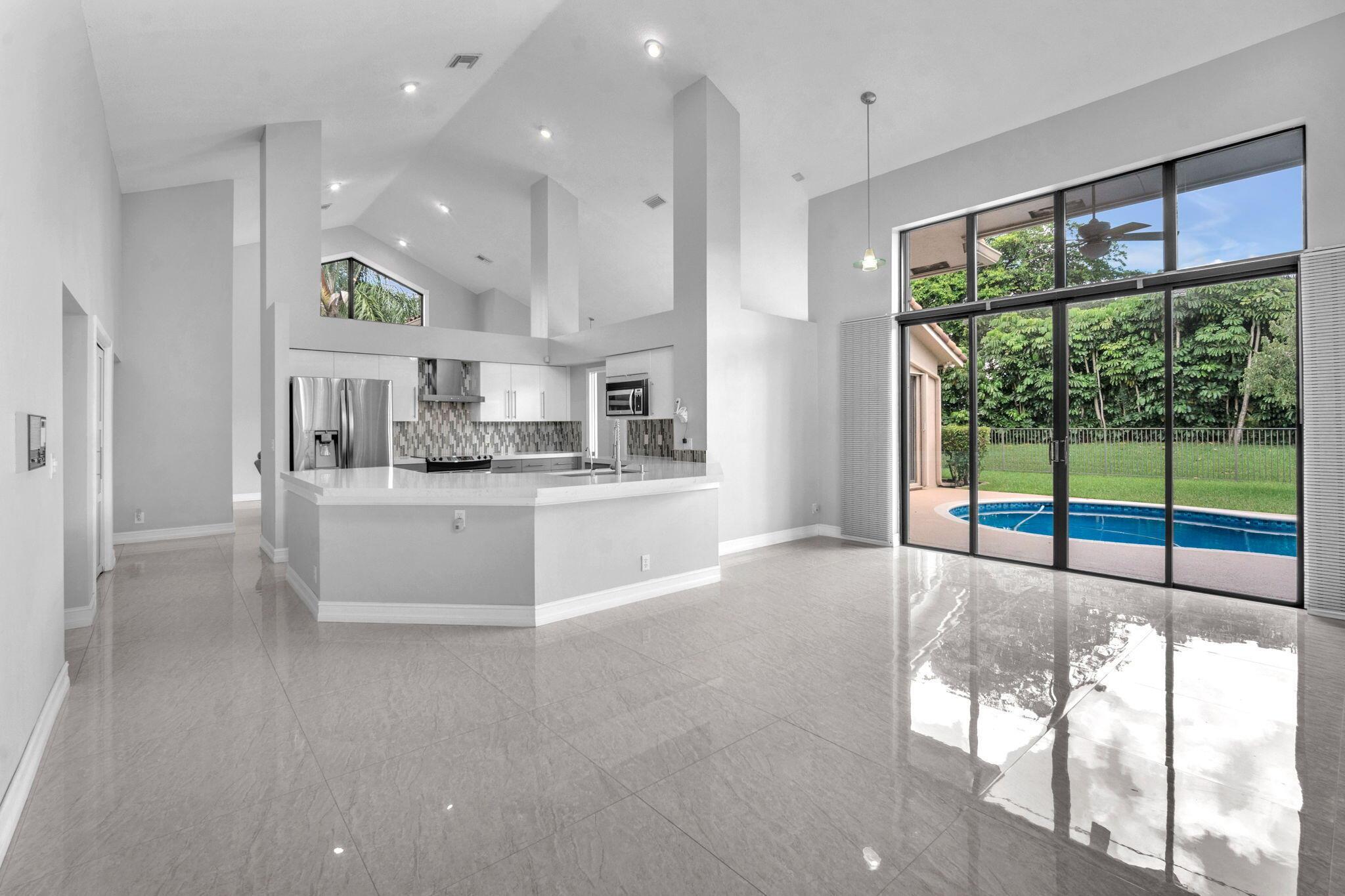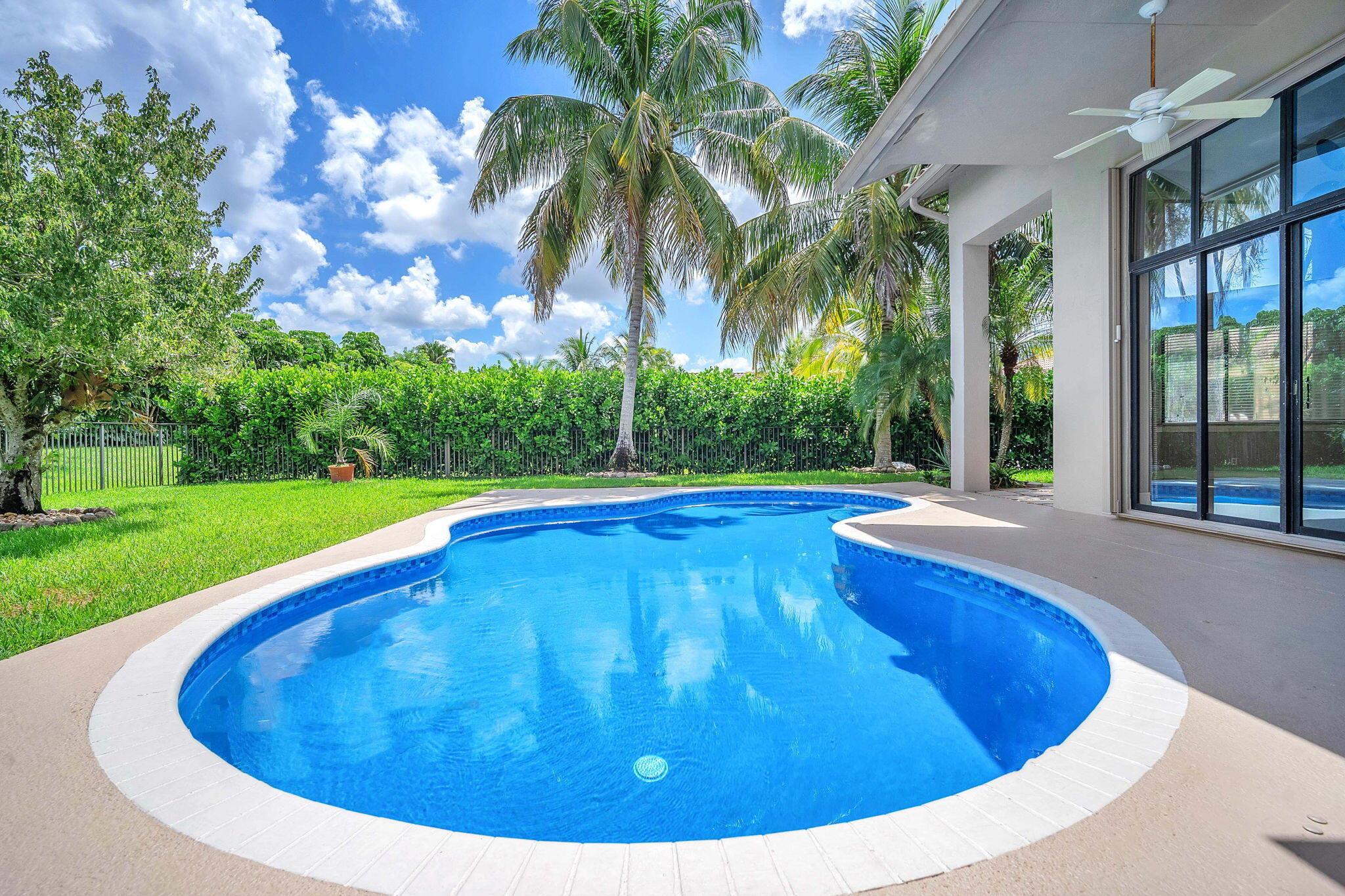 Discover Tequesta, Weston's best-kept secret, nestled next to Peace Mound Park in a guard-gated community. This stunning 4-bedroom, 3-bathroom home sits on a tranquil 1/3-acre lot at the end of a cul-de-sac. The property features a circular driveway, an oversized 2-car garage, a private pool, and a fully fenced backyard.Step inside to a split floorplan with 17-foot high ceilings and spacious common areas adorned with 32x32 porcelain tile. The bedrooms feature laminate wood flooring for a warm and inviting feel. The elegant living and dining rooms lead to a gourmet kitchen equipped with stainless steel appliances, oversized quartz countertops, and lacquered Italian-style cabinets. The expansive family room, complete with a dual-head ceiling fan and breakfast area, is perfect for
