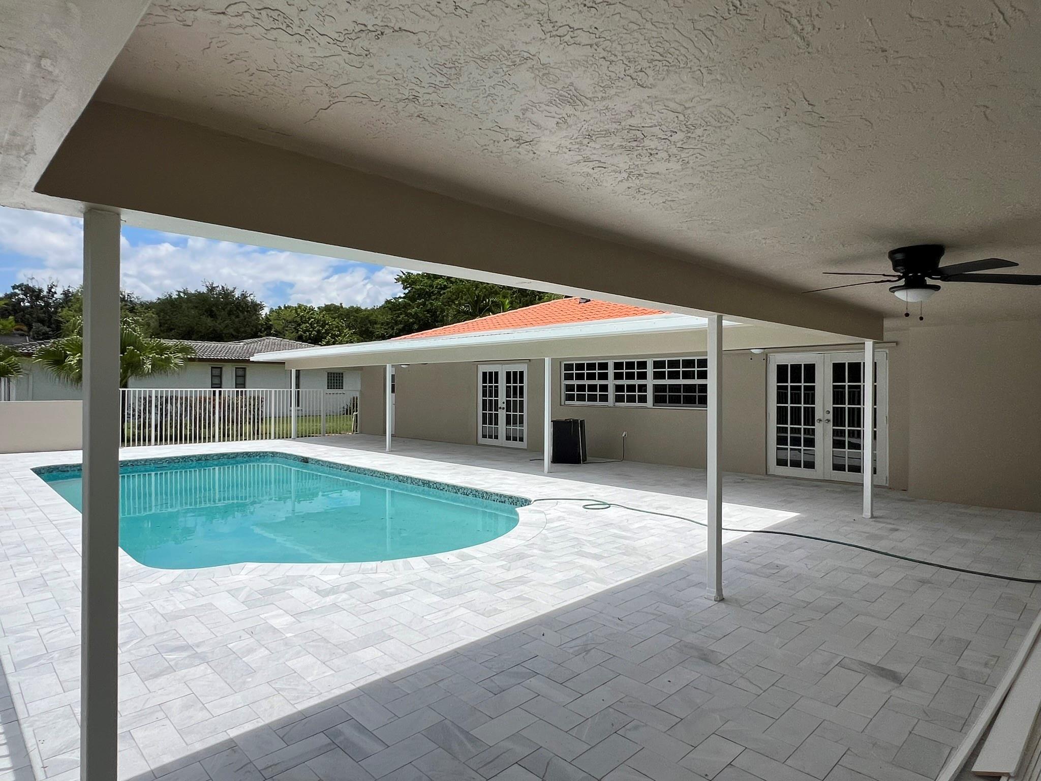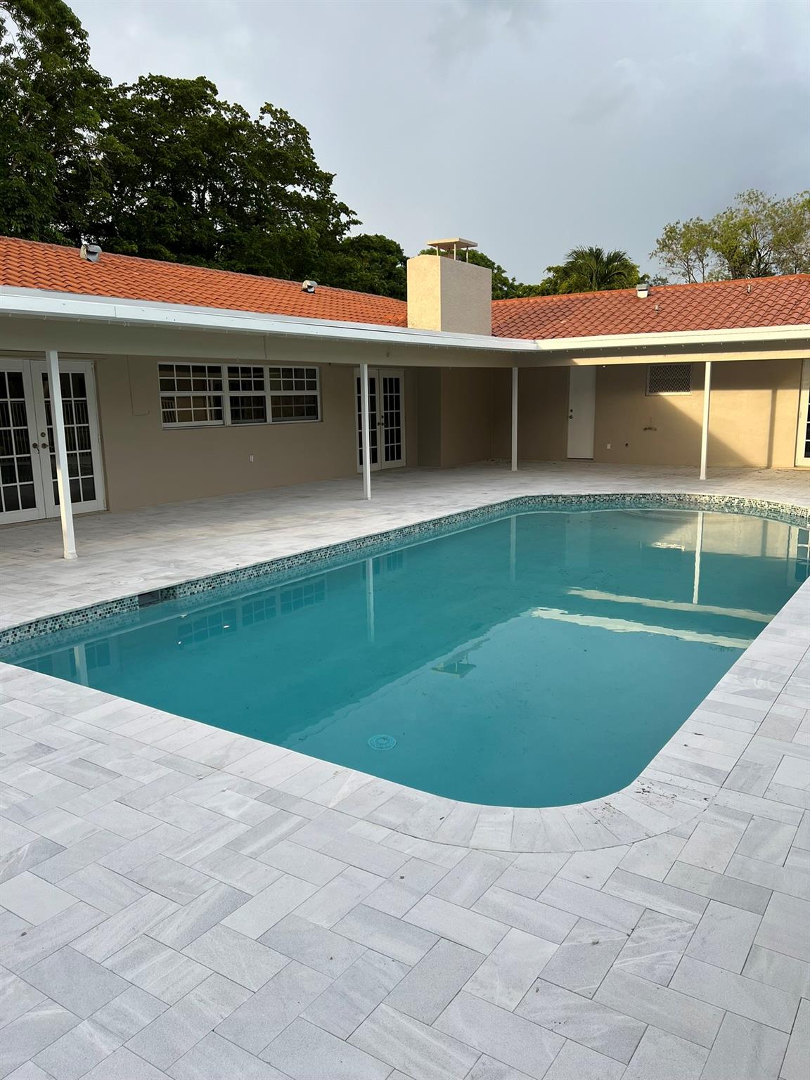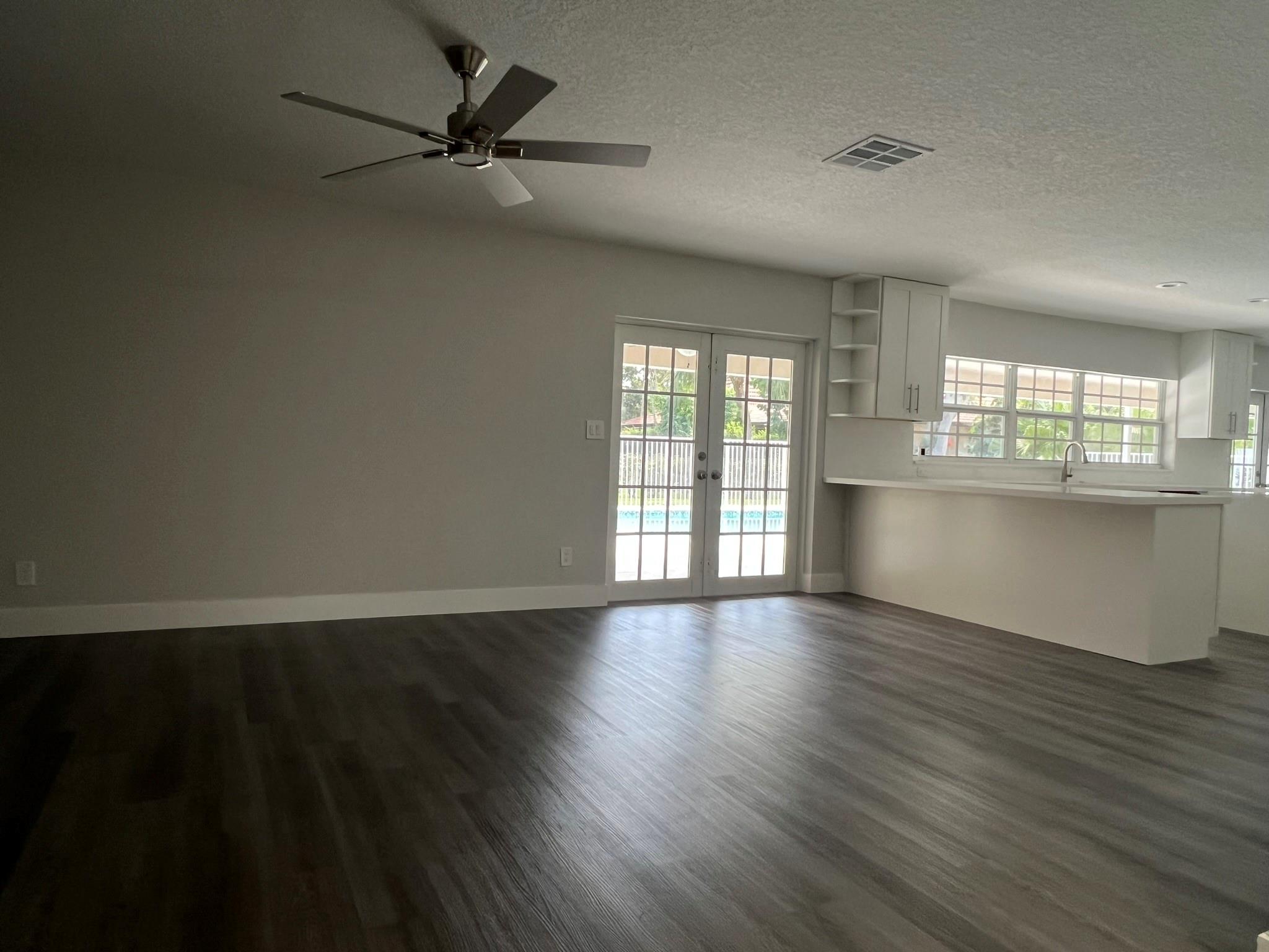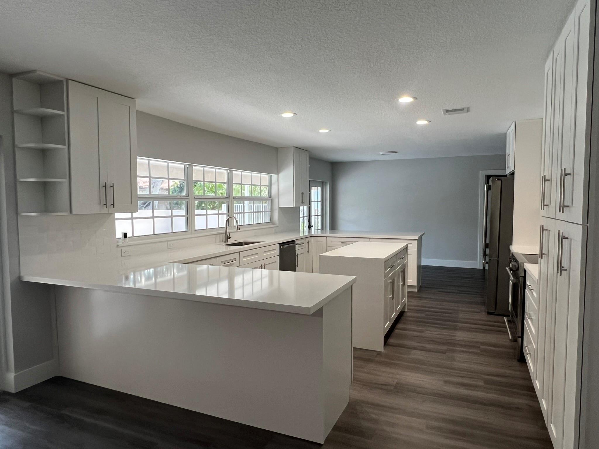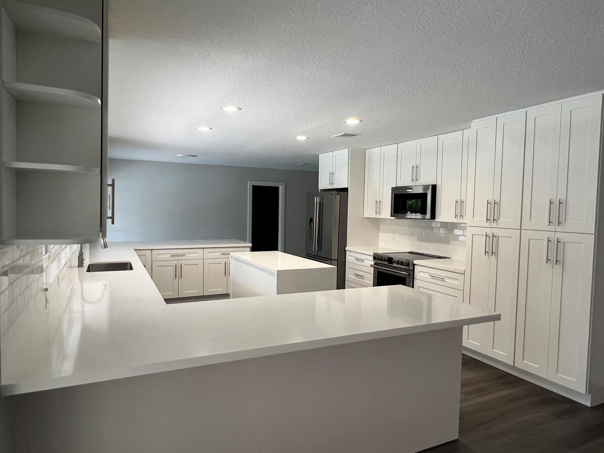 This stunning home features modern 42-inch white shaker cabinets, quartz countertops with a spacious island, and new stainless steel appliances. The updated bathrooms mirror the kitchen's style with shaker cabinets and quartz counters. The layout includes new vinyl wood flooring, 4 large bedrooms, and 3 bathrooms, with potential for two additional bedrooms—perfect for an executive lifestyle. Situated on an oversized lot, this property offers privacy and outdoor space. The split bedroom plan provides a peaceful retreat, while the family room is great for gatherings. The pool and open patio feature travertine tile, perfect for relaxation. A large interior laundry room adds convenience. The property also includes lush landscaping, impact windows, and a durable 15-year-new barrel-tiled roof.