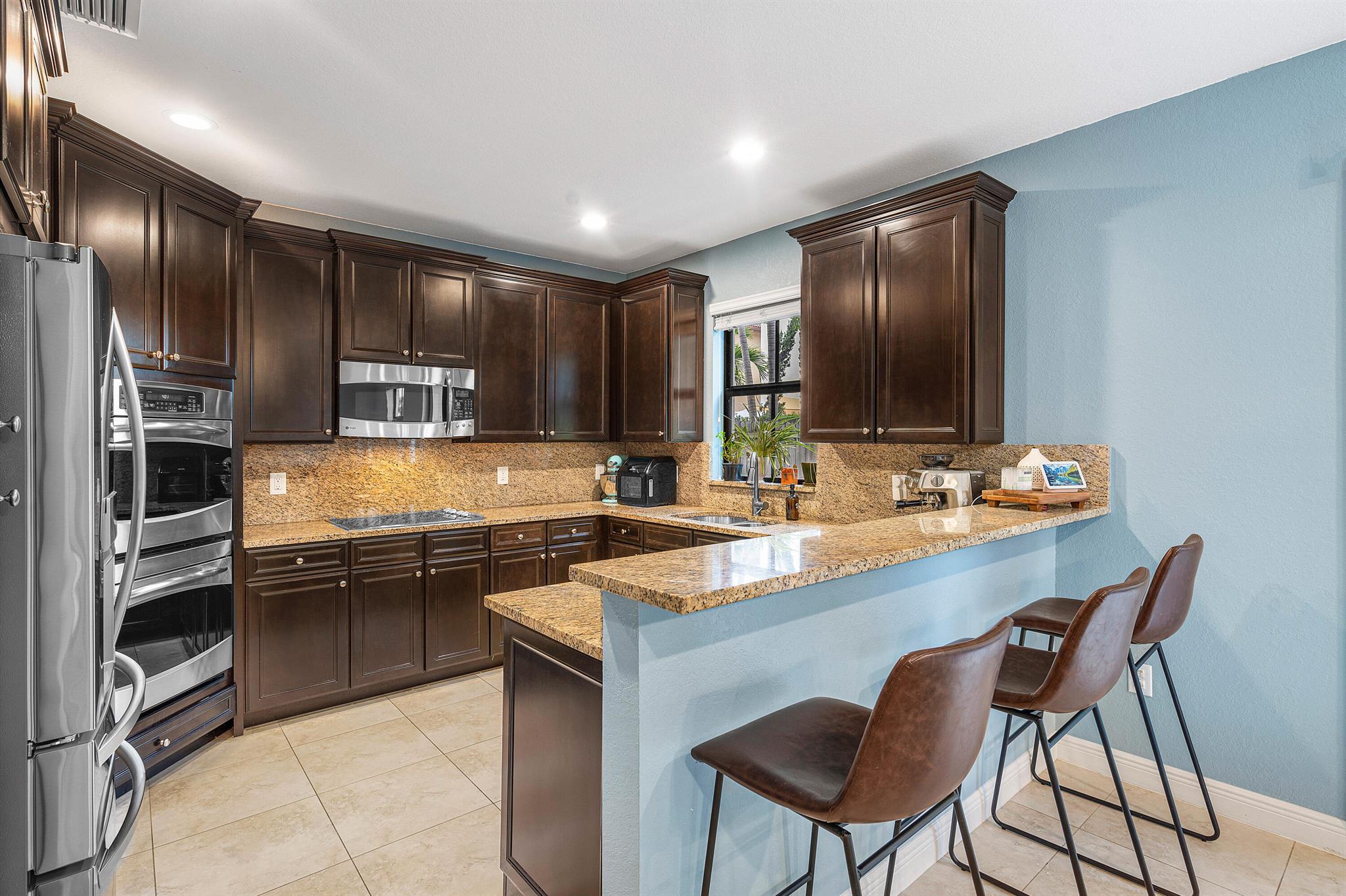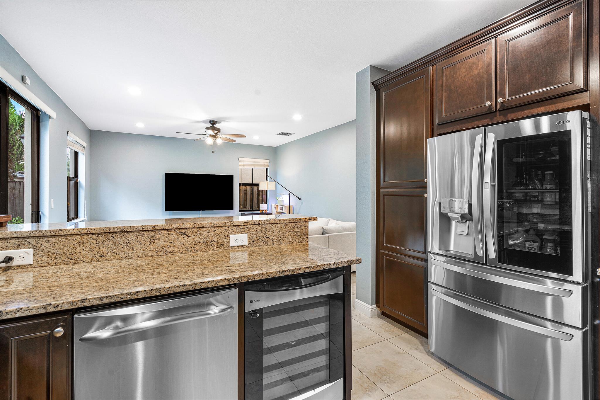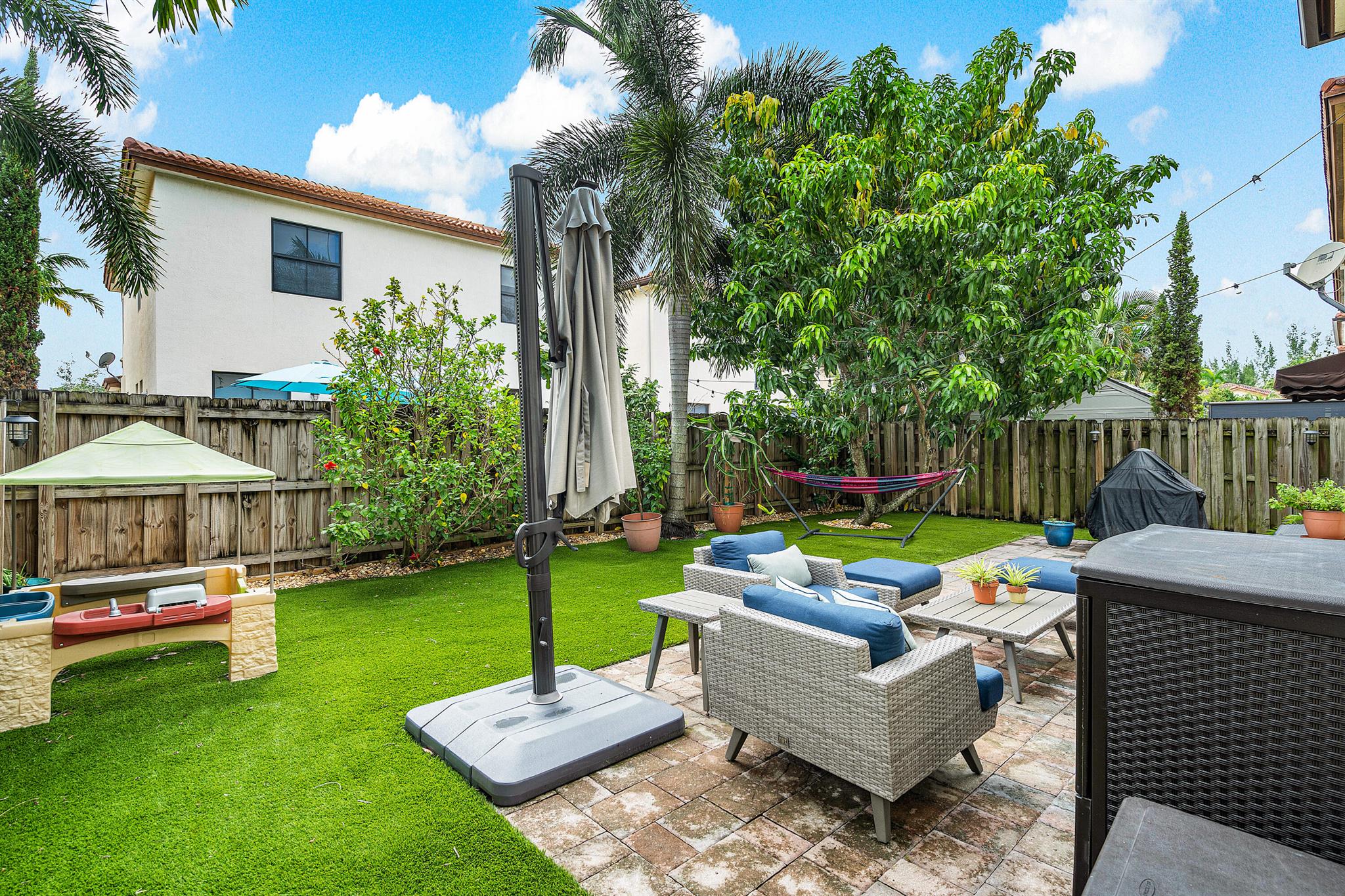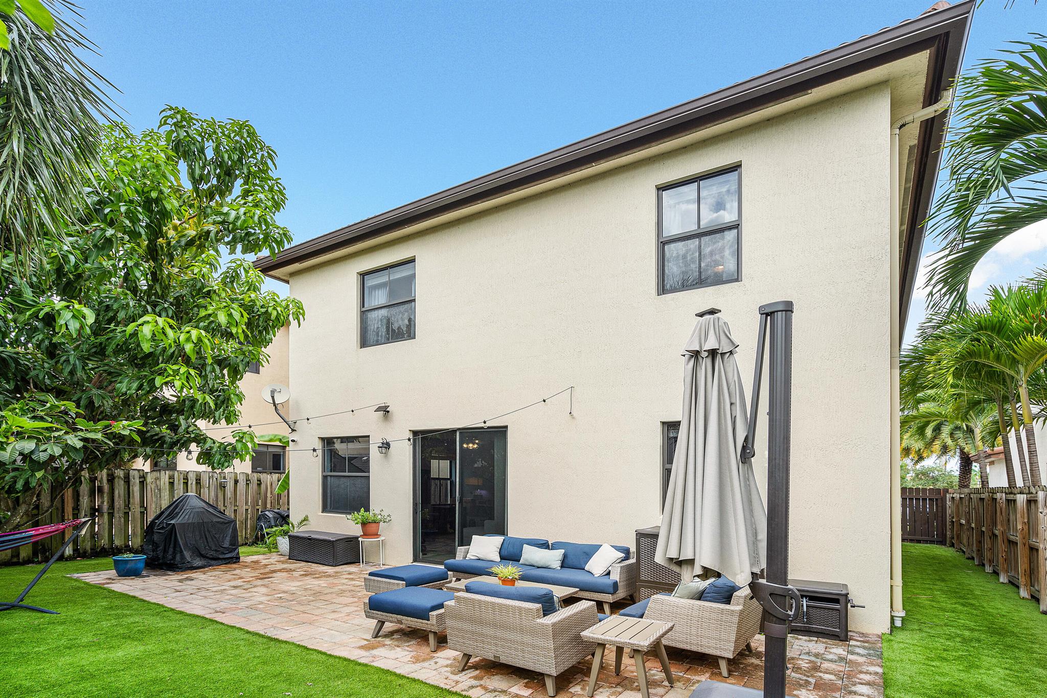 Spacious 4 bedrooms, 3 full bath home available in the highly desired Isles at Grand Bay Estates in Doral. This home has impact windows, updated washer/dryer (2022), refrigerator (2023), stainless steel appliances, double oven, wine cooler fridge, pantry, jacuzzi/spa tub and more. Fully fenced backyard features fruit trees, artificial grass for easy maintenance, solar patio lights, rain gutters and 2 French drains, ceiling storage added in garage. Home is set up for ADT Security, has Google cameras/doorbell and thermostat. Grand Bay's beautiful gated community has 24 hr. security with an onsite community park and additional access to Park Central Doral's resort-style amenities. Located near parks, schools, shopping, restaurants and major highways.