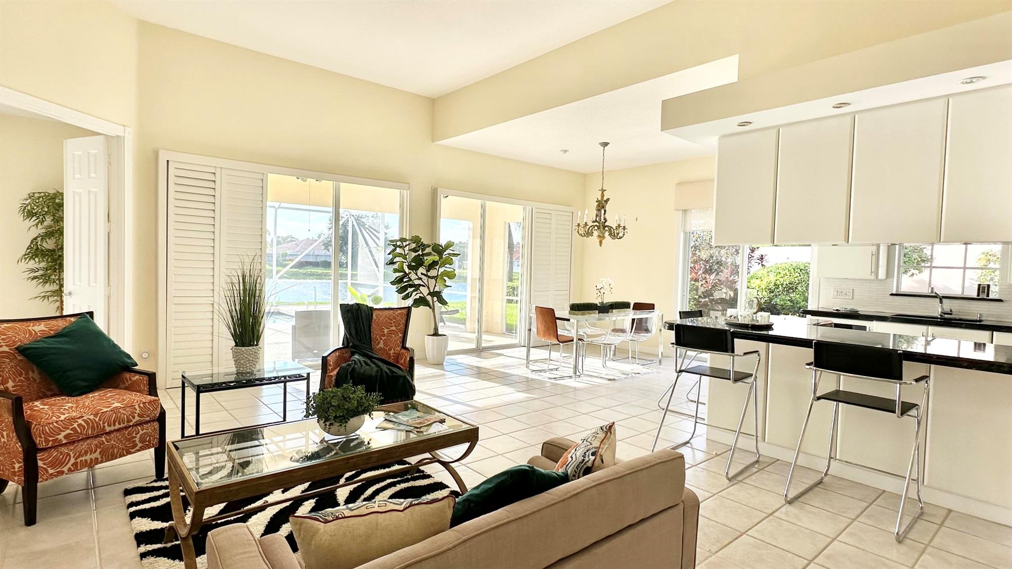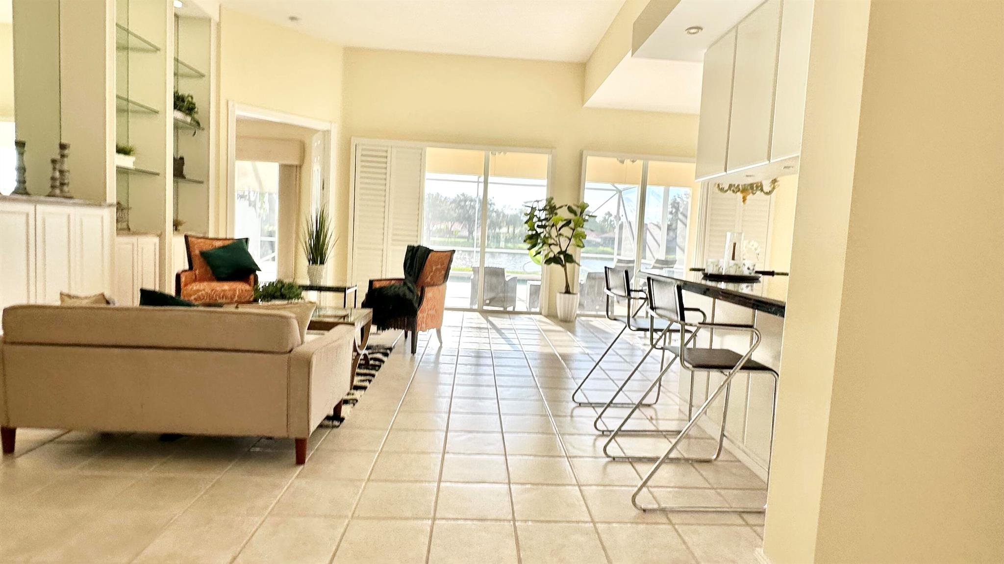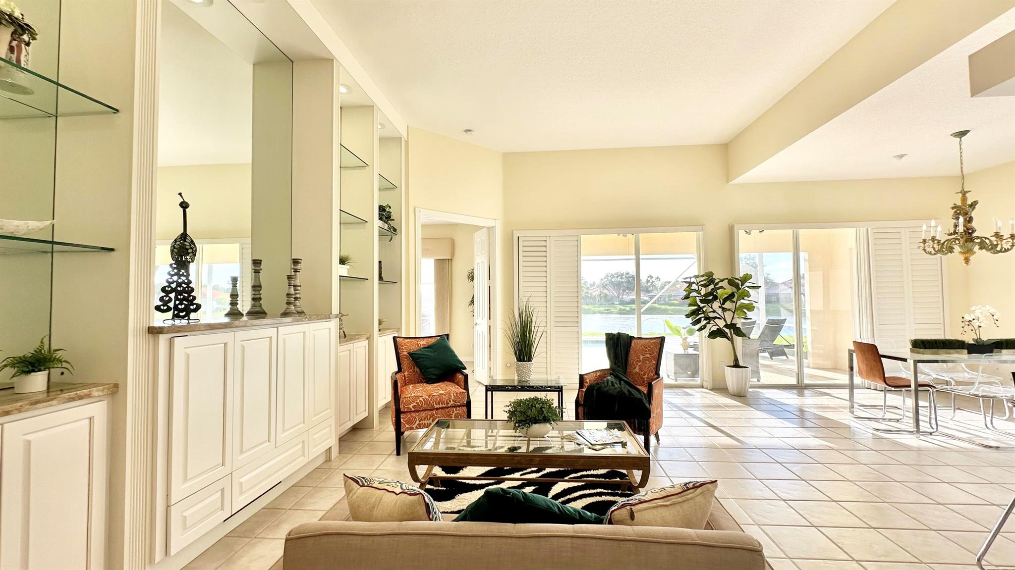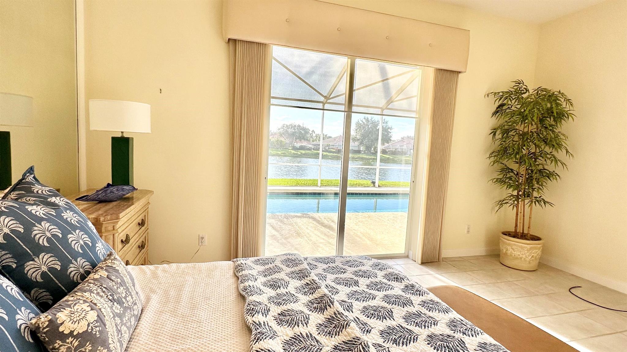 Step in to your dream home!! Laze away the day floating in the pool watching the sun set overlooking a spectacular lake view with nothing but water and bridges in immediate sight ... and even more... NEW ROOF 2022.. whole house inground Generac Generator... wide oversized lot... tiled flooring throughout, roll down and accordion shutters... renovated kitchen with streamline cabinets, wine cooler, unique marble counters and SUB ZERO refrigerator! The Great Room features a customized built in wall unit with marble ledges, plantation shutters, 12 ft volume ceilings. The principal bedroom has plantation shutters, an abundance of closet space, a unique dual bathroom arrangement with large walk in shower accessible from two sides, Roman Tub and two separate vanities.
