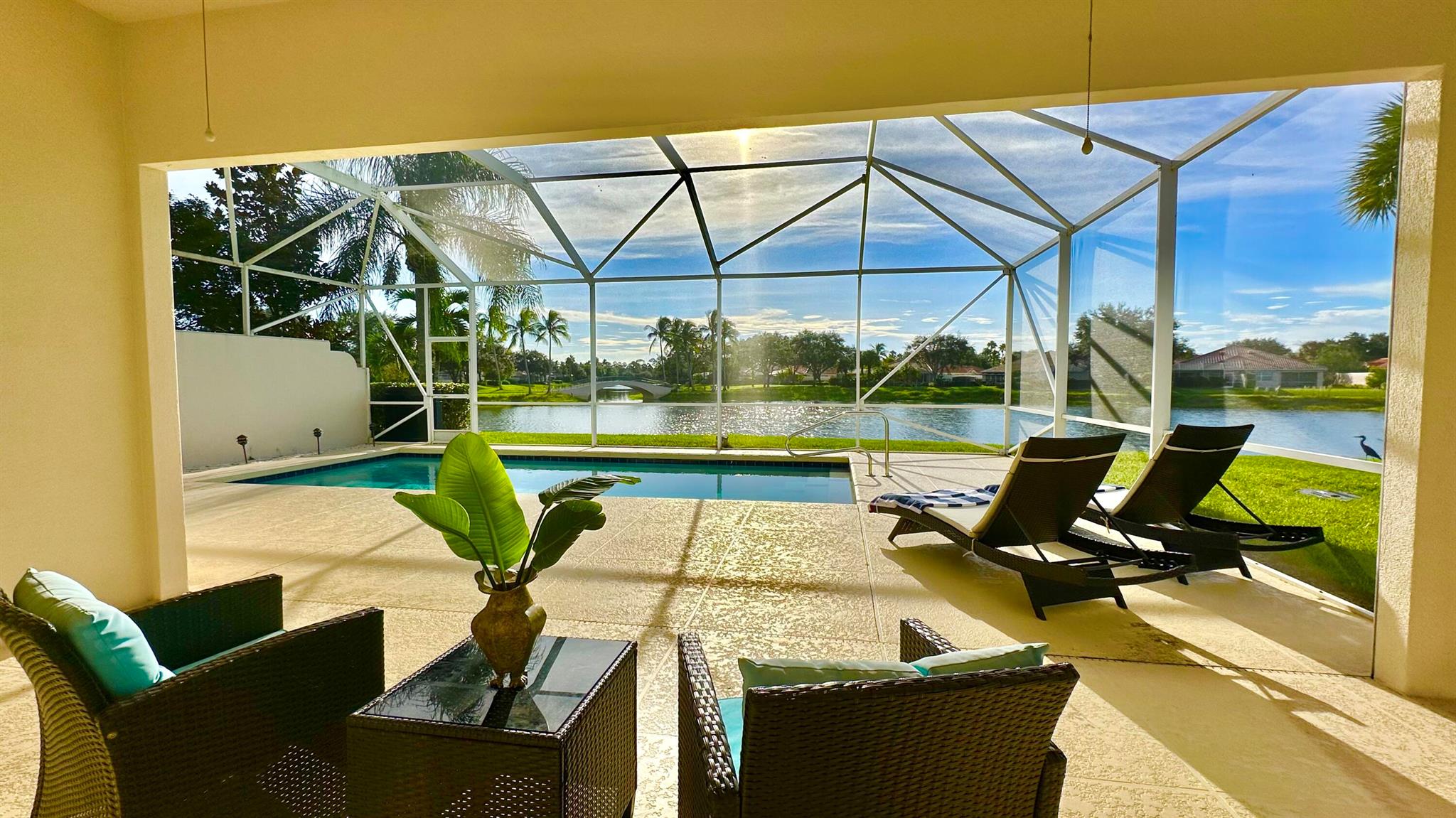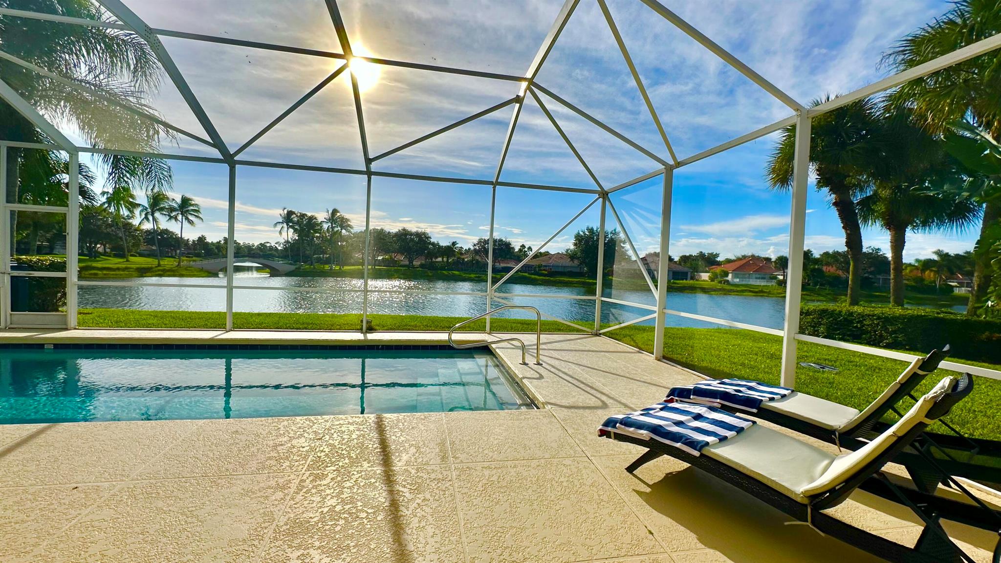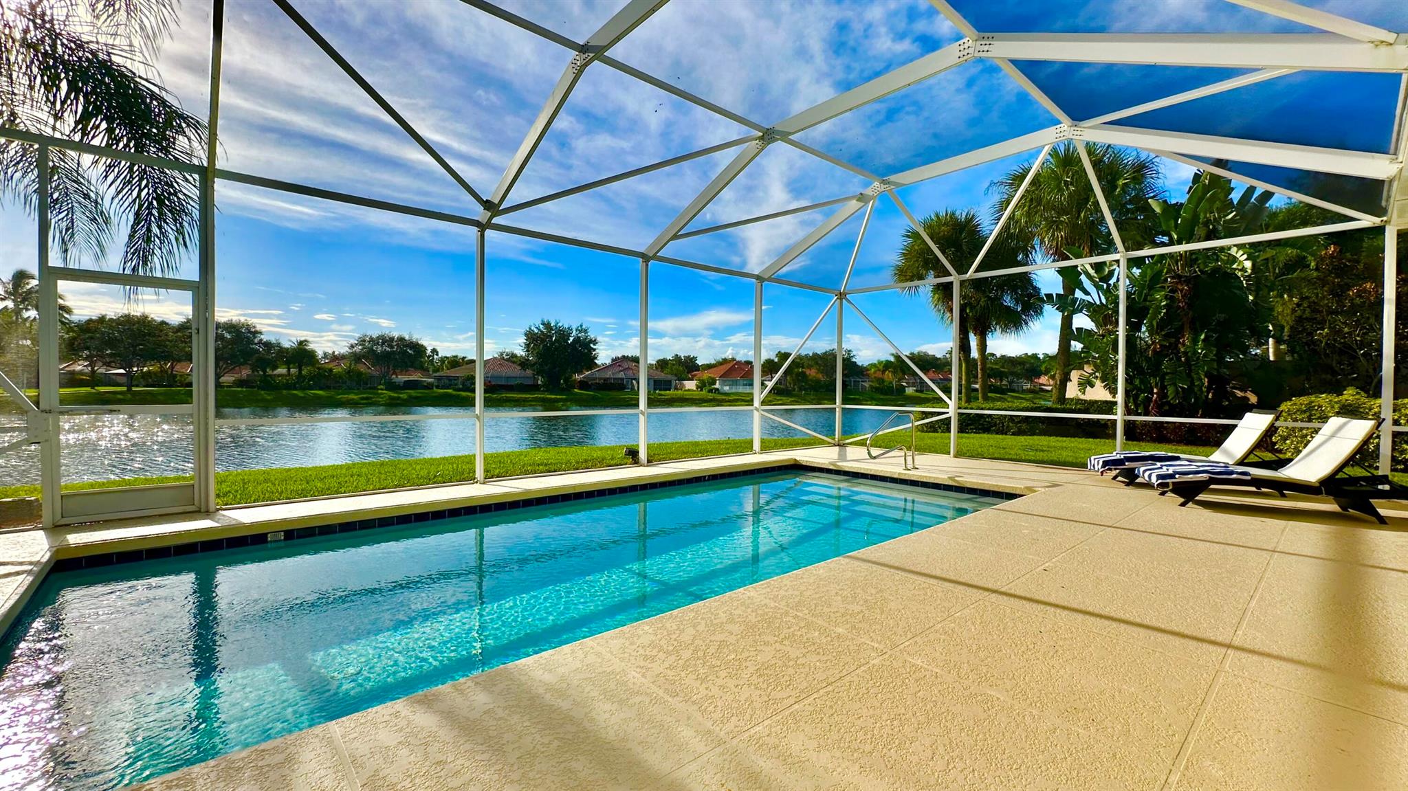 Step in to your dream home!! Laze away the day floating in the pool watching the sun set overlooking a spectacular lake view with nothing but water and bridges in immediate sight ... and even more... NEW ROOF 2022.. whole house inground Generac Generator... wide oversized lot... tiled flooring throughout, roll down and accordion shutters... renovated kitchen with streamline cabinets, wine cooler, unique marble counters and SUB ZERO refrigerator! The Great Room features a customized built in wall unit with marble ledges, plantation shutters, 12 ft volume ceilings. The principal bedroom has plantation shutters, an abundance of closet space, a unique dual bathroom arrangement with large walk in shower accessible from two sides, Roman Tub and two separate vanities.