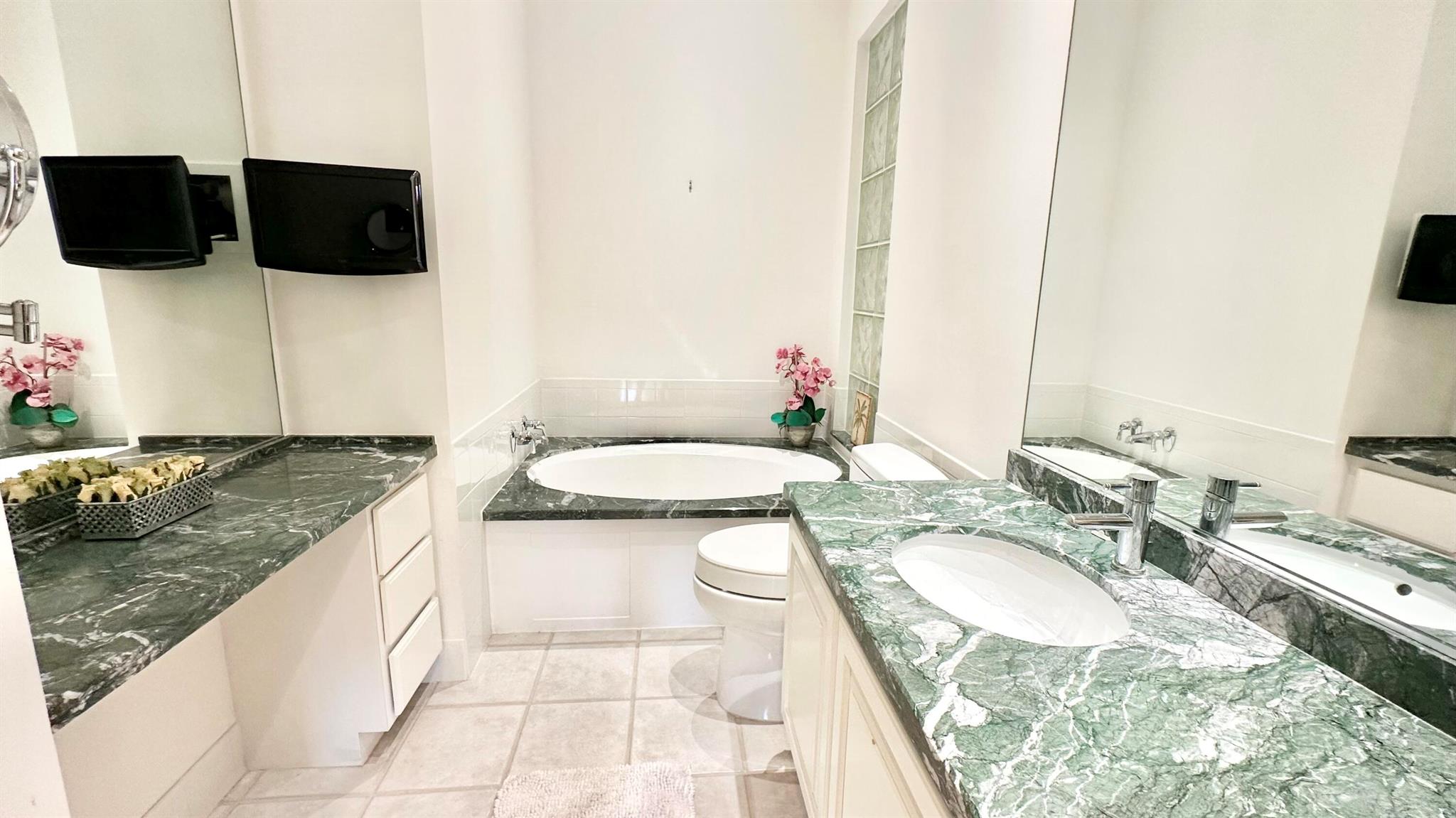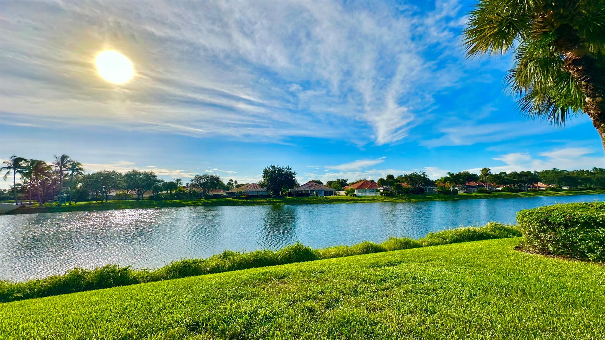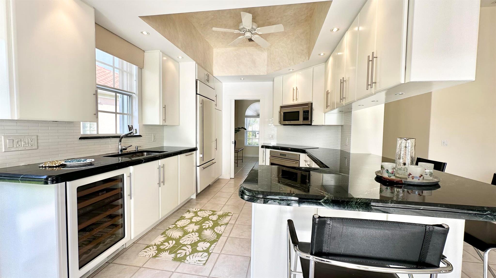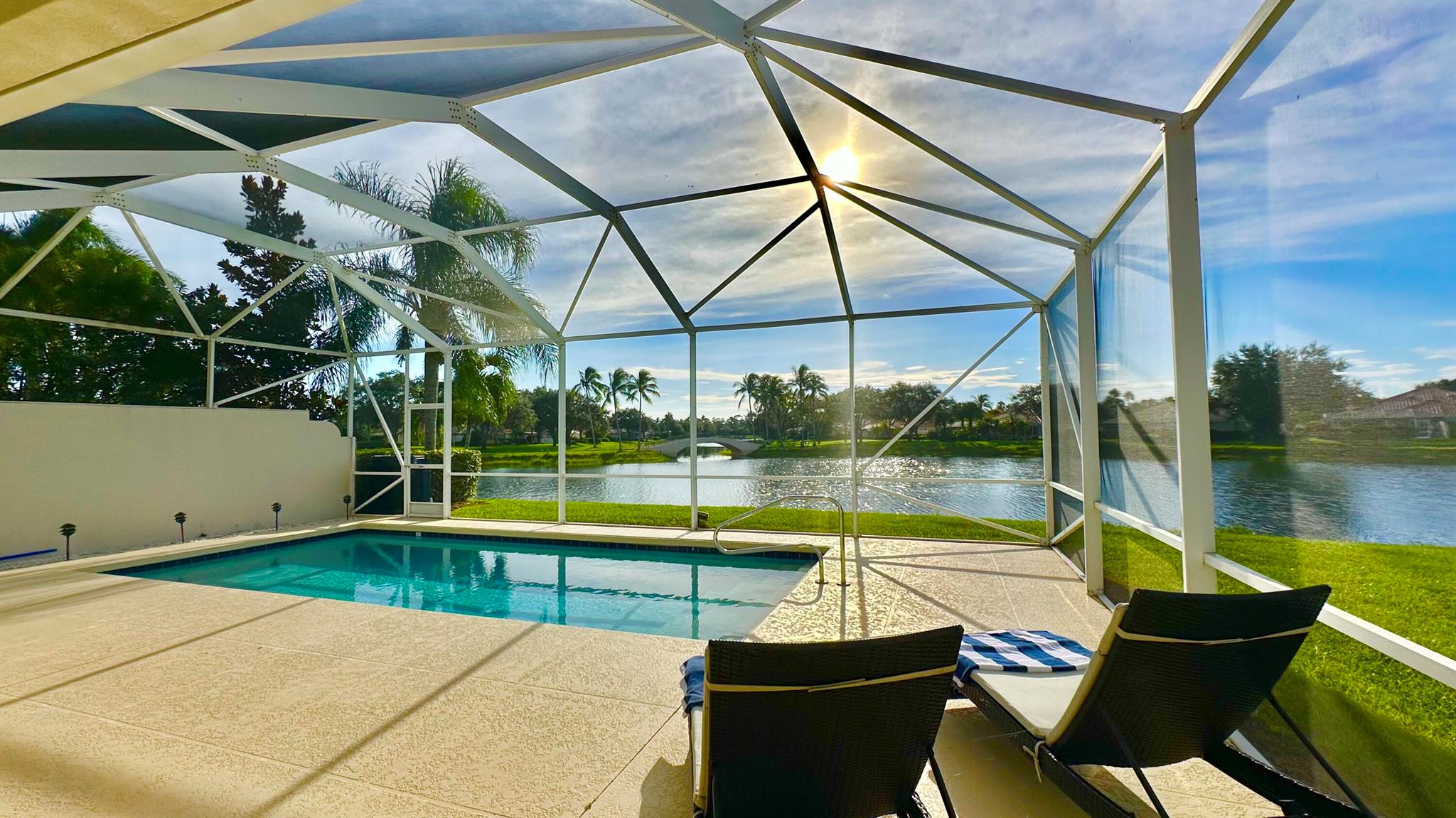 Step in to your dream home!! Laze away the day floating in the pool watching the sun set overlooking a spectacular lake view with nothing but water and bridges in immediate sight ... and even more... NEW ROOF 2022.. whole house inground Generac Generator... wide oversized lot... tiled flooring throughout, roll down and accordion shutters... renovated kitchen with streamline cabinets, wine cooler, unique marble counters and SUB ZERO refrigerator! The Great Room features a customized built in wall unit with marble ledges, plantation shutters, 12 ft volume ceilings. The principal bedroom has plantation shutters, an abundance of closet space, a unique dual bathroom arrangement with large walk in shower accessible from two sides, Roman Tub and two separate vanities.