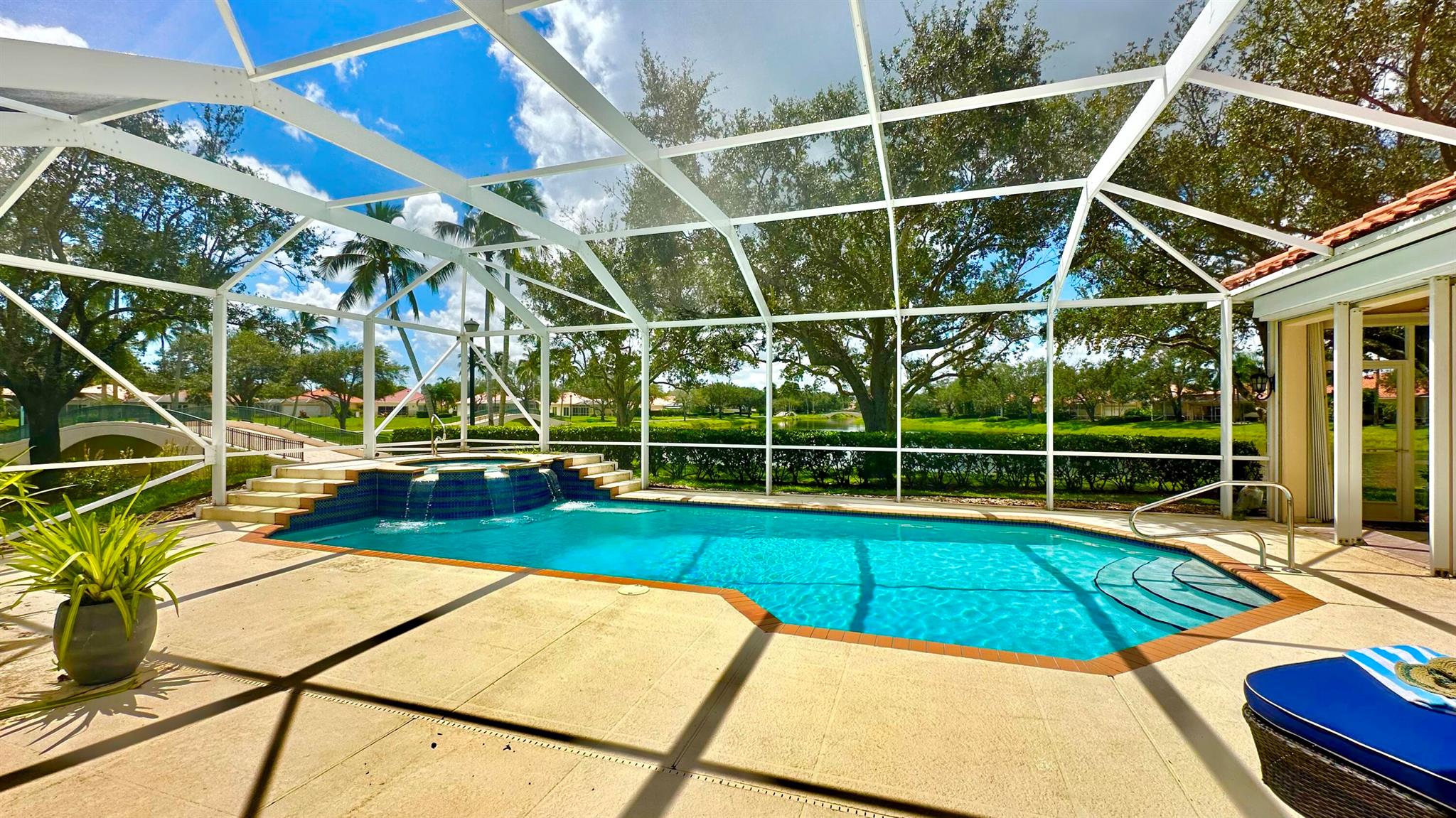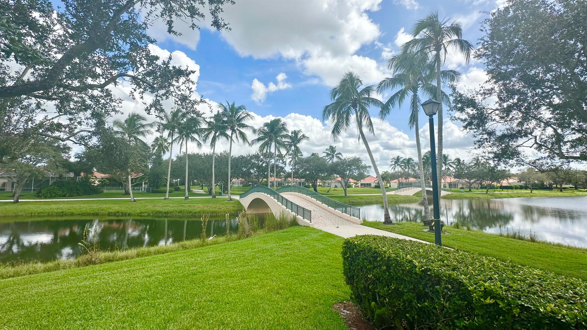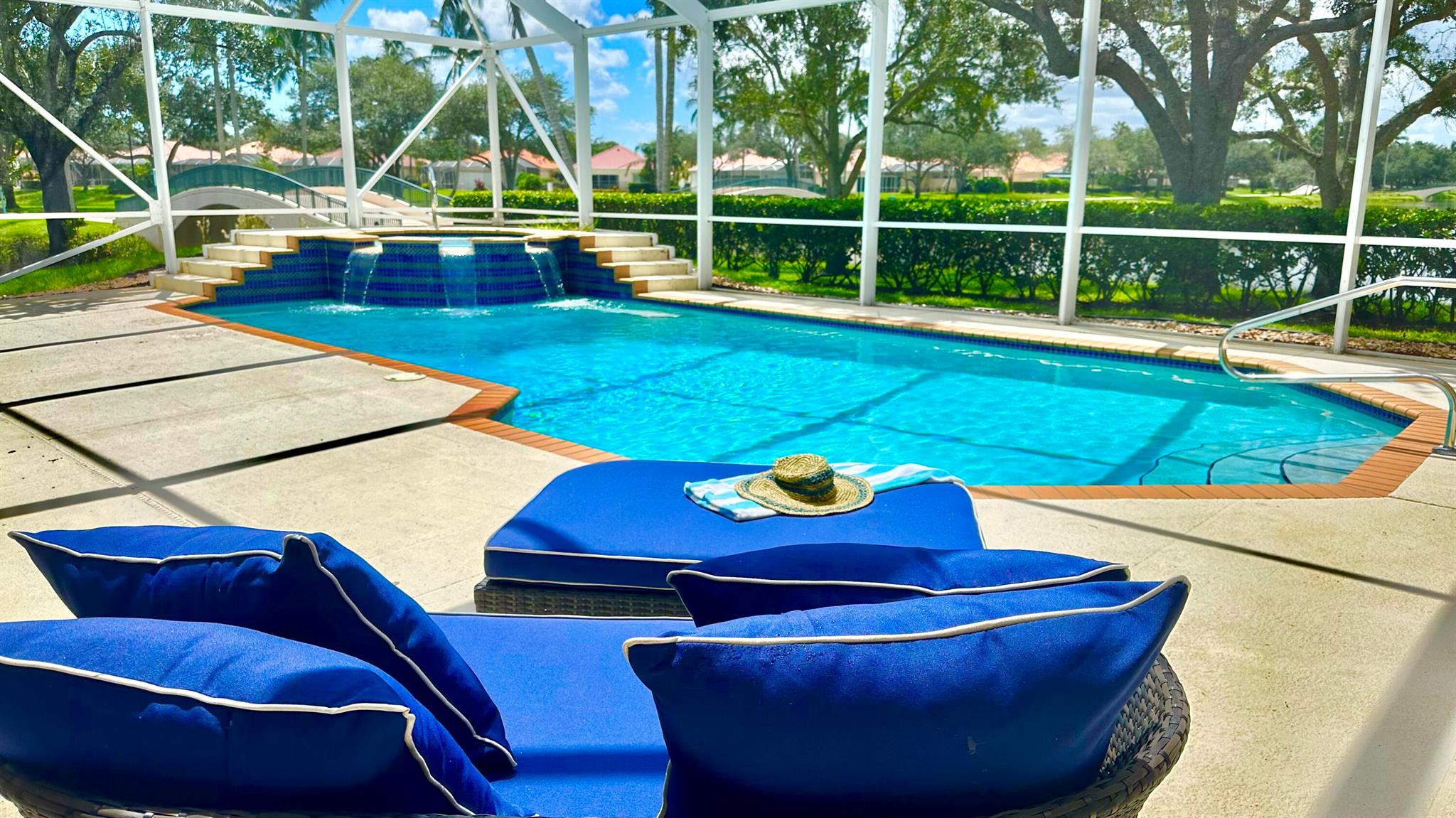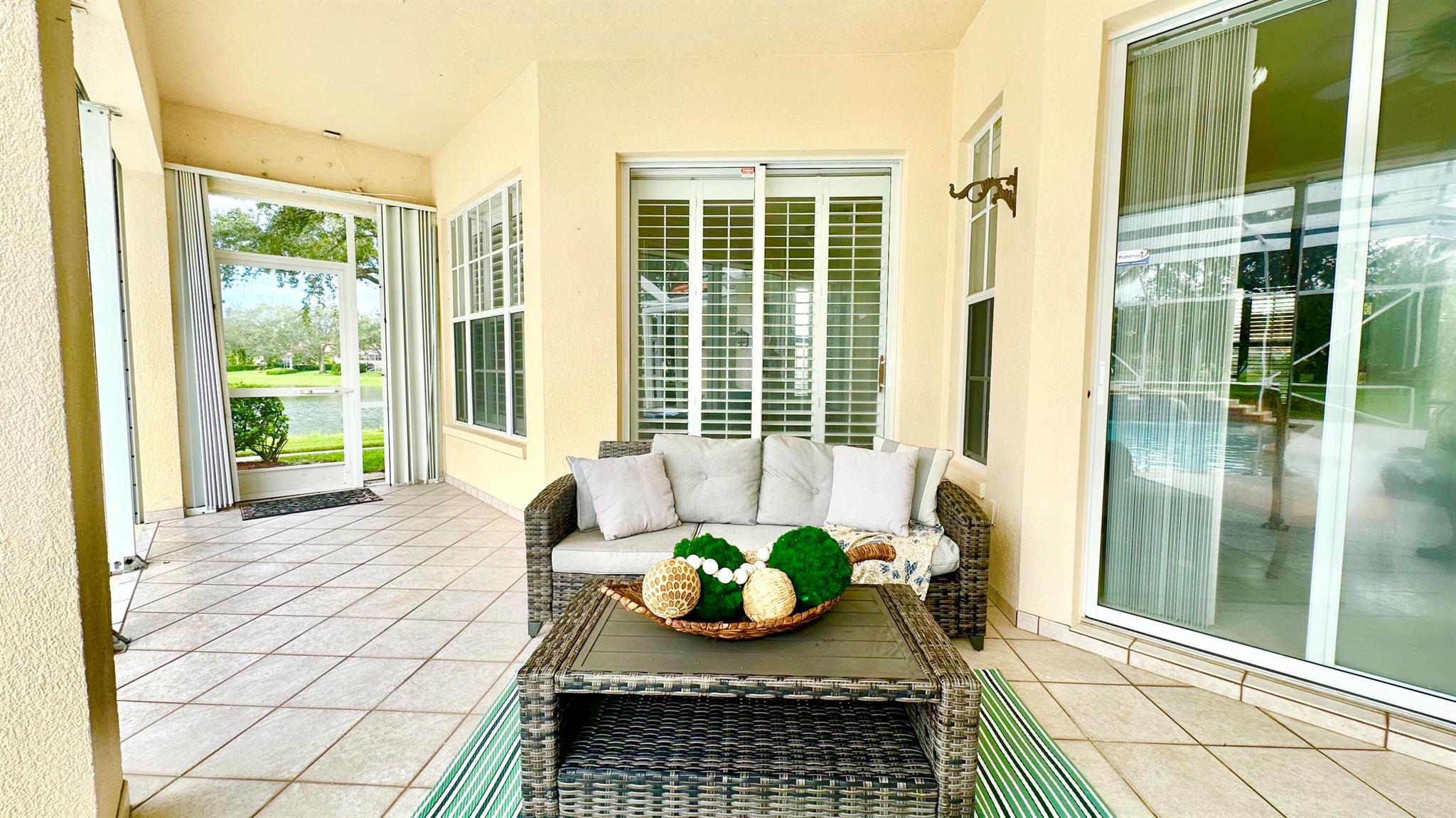 PHENOMENAL!! Hands down one of the best views and locations in RiverWalk... wake up to a glorious sunrise and wind down to a stunning sunset! This beautiful ''Windsor'' is situated on the point lot at the end of the cul de sac and enjoys wrap around views of the lakes and bridges. The oversized custom pool is a show stopper and has a raised spa with waterfalls and jets. Another great feature is the NEW ROOF in 2020!! The list of features this home has is abundant- roll down hurricane shutters, custom tiled flooring in the main living areas, crown molding, split floor plan (3 bedrooms on one side and the principal suite the opposite.