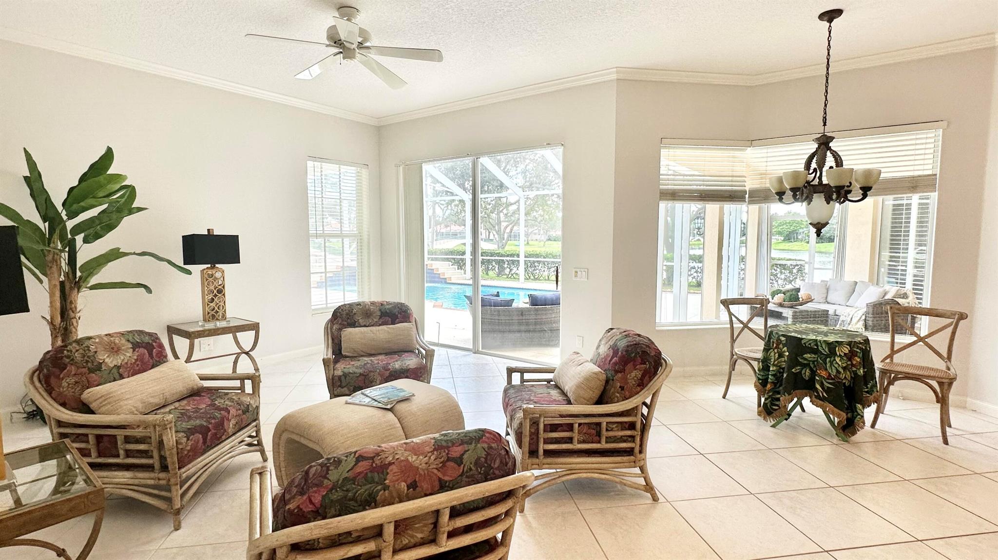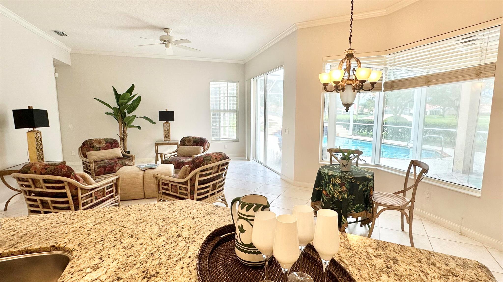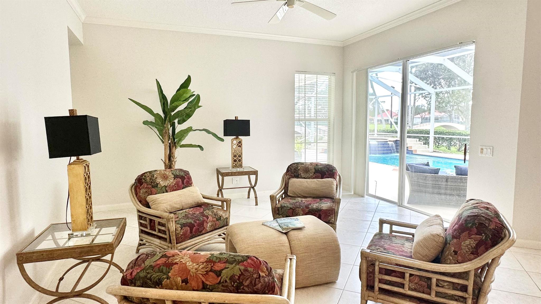 PHENOMENAL!! Hands down one of the best views and locations in RiverWalk... wake up to a glorious sunrise and wind down to a stunning sunset! This beautiful ''Windsor'' is situated on the point lot at the end of the cul de sac and enjoys wrap around views of the lakes and bridges. The oversized custom pool is a show stopper and has a raised spa with waterfalls and jets. Another great feature is the NEW ROOF in 2020!! The list of features this home has is abundant- roll down hurricane shutters, custom tiled flooring in the main living areas, crown molding, split floor plan (3 bedrooms on one side and the principal suite the opposite.