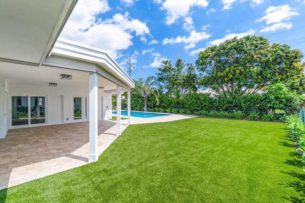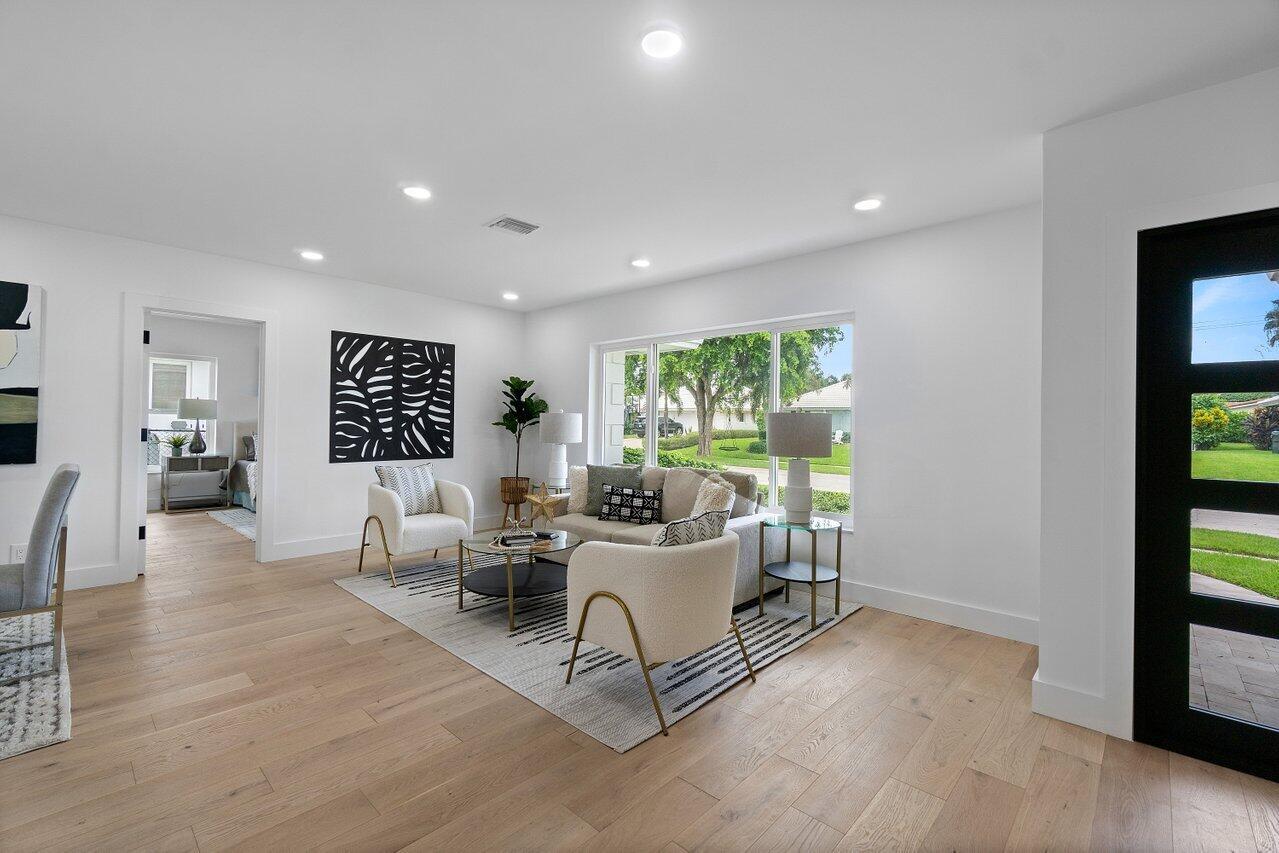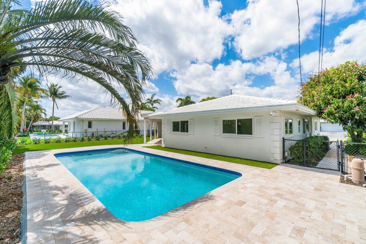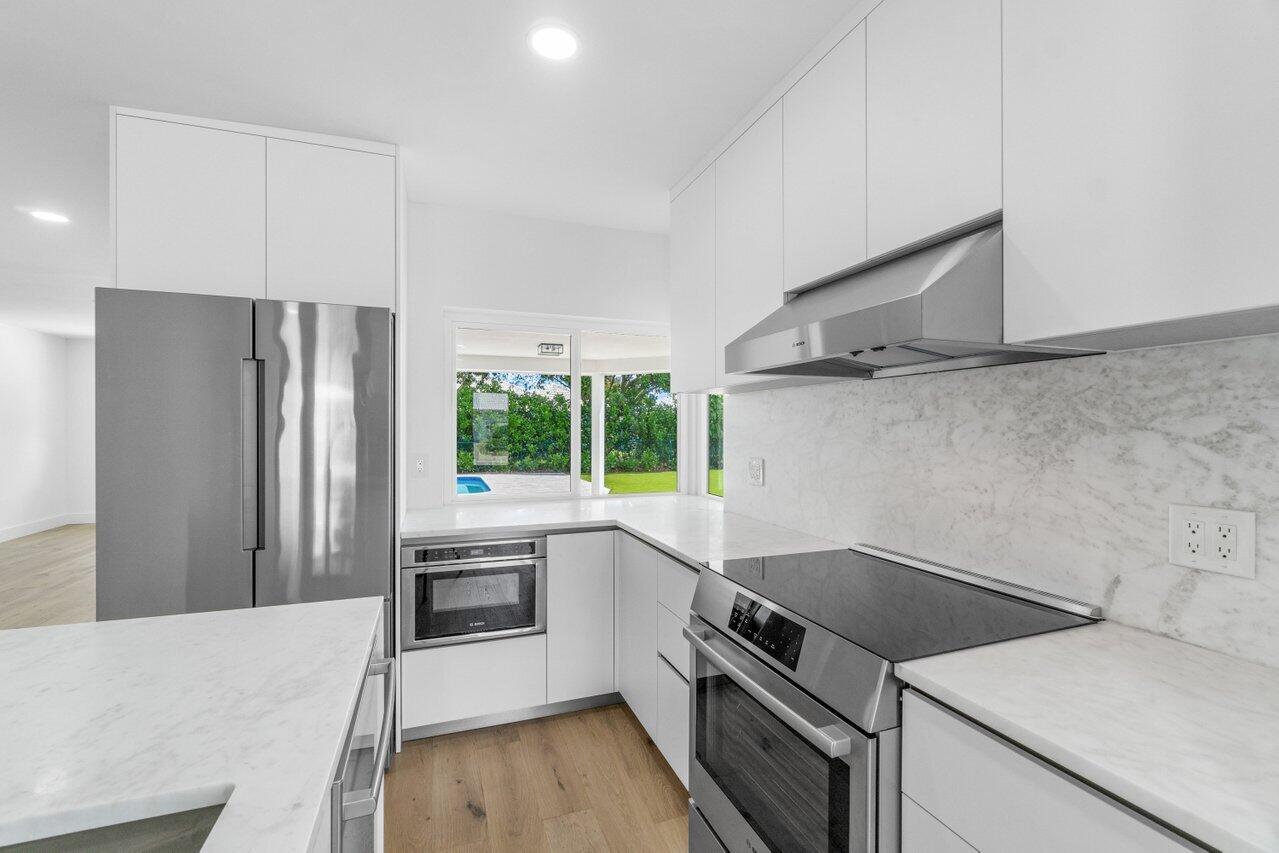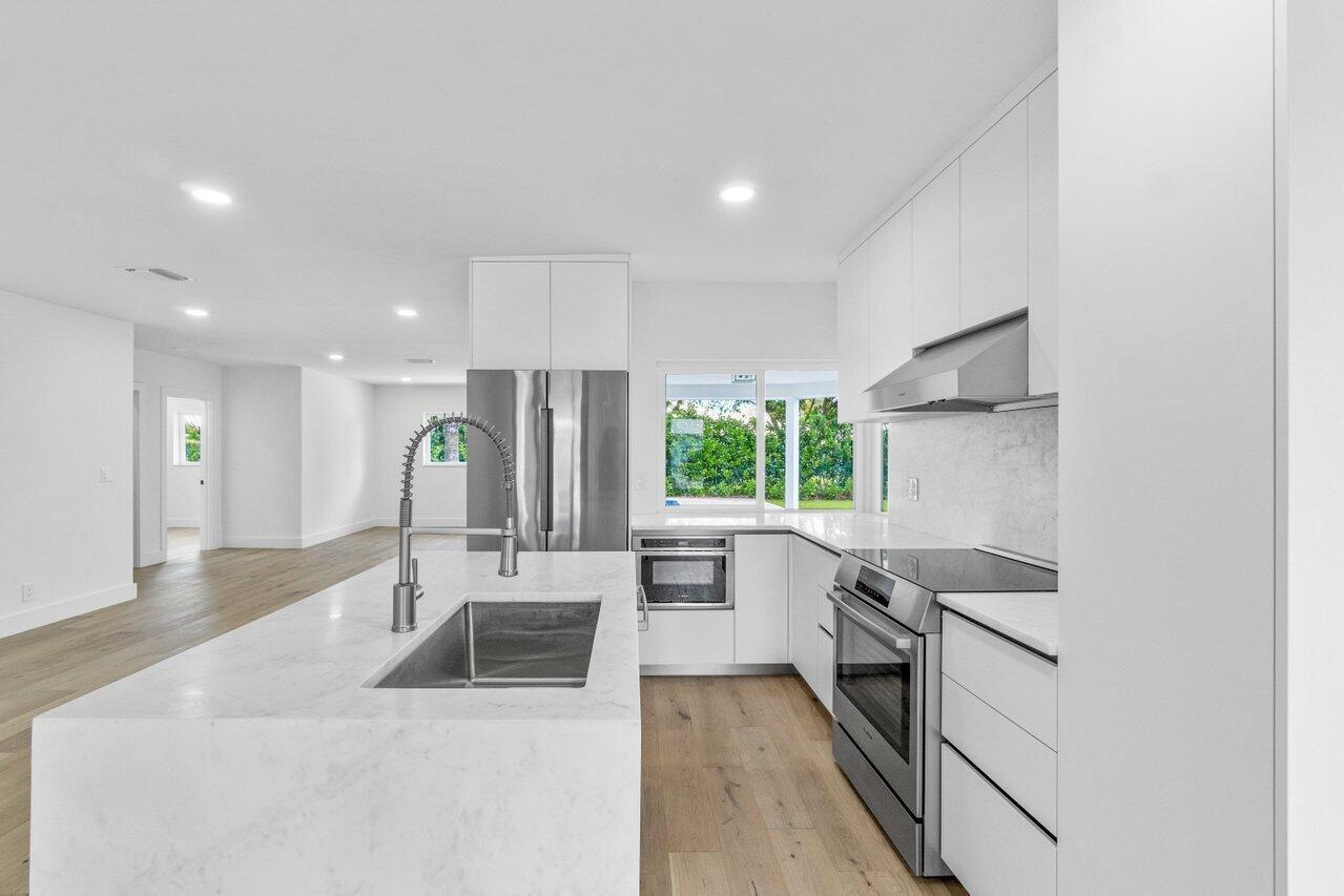 This single-story home in the highly sought-after Camino Gardens community of East Boca Raton has been meticulously renovated with top-of-the-line finishes. Featuring a bright and open split floor plan, the residence offers three bedrooms and two full bathrooms. Every detail is brand new. Roof - 2023, all HURRICANE impact windows and sliders. The kitchen is a showpiece, outfitted with custom Italian cabinetry, Bosch appliances, marble countertops, and a stunning waterfall edge backsplash. Throughout the home, you'll find French white oak wood flooring, custom-built closets, and updated doors, hardware, and trim. The bathrooms are beautifully finished with Italian porcelain tile and custom quartz countertops.Outside, a spacious covered patio overlooks a turfed backyard, while the brand