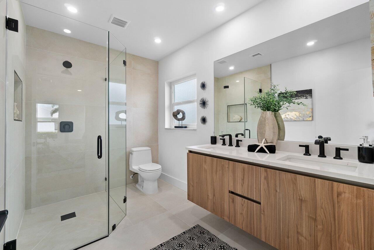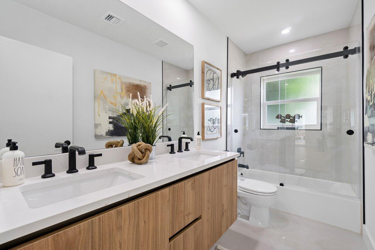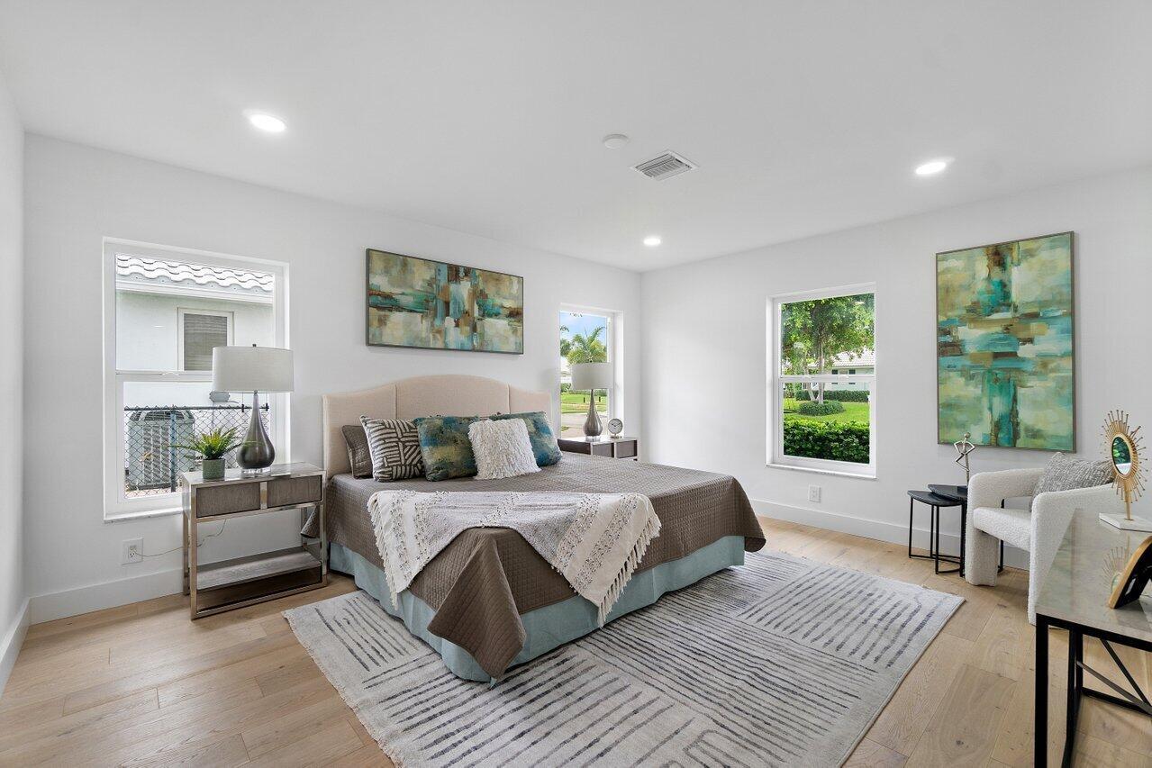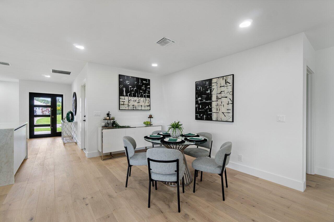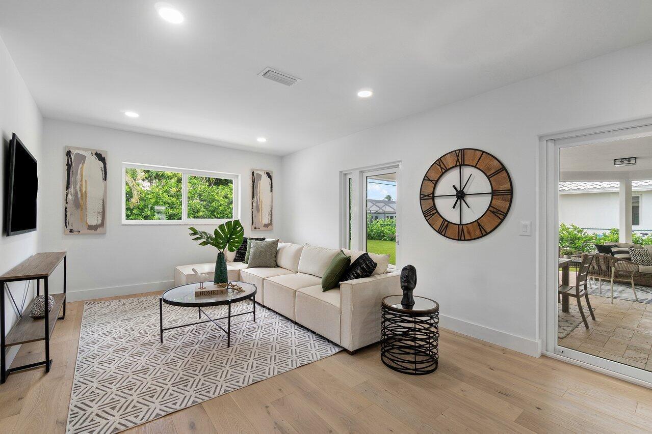 This single-story home in the highly sought-after Camino Gardens community of East Boca Raton has been meticulously renovated with top-of-the-line finishes. Featuring a bright and open split floor plan, the residence offers three bedrooms and two full bathrooms. Every detail is brand new. Roof - 2023, all HURRICANE impact windows and sliders. The kitchen is a showpiece, outfitted with custom Italian cabinetry, Bosch appliances, marble countertops, and a stunning waterfall edge backsplash. Throughout the home, you'll find French white oak wood flooring, custom-built closets, and updated doors, hardware, and trim. The bathrooms are beautifully finished with Italian porcelain tile and custom quartz countertops.Outside, a spacious covered patio overlooks a turfed backyard, while the brand