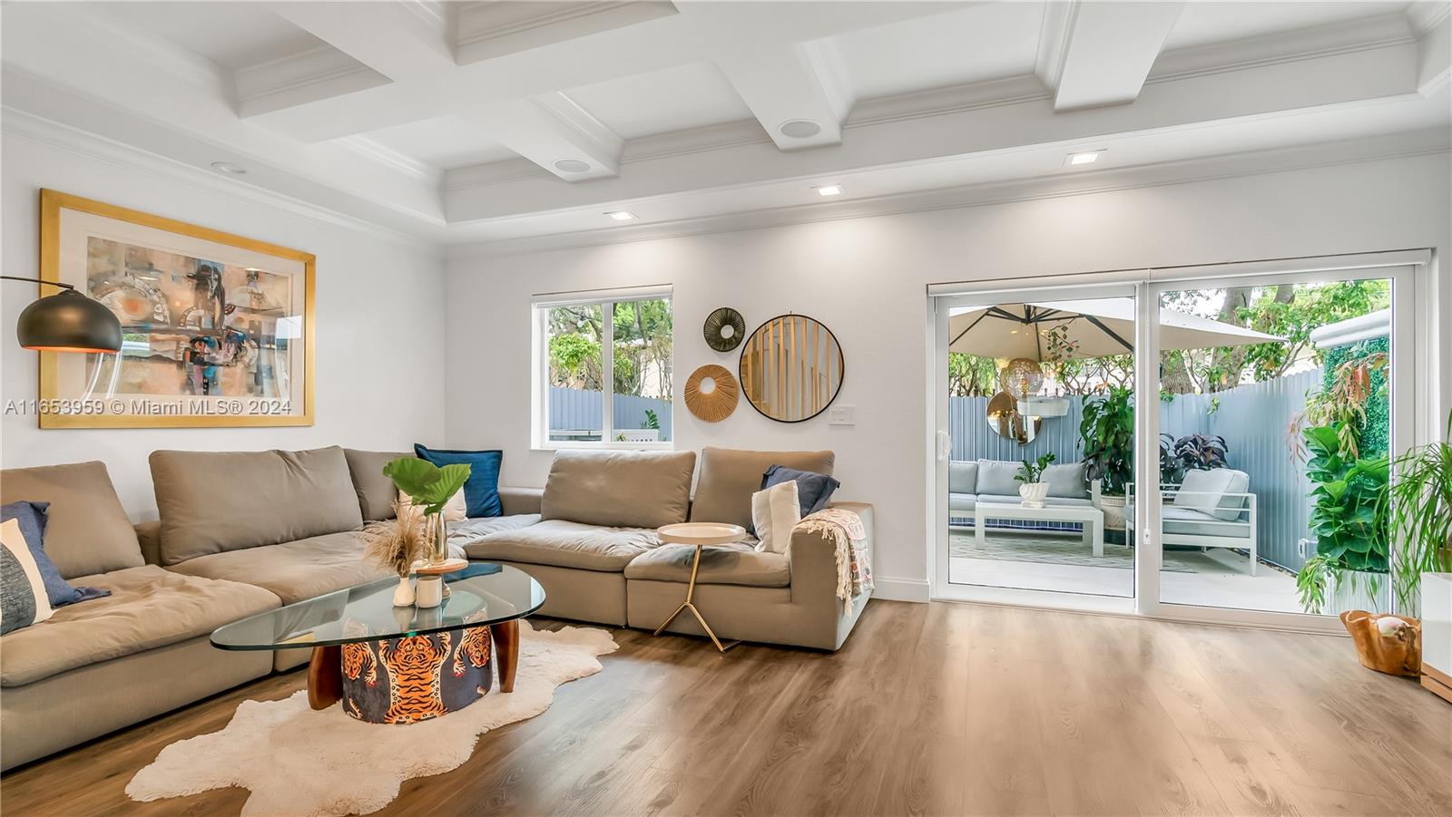Stunning 3-bedroom, two full bathrooms, and half bath downstairs, with two assigned parking spaces, all impact windows, and sliding doors. Perfect for both comfortable living and entertaining with high ceilings. An open-concept design that seamlessly connects the living room, dining area, kitchen, stainless appliances, and marble countertops. Luxurious three bedrooms, with a master suite with a private bath with a huge master closet, two full bathrooms, and one half bath downstairs, with contemporary fixtures and an outdoor oasis patio. The private backyard offers the perfect relaxation space and outdoor gatherings. A gated community is located close to Whole Foods, Ross, Aldi, Michaels, etc., within walking distance to shops, dining, entertainment, and a tennis center.