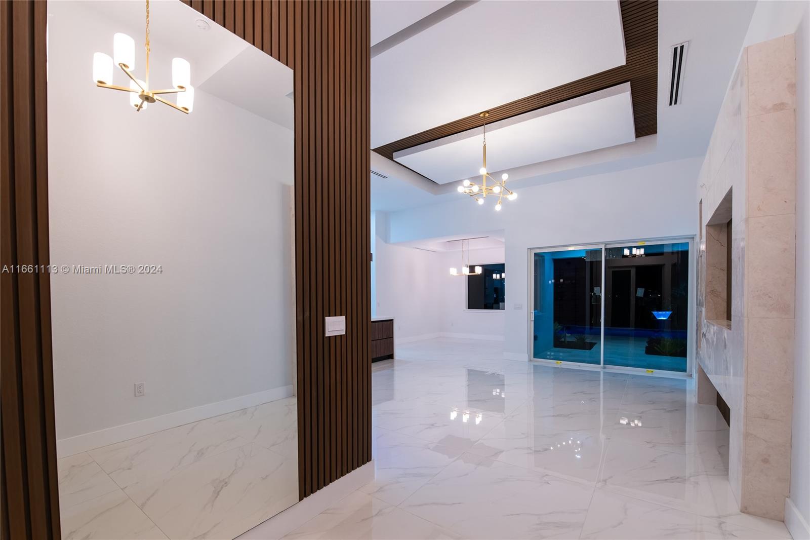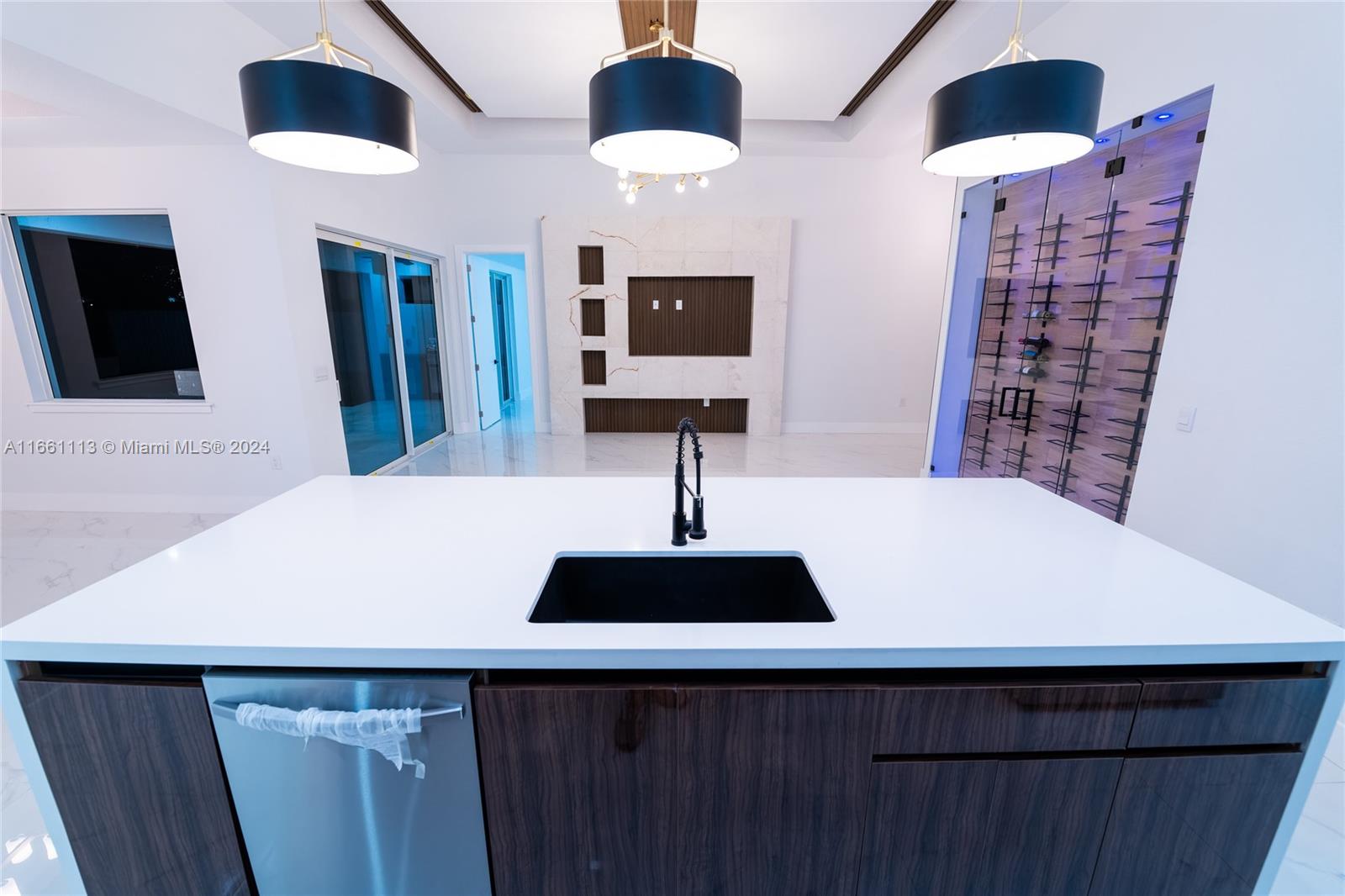 Introducing a stunning waterfront estate that epitomizes luxury living. This newly constructed home features 4 spacious bedrooms and 3 elegant bathrooms, complemented by a three-car garage. Step outside to discover a breathtaking pool with a waterfall, a cozy firepit, and a built-in BBQ, perfect for outdoor gatherings. Inside, the residence boasts a gourmet kitchen with sleek European-style cabinets, a stone wine rack, and pristine quartz countertops. The open-concept layout and soaring ceilings create a bright and inviting atmosphere, enhanced by sophisticated tile flooring. Hurricane-impact windows provide both security and peace of mind. Enjoy the outdoor space with ceiling fans on the patio ensuring optimal airflow.