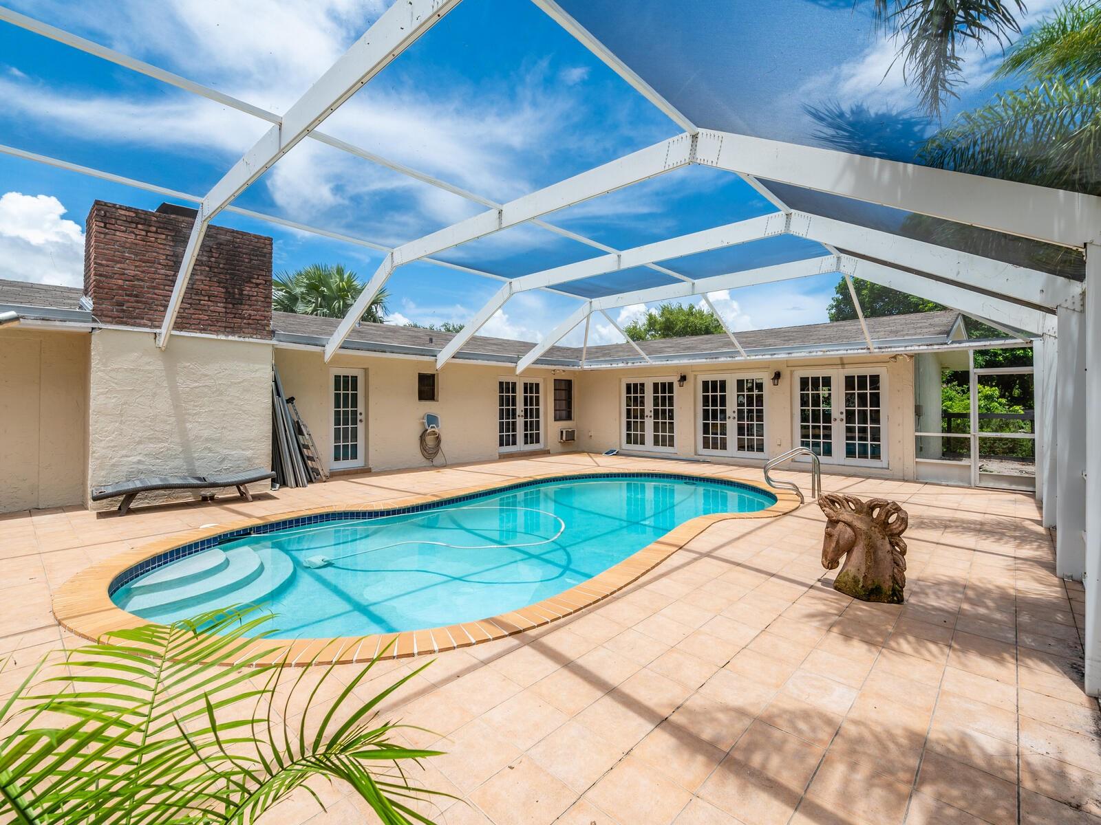 2.3 ACRES. LARGE FAMILY HOME OR KEEP A HORSE LOVERS DREAM!! PICTURES TELL THE STORY. BRING YOUR OWN OR RENT WITH 12 STALLS WITH ELECTRIC/RUN OUTS/TACK ROOM. USE BIG 160X125 ARENA FOR TRAINING/RIDING LESSONS. 7 TURNOUT PADDOCKS. TRUE 6 BDRM/5 BATH. SEPARATE 1/1 SUITE/FULL KITCHEN/SEPARATE LIVING AREA. HOUSE & STABLE ROOFS 2018. DOMED SCREENED TILED PATIO/POOL. HUGE 20X18 MAKE WHATEVER YOU WANT ROOM/VAULTED CEILING/3 FRENCH DOORS TO PATIO/POOL. BIG LIVING ROOM OPEN TO KITCHEN/FRENCH DOORS TO PATIO/POOL. LARGE KITCHEN AREA OPEN TO LIVING ROOM WITH 2 SEATABLE BARS. LARGE MASTER BDRM WITH 2 WALKIN CLOSETS/DOORS TO PATIO AND POOL. MASTER BATH WITH OVERSIZED 5X6.5 JACUZZI SPA. 5TH BDRM WITH OWN BATH/FRENCH DOORS TO PATIO & POOL. NICE 57X35 GARDEN WITH FRUIT TREES/BRICK BBQ. VERY PRIVATE BACK YARD