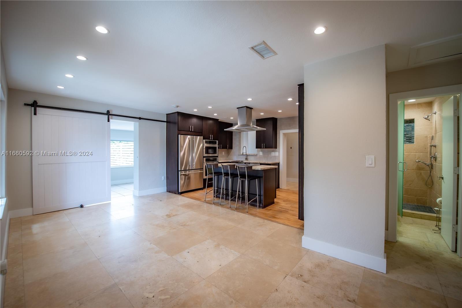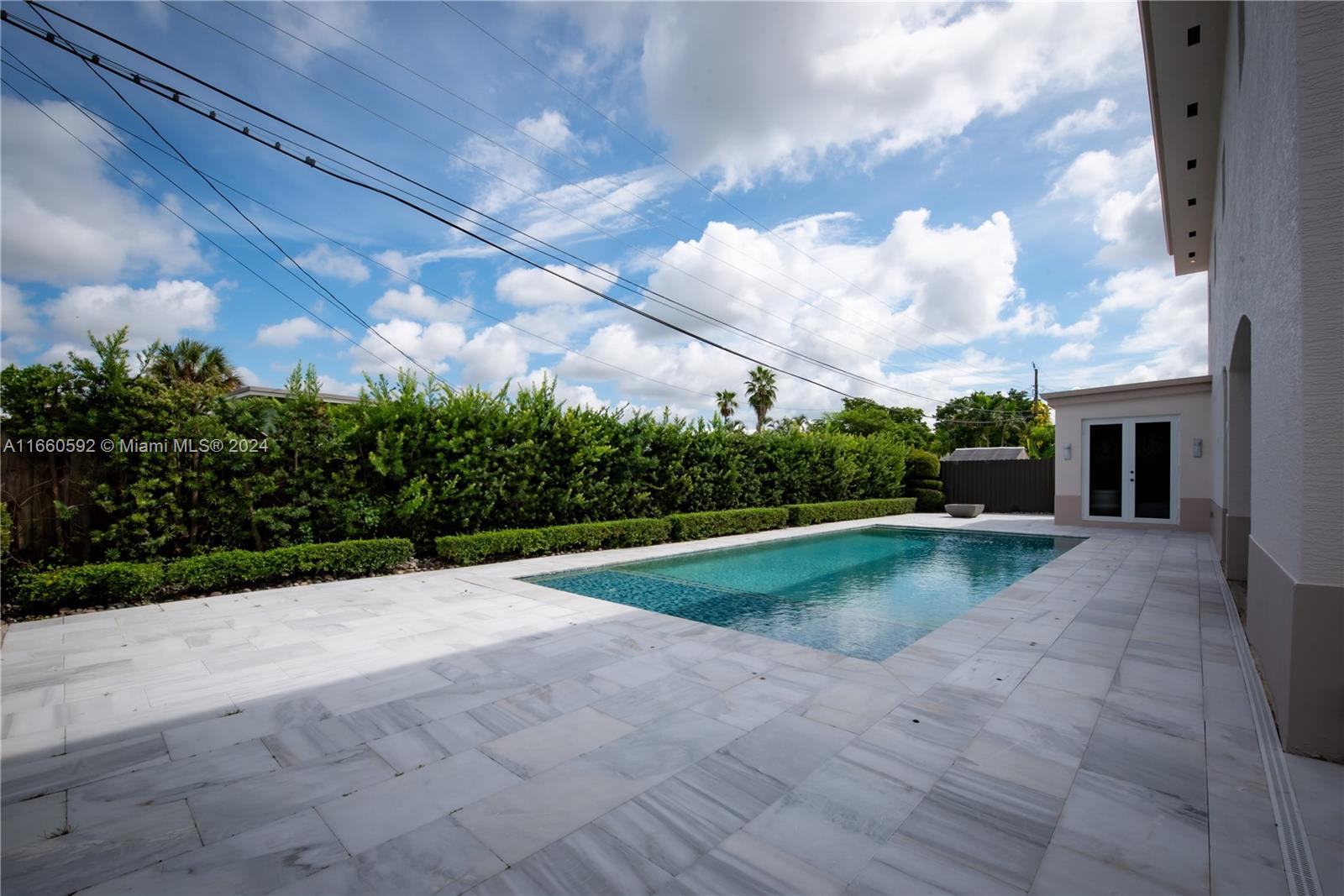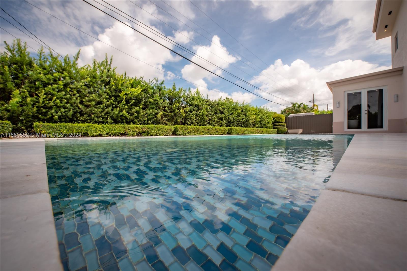 Stunning 4 bed, 3 bath home featuring high ceilings and 8ft doors. Enjoy a gas-heated pool and natural gas connections for a BBQ and fire pit. The kitchen is a chef's dream with Thomasville wood cabinets, marble countertops, and stainless steel appliances. Relax on the tiled terrace with wood ceilings, or retreat to the master suite with cove lighting, a luxurious bath with double sinks, a freestanding jet tub, and a rainfall shower. The media room includes an 80" TV, custom cabinetry, wine cooler, and bar sink. Upstairs, a Jack-and-Jill bathroom connects two bedrooms, while the guest bath offers added convenience. All bathrooms feature glass enclosures. Additional highlights include blackout shades with rails, electric shades in the master suite, and some hurricane impact windows.
