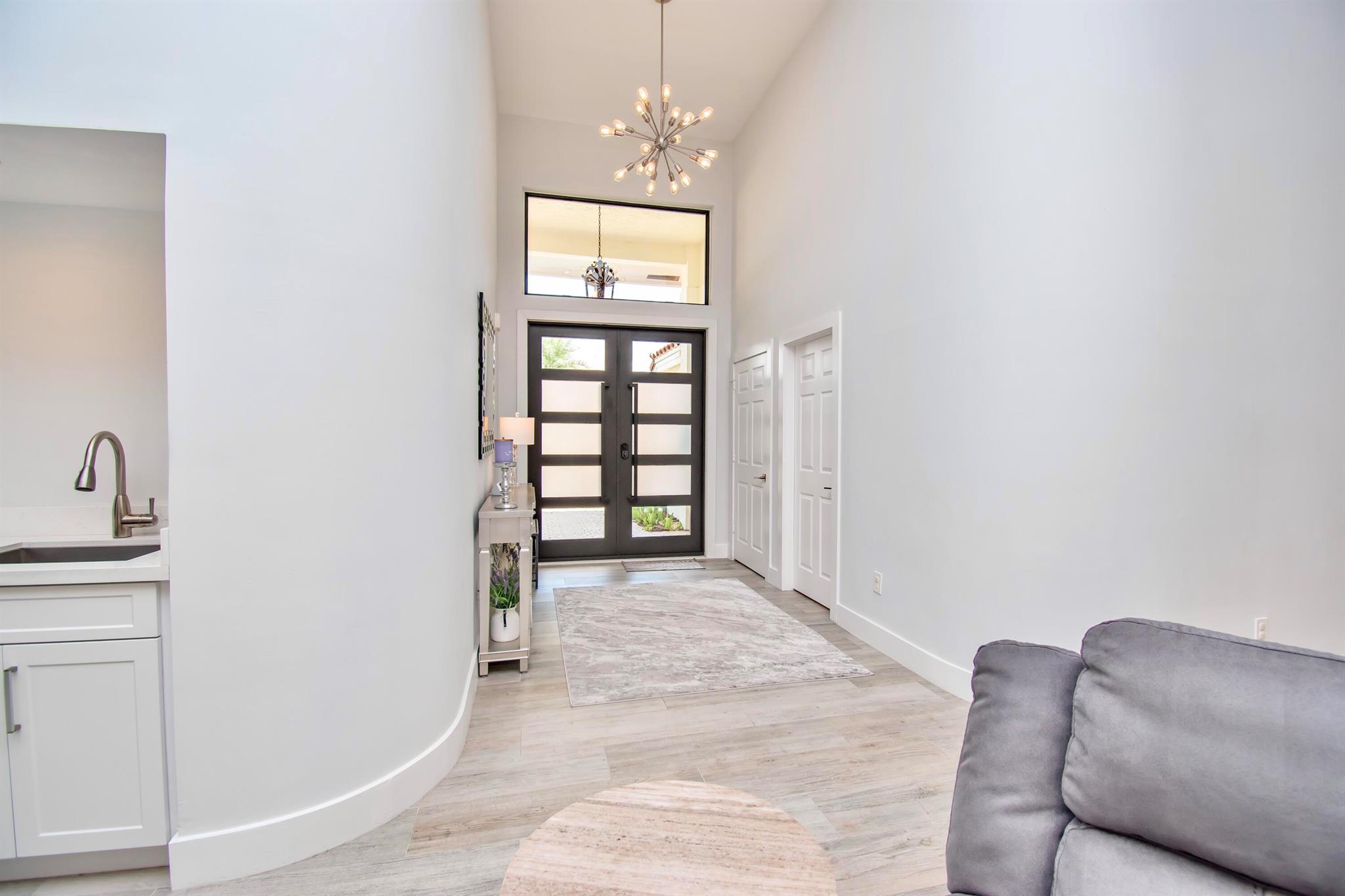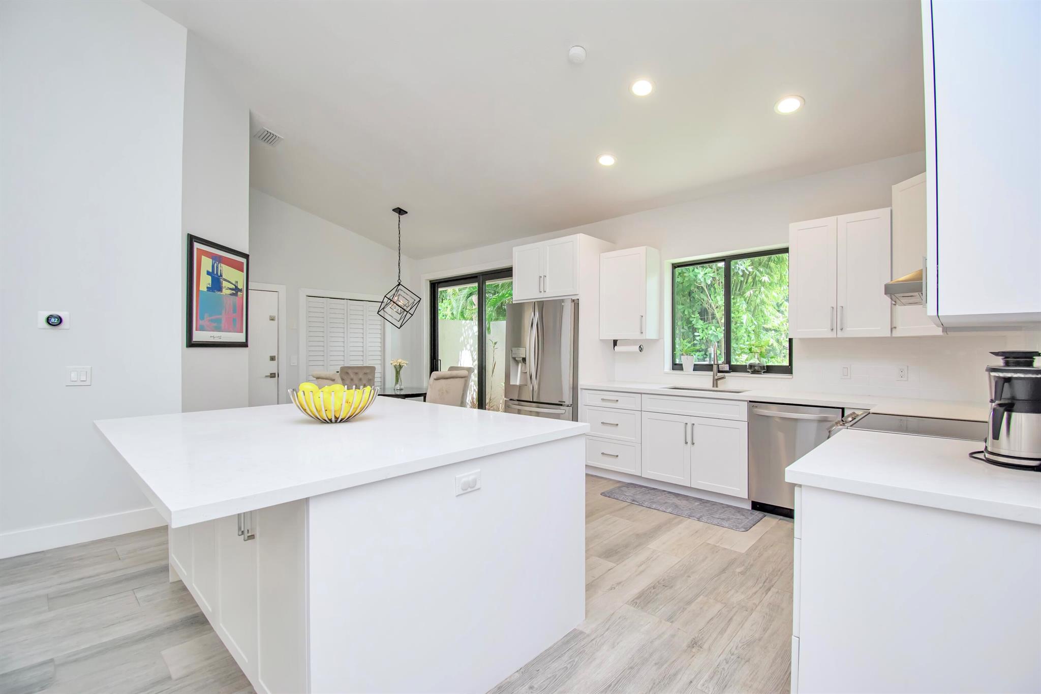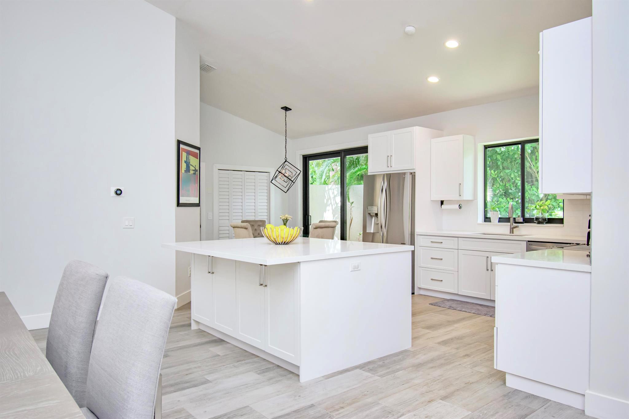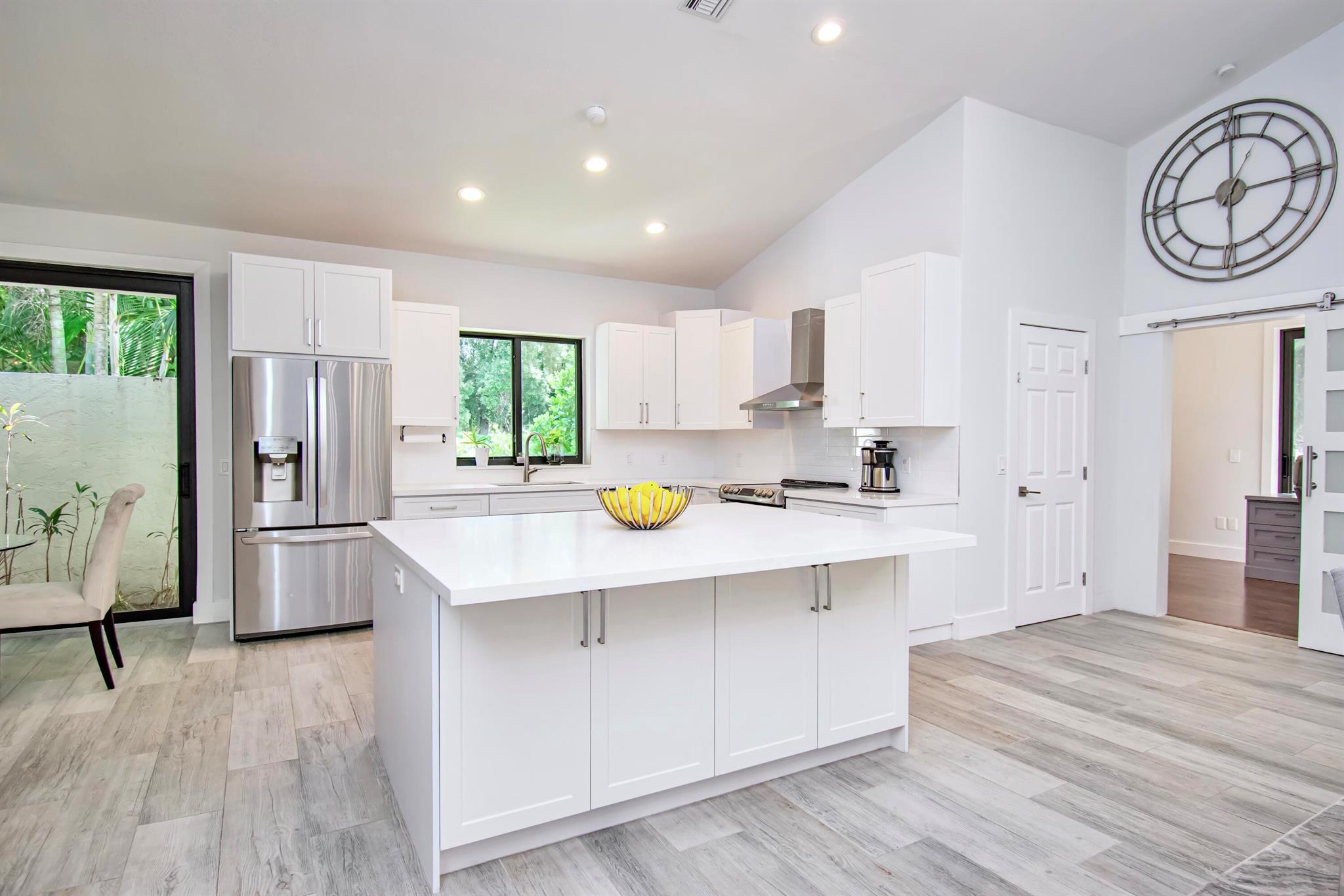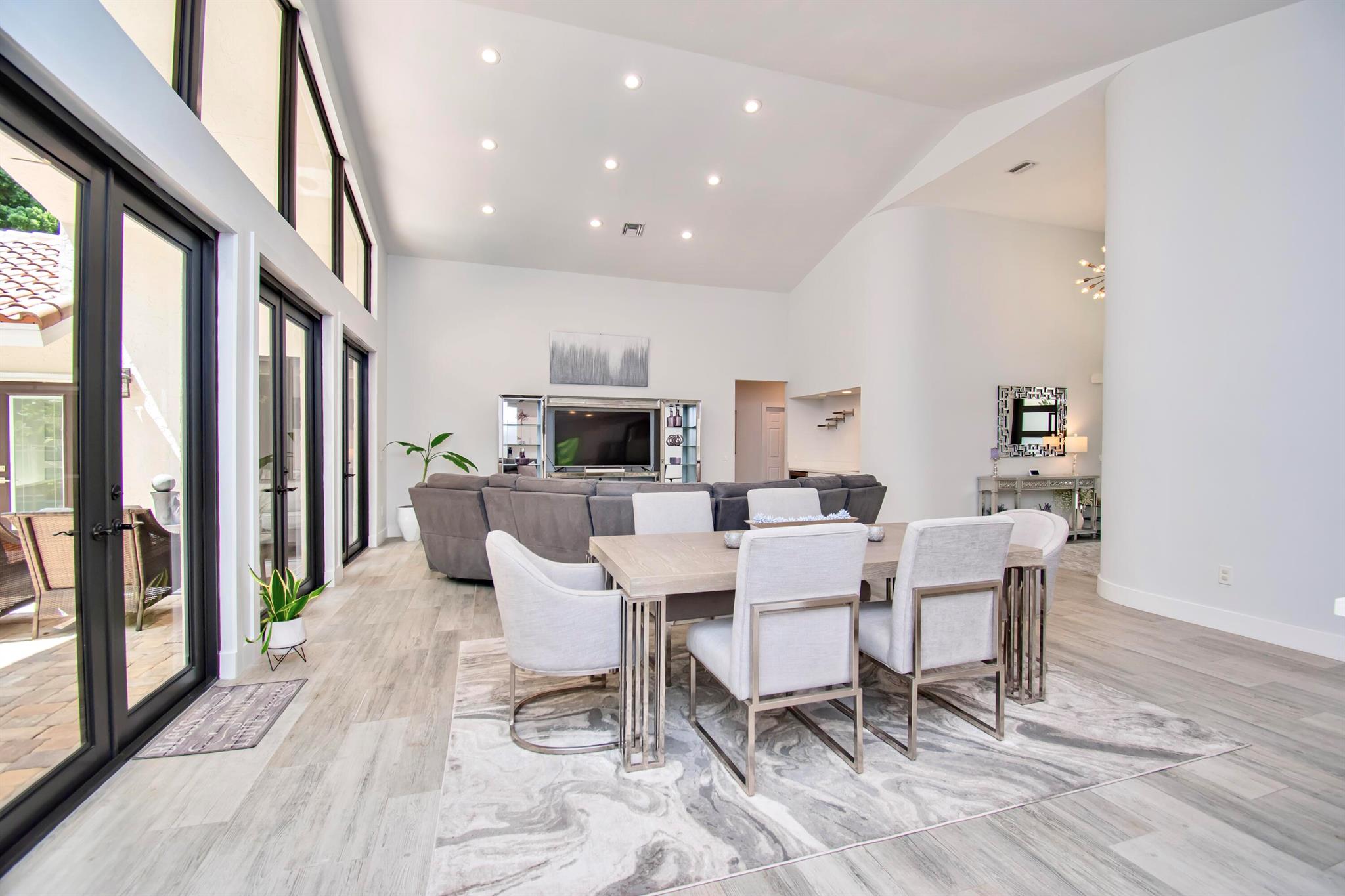 This completely updated home features a modern, warm, clean-line design. Single story East Boca 5 bedroom, 2 1/2 bath, cul-de-sac pool home with 2 car garage in a small private community adjacent to Calusa Elementary School. The front entrance has impressive double 8 foot modern impact doors that open to a grand foyer and large open floor plan with high soaring ceilings. The interior has many windows providing adequate natural light. The Primary Suite includes a large walk-in closet with an elegant bathroom. The kitchen boasts of modern custom cabinetry with quartz counter tops, large island, and like new energy efficient stainless steel appliances.