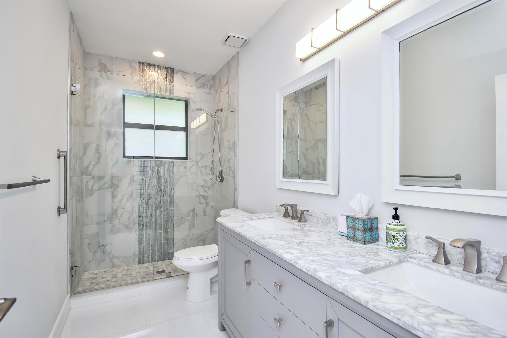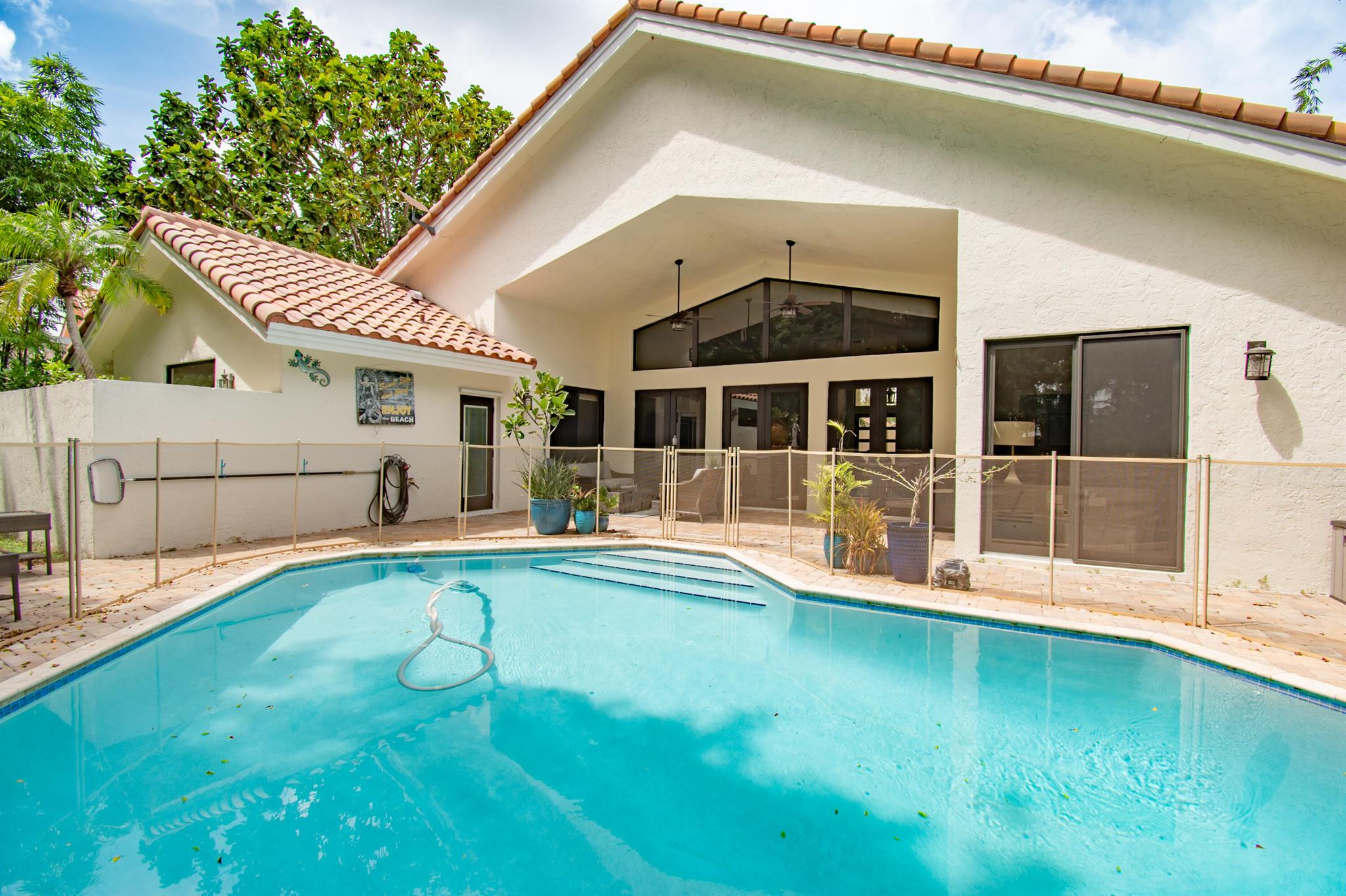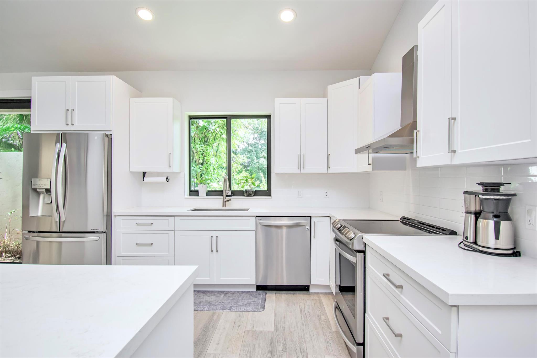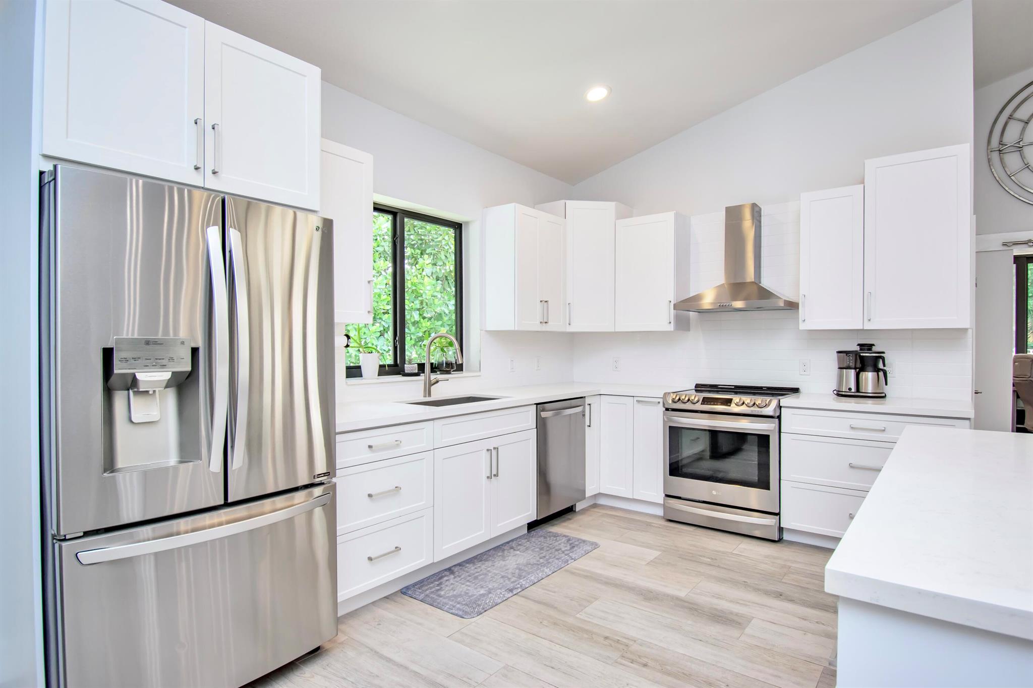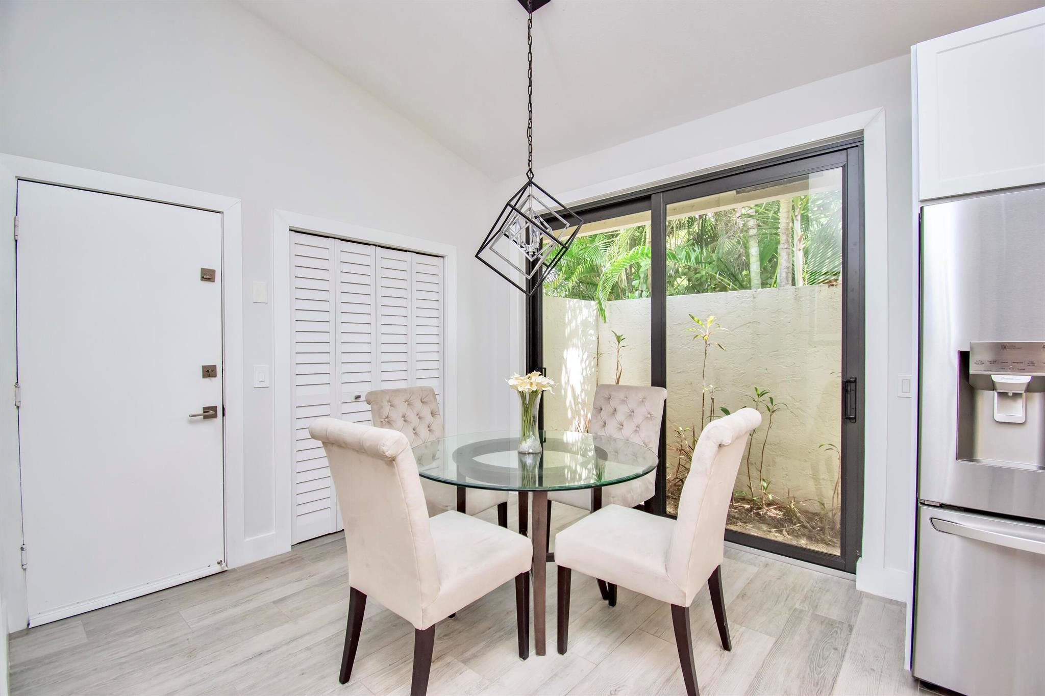 This completely updated home features a modern, warm, clean-line design. Single story East Boca 5 bedroom, 2 1/2 bath, cul-de-sac pool home with 2 car garage in a small private community adjacent to Calusa Elementary School. The front entrance has impressive double 8 foot modern impact doors that open to a grand foyer and large open floor plan with high soaring ceilings. The interior has many windows providing adequate natural light. The Primary Suite includes a large walk-in closet with an elegant bathroom. The kitchen boasts of modern custom cabinetry with quartz counter tops, large island, and like new energy efficient stainless steel appliances.