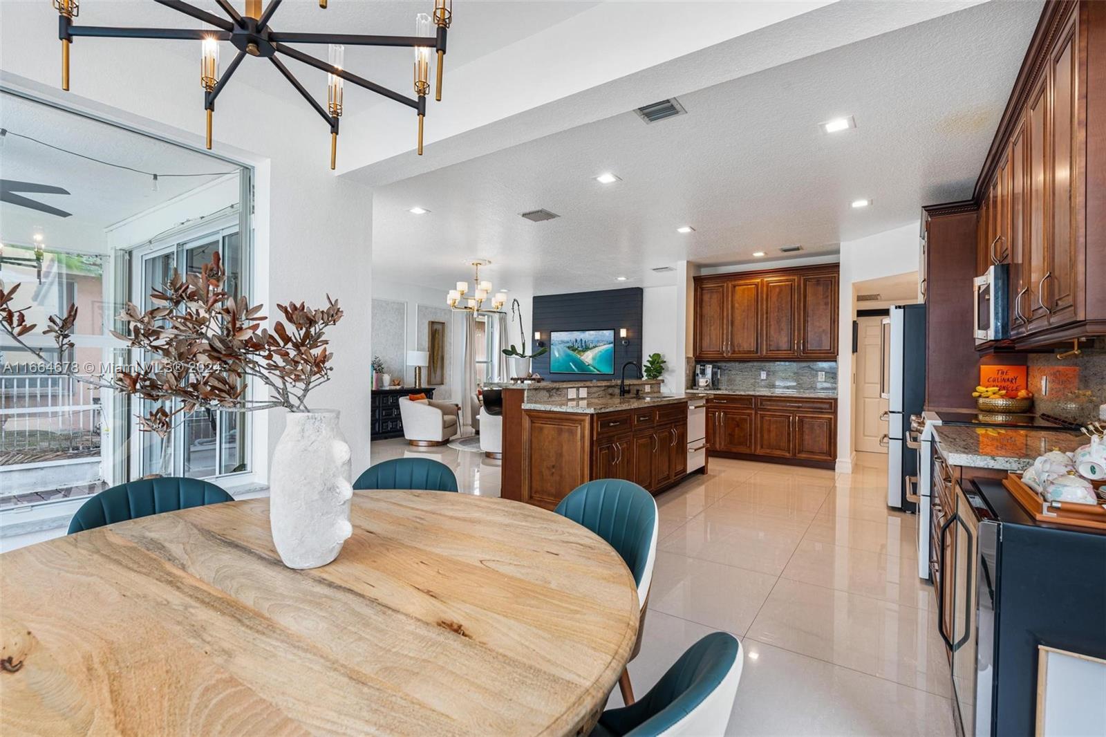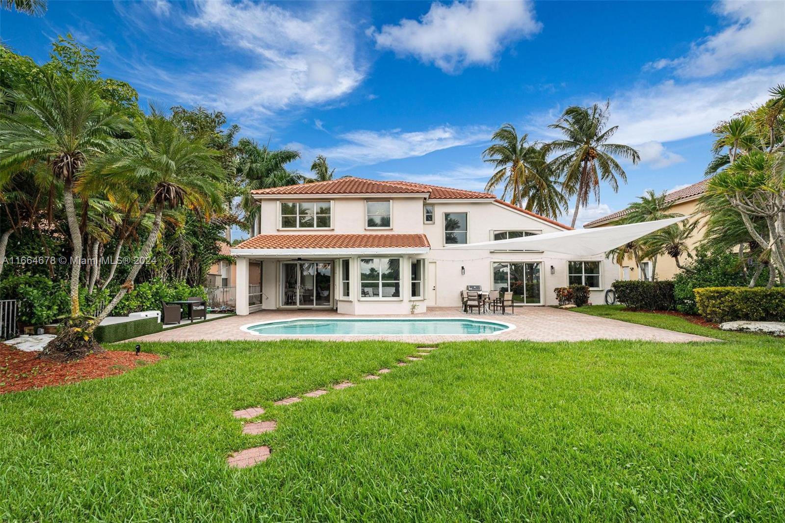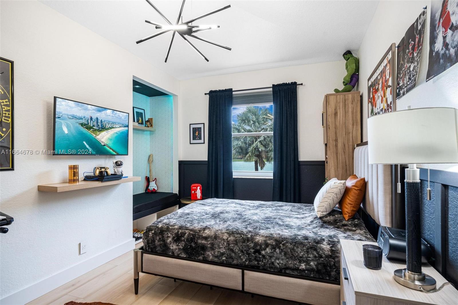 Beautifully renovated contemporary 5 bedroom, 3.5 bath home complete with a 2 car garage on a 12,000+ square foot lot in the coveted gated community of Encantada in West Pembroke Pines. Enjoy the modern look of large format porcelain tiles throughout the main living area. The kitchen is fully equipped with new Café appliances and a new induction cooktop (2024). New washer and dryer included! Single garage space is under air and converted to a 7 seat Dolby Atmos home cinema room. Freshly painted with new outlets, Lutron Smart light switches and new engineered wood flooring upstairs. Live worry free with a new roof from 2023! The outdoor space is an entertainer's dream with a beautiful pool and covered terrace. Home is on a peaceful lake with unobstructed views for the ultimate zen retreat.