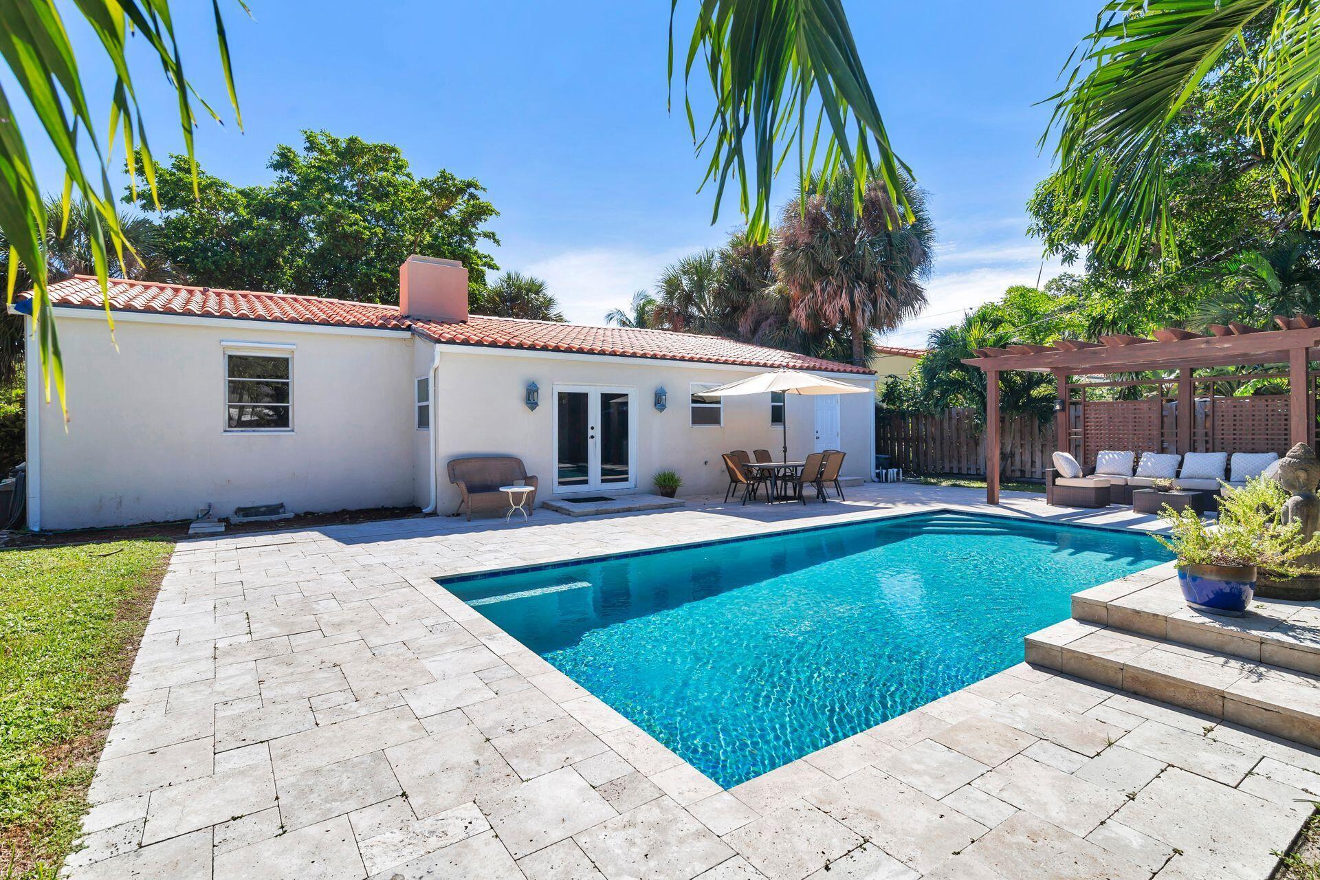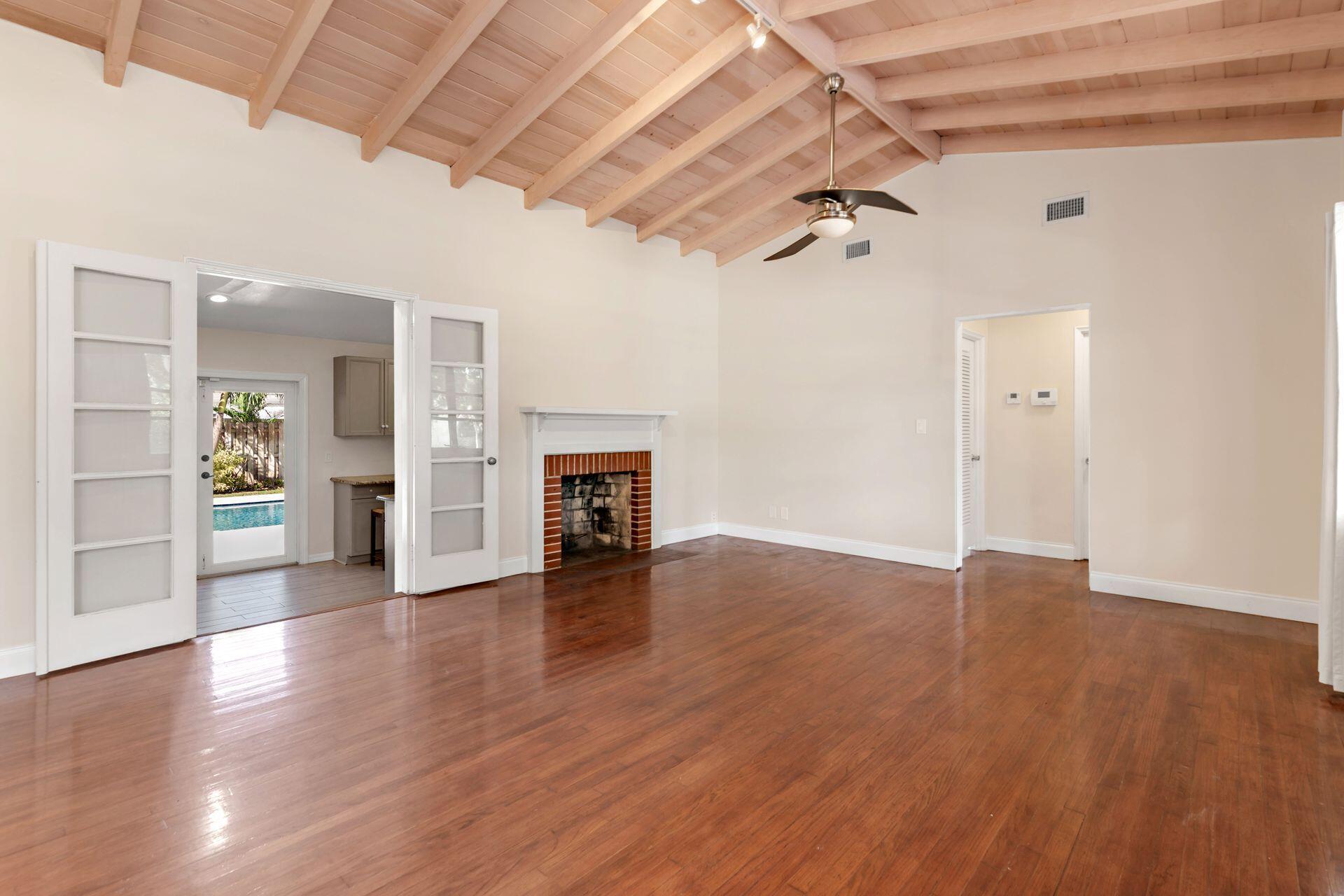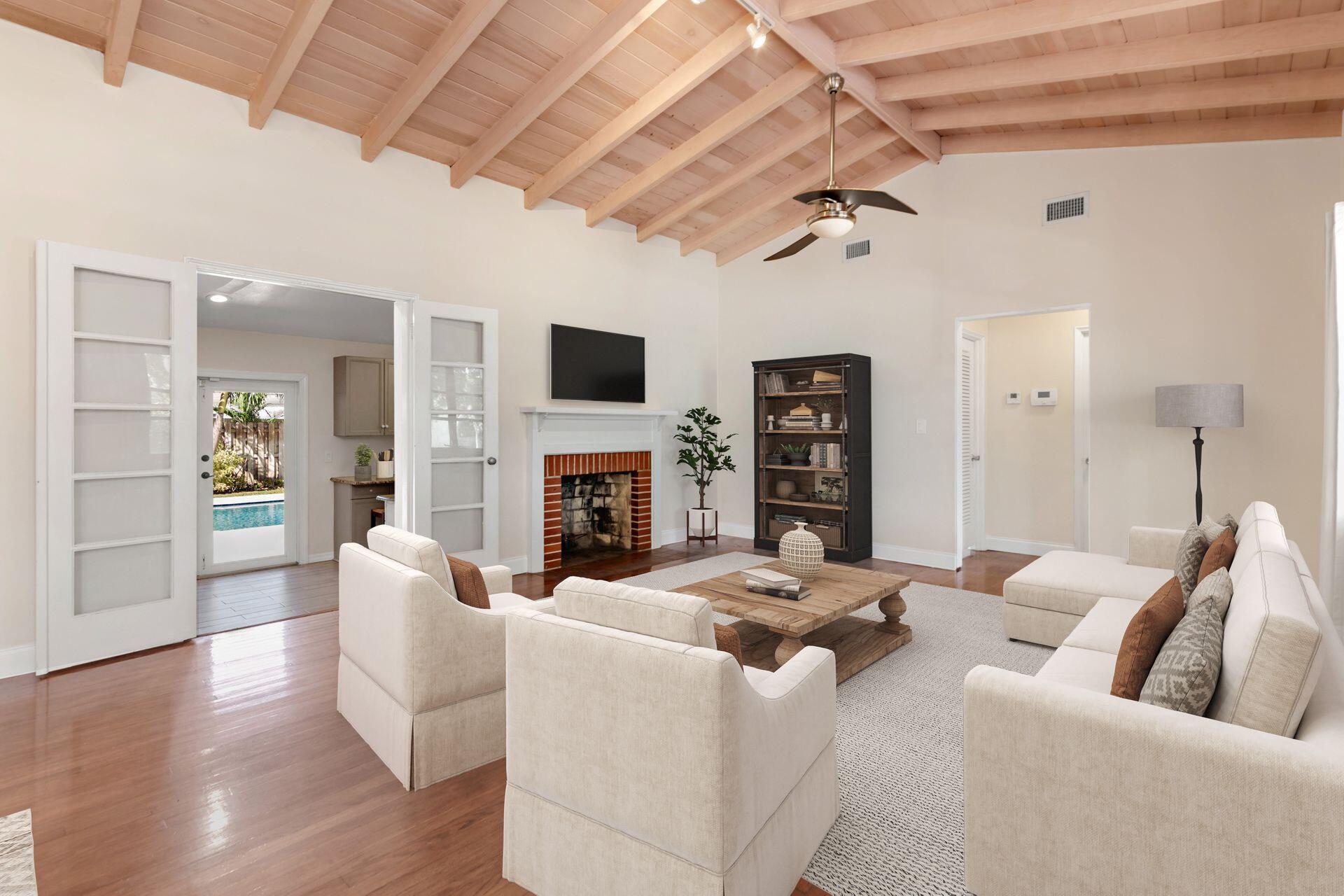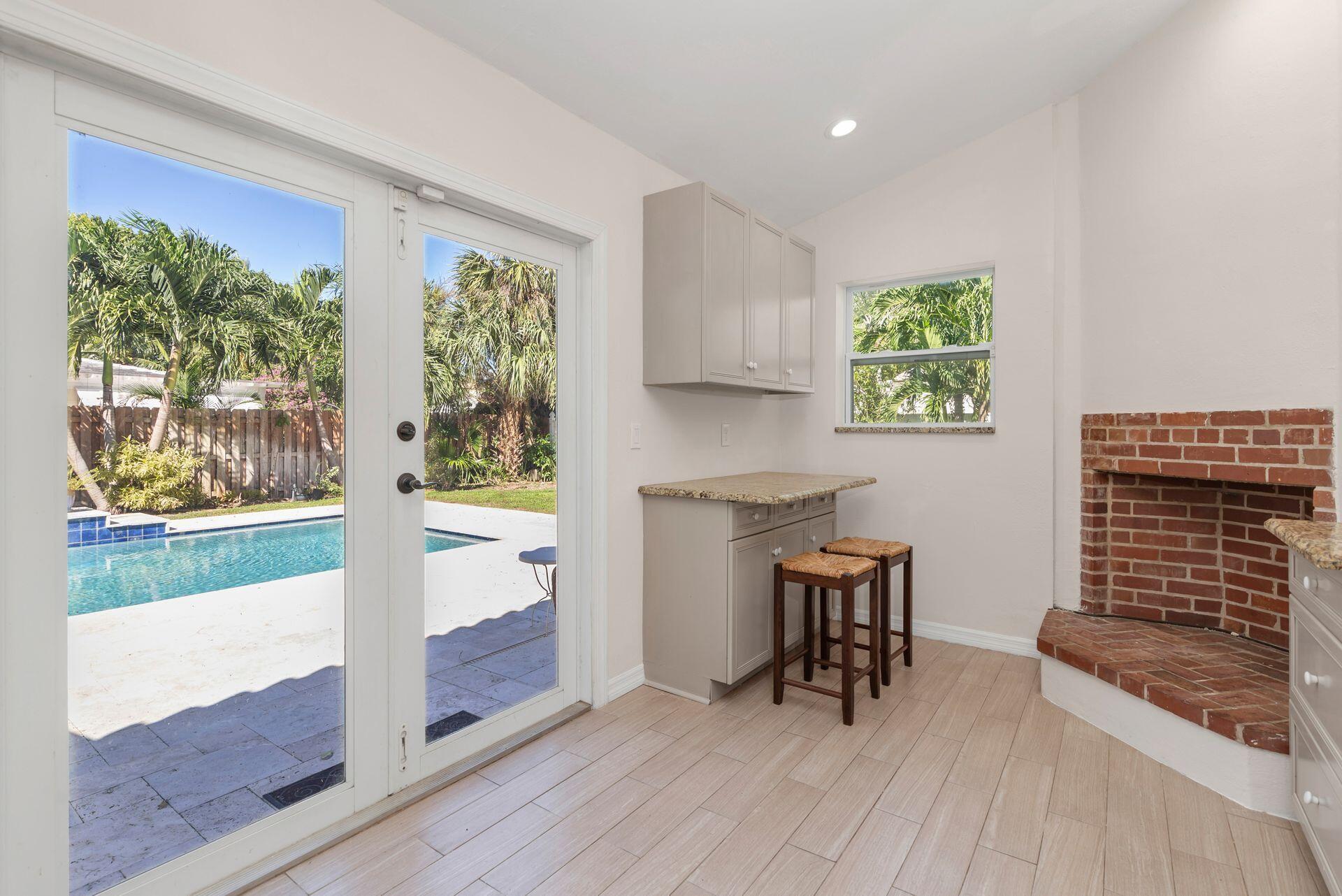 Rare find in desirable Northwood Shores! This 1947, cement block, home offers 2 bedrooms, 2 baths plus a den/nursery/hobby room. When entering the home, you will be greeted by a bright, open 28 X 15 living/dining/family area with vaulted cypress ceilings, original tongue and grove hardwood floors and brick fireplace. The bathrooms have been tastefully renovated and the spacious kitchen has been updated with wood cabinets, granite countertops, stainless steel appliances, 5-burner gas stove, tile flooring and impact french doors leading to the spacious fenced in backyard. The kitchen also has a rare, original corner brick fireplace. The current owner added an amazing 30 X 15 pool in 2018 with Travertine decking and a sturdy, attractive gazebo with an attached natural gas grill.