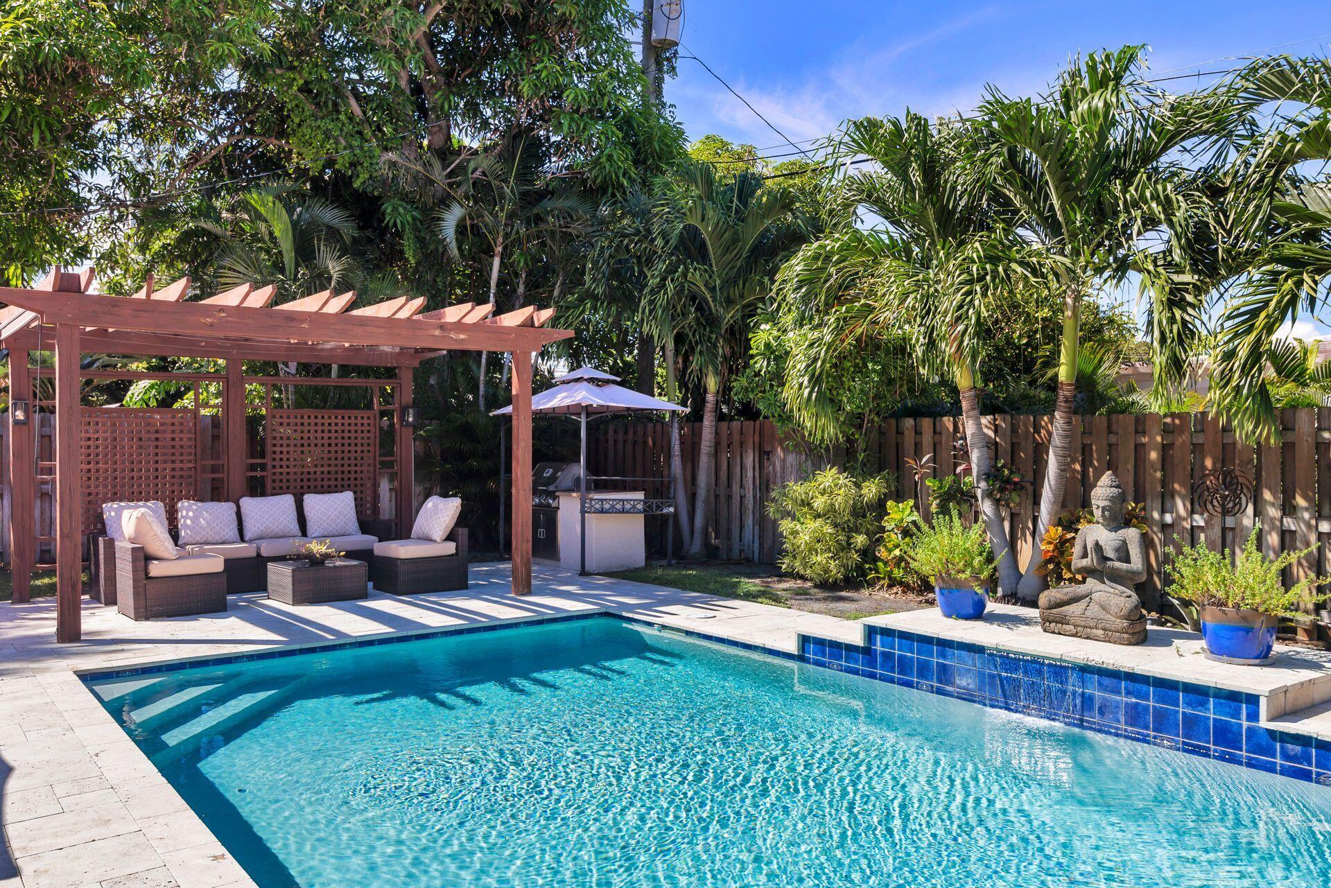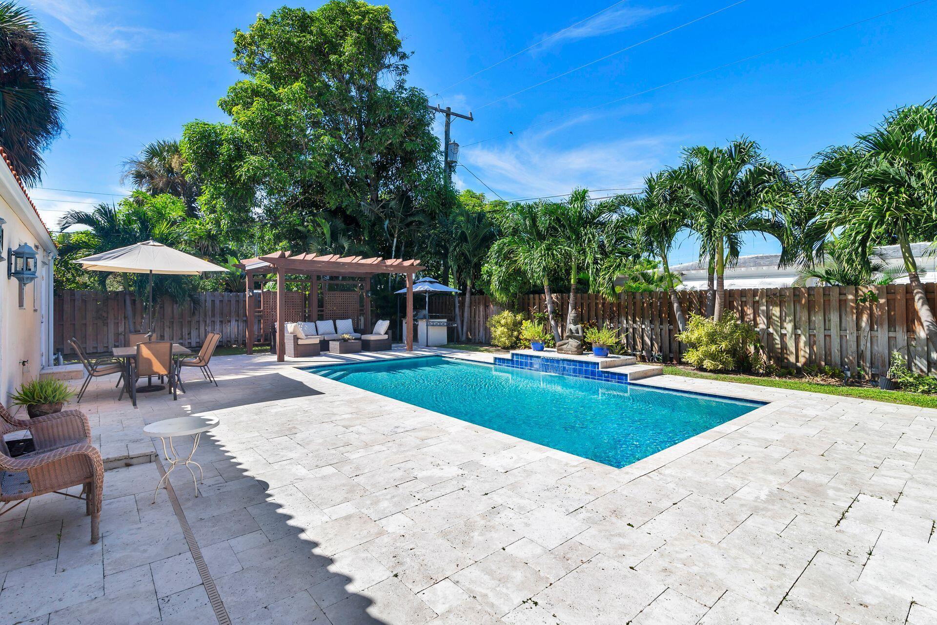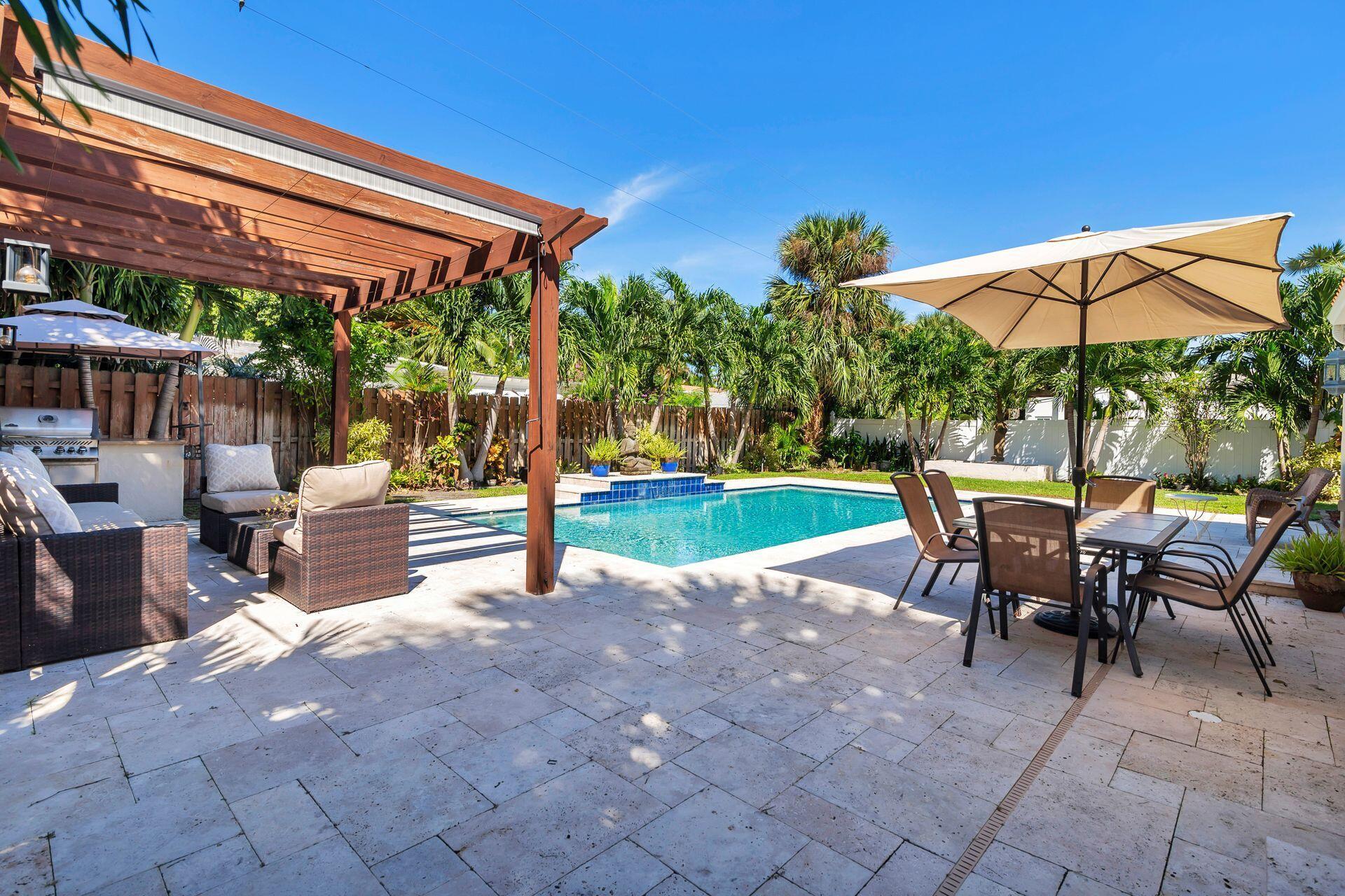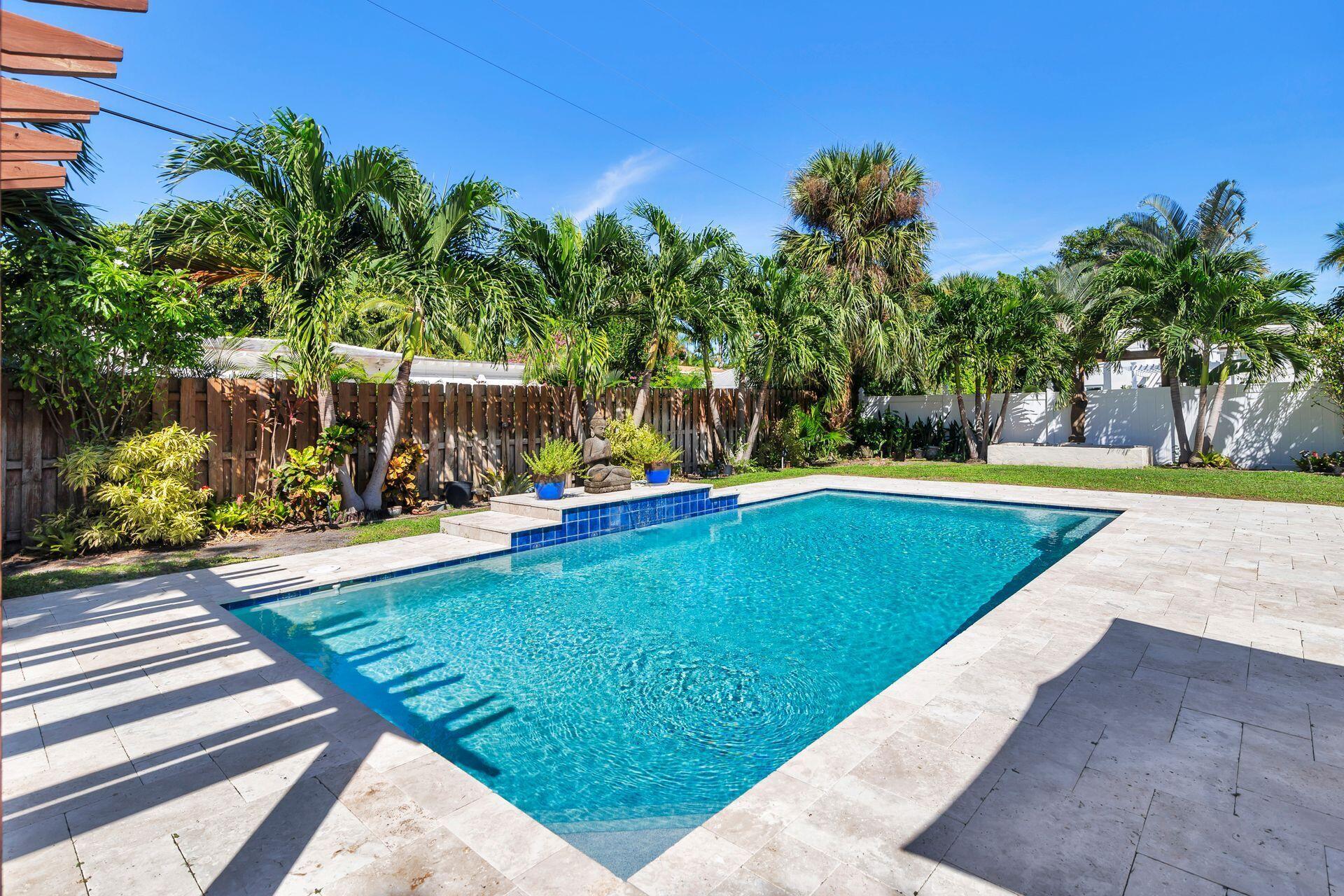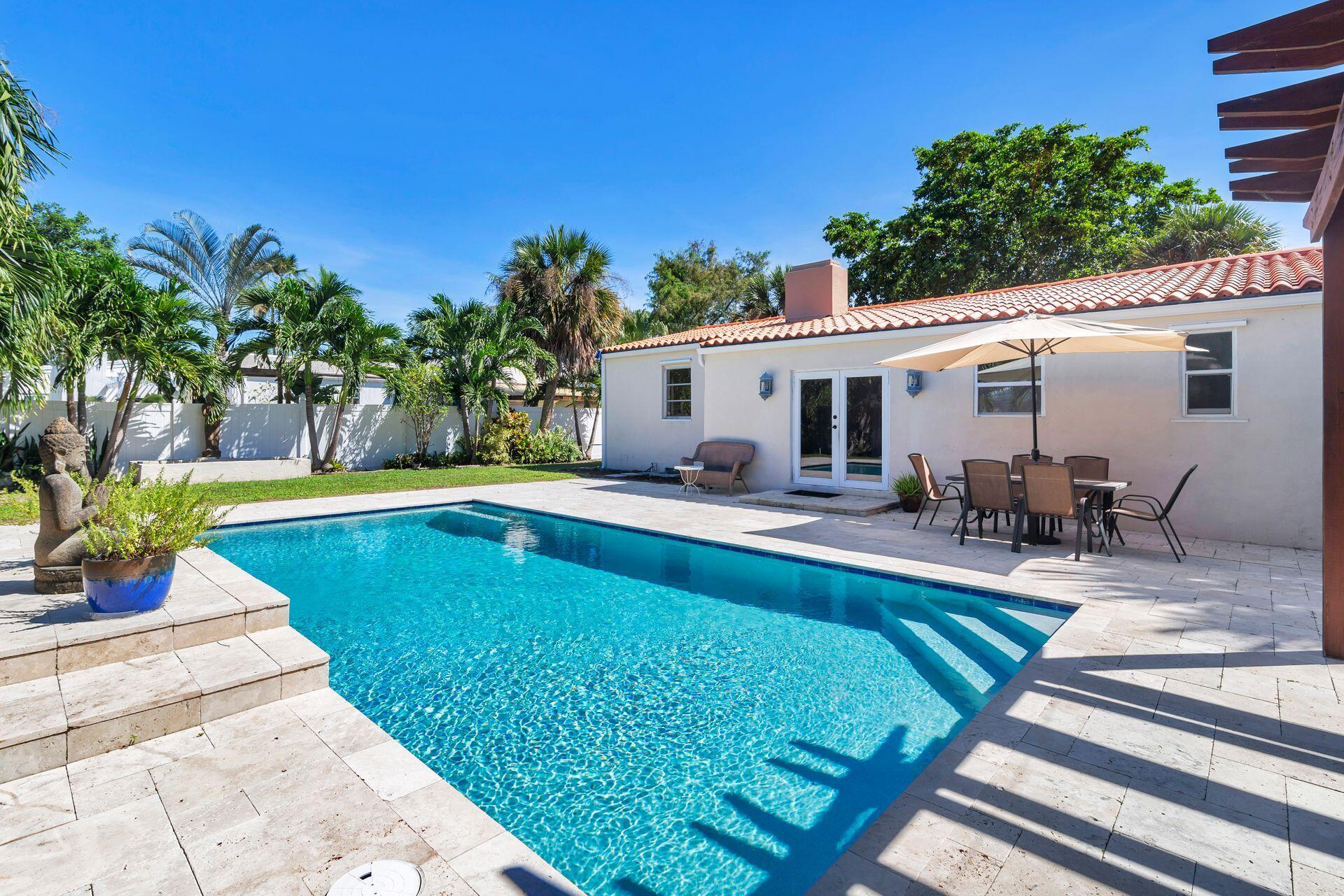 Rare find in desirable Northwood Shores! This 1947, cement block, home offers 2 bedrooms, 2 baths plus a den/nursery/hobby room. When entering the home, you will be greeted by a bright, open 28 X 15 living/dining/family area with vaulted cypress ceilings, original tongue and grove hardwood floors and brick fireplace. The bathrooms have been tastefully renovated and the spacious kitchen has been updated with wood cabinets, granite countertops, stainless steel appliances, 5-burner gas stove, tile flooring and impact french doors leading to the spacious fenced in backyard. The kitchen also has a rare, original corner brick fireplace. The current owner added an amazing 30 X 15 pool in 2018 with Travertine decking and a sturdy, attractive gazebo with an attached natural gas grill.