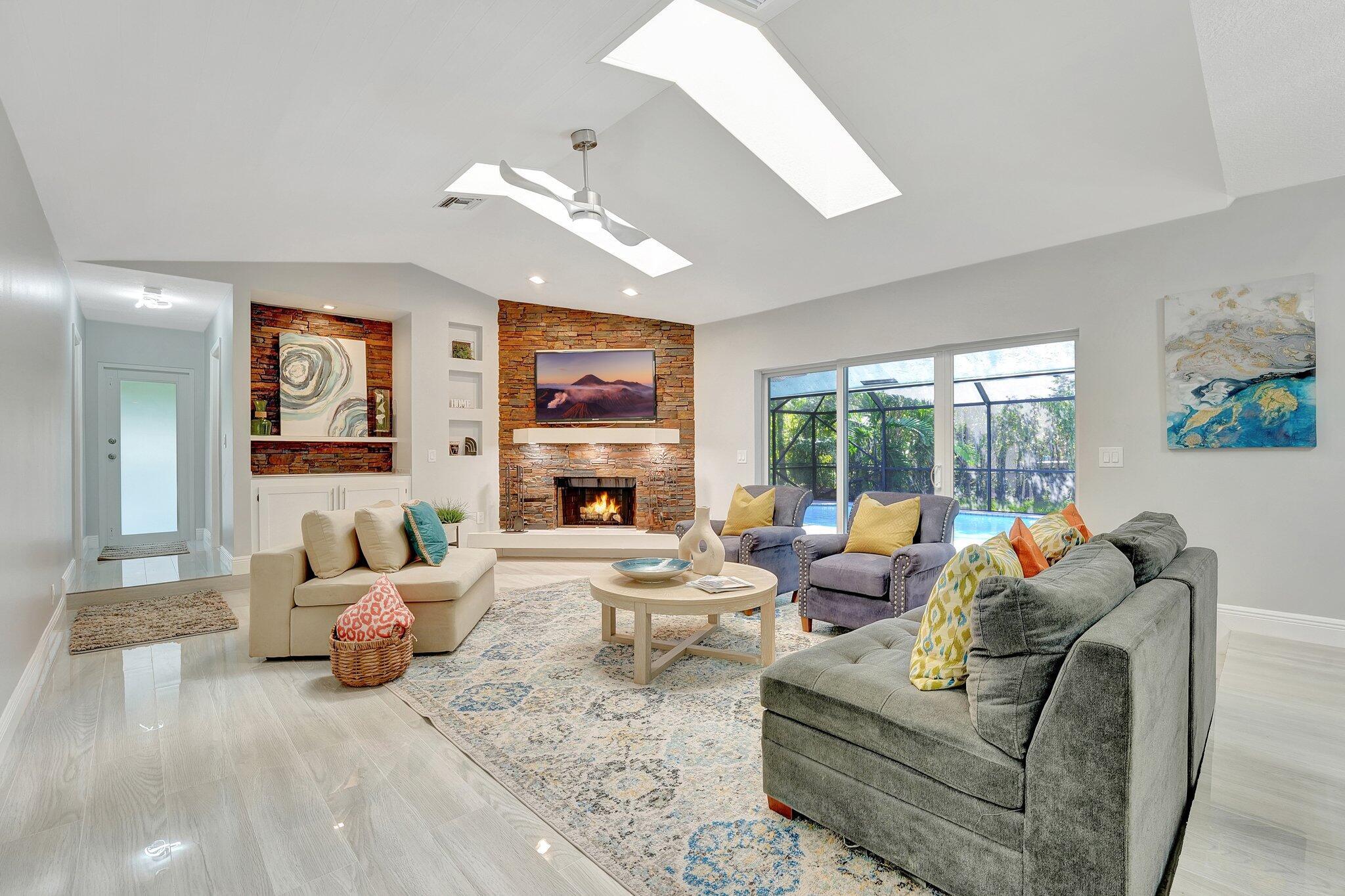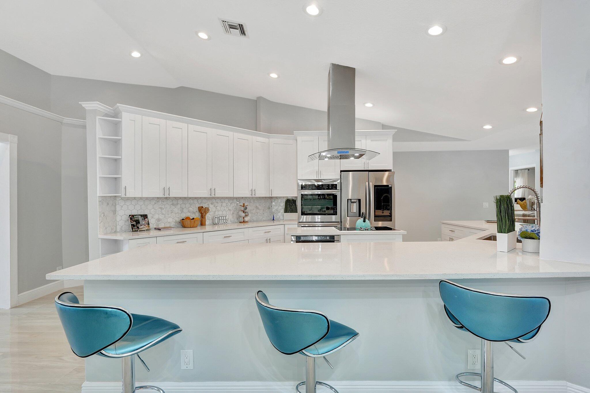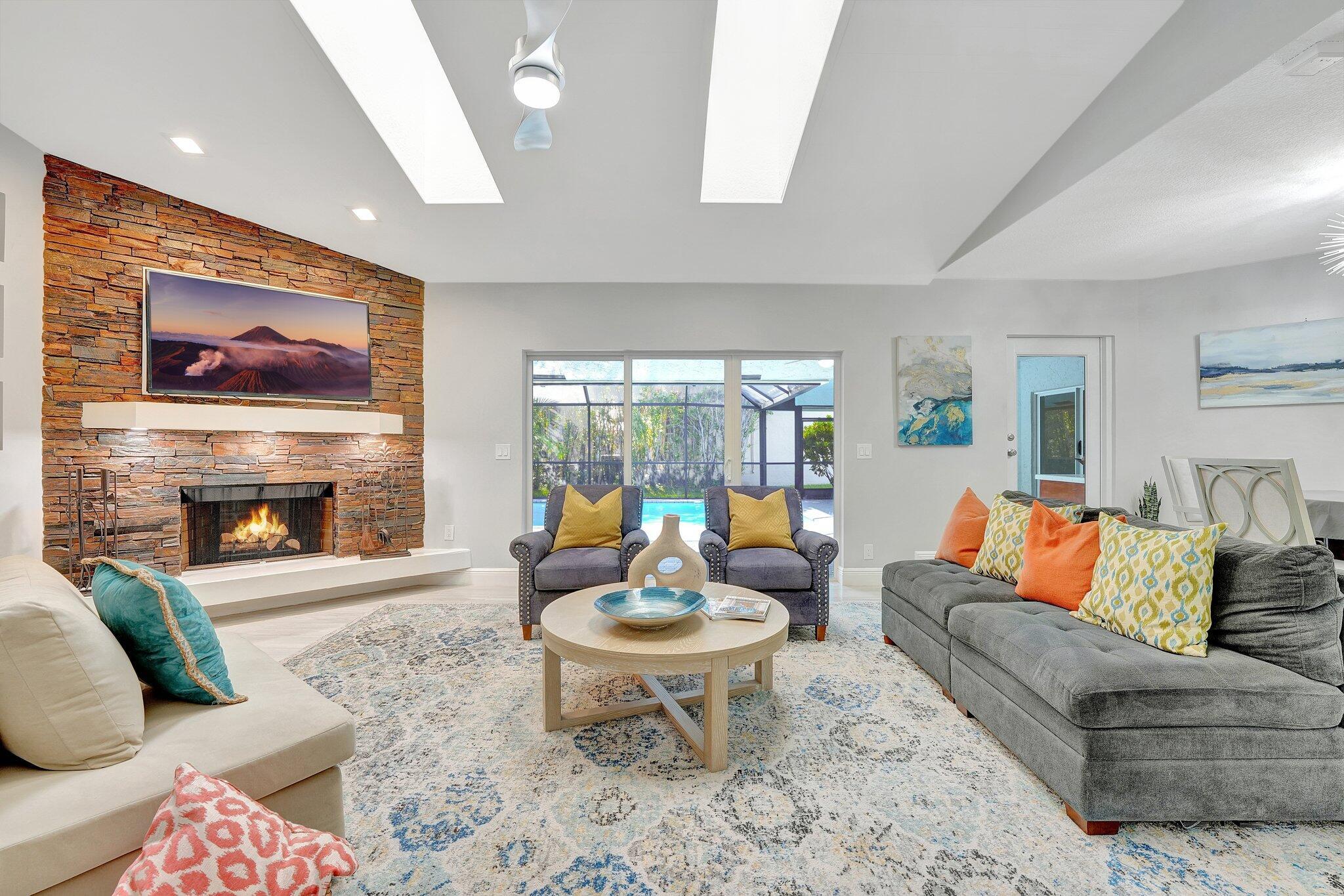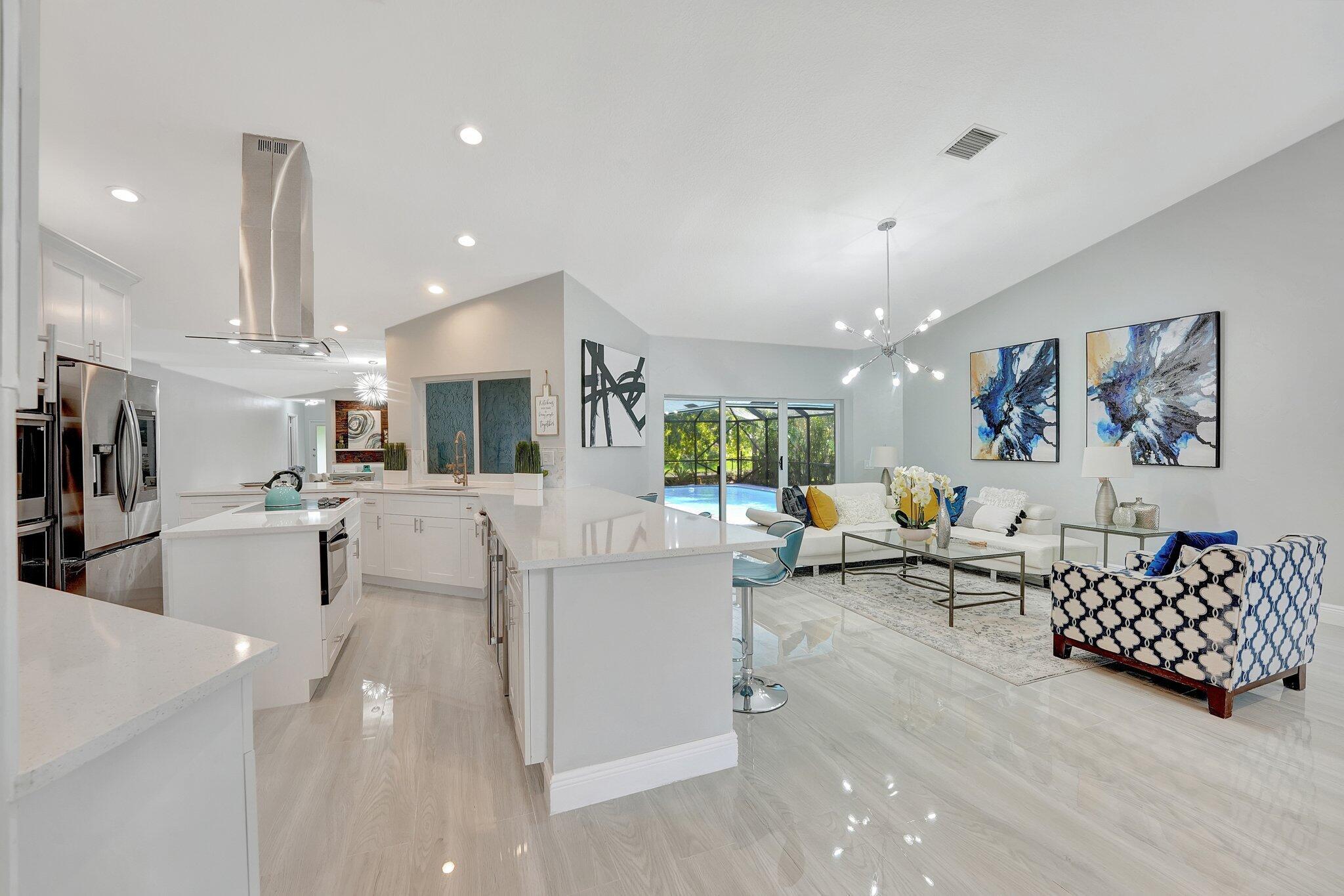 DREAM HOME: This spectacular 4 BR/3 full Bath waterfront home features a large screened-in, newly diamond brite pool and a tri-split floor plan in the sought-after 24-hour manned-gated community of Ridgeview. Included are a brand new 2024 tile roof, new 2024 AC units, and brand new impact windows and doors. Inside, enjoy all new flooring, modern bathrooms, and a new custom island kitchen with new appliances, including a Family Hub refrigerator, double-stacked ovens, and wine cooler. The high vaulted ceilings with skylights enhance the open layout. The expansive patio has an outdoor kitchenette, and the backyard boasts a custom pergola and seating. There's also a jacuzzi in the master bath, a convenient cabana bath, an extra multi-purpose room, updated landscaping, and an ADT system.