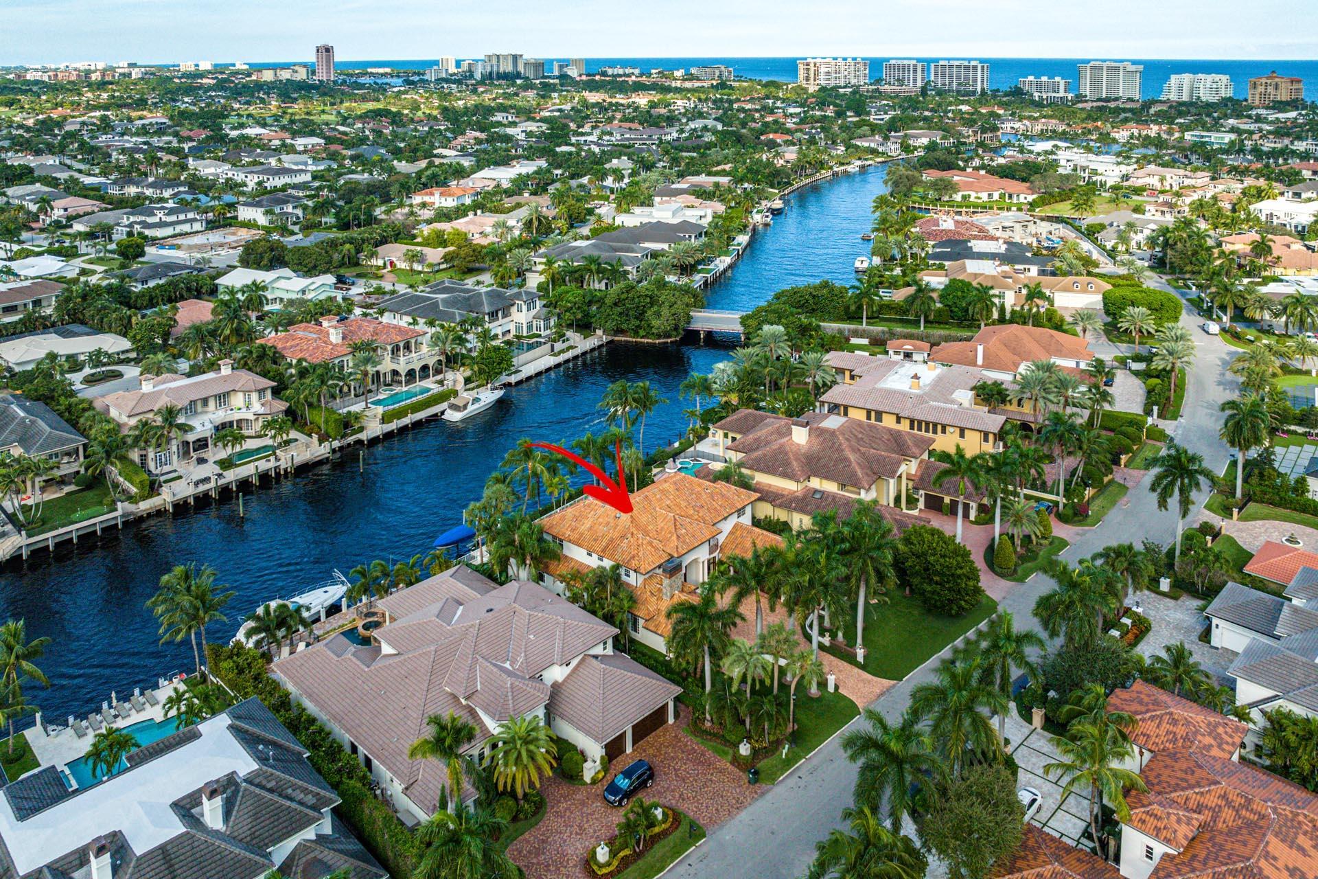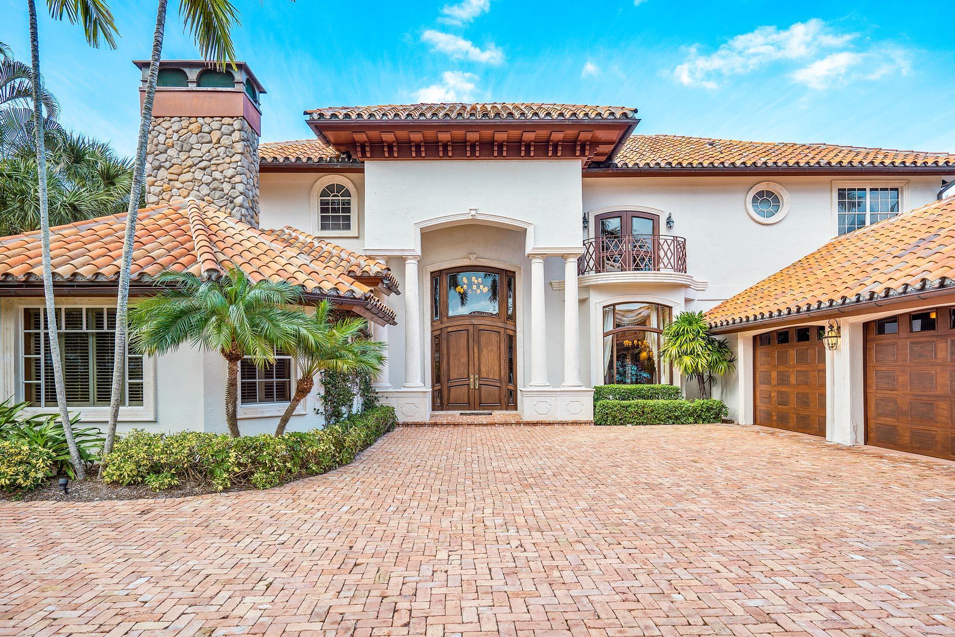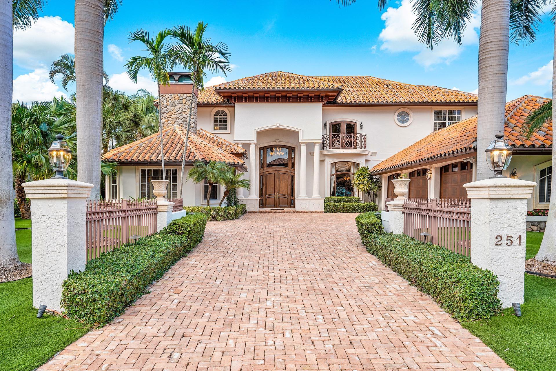 Introducing a waterfront masterpiece designed for those who value privacy and luxury living. This exceptional estate offers 89 feet on the widest canal in Royal Palm Yacht & Country Club and features a private dock with a boat lift, providing direct access to the Intracoastal. With sunny north exposure, the expansive outdoor living area boasts a heated free-form pool and spa surrounded by an elegant paver deck, creating an ideal space for relaxation or entertaining.The large covered patio is perfect for al fresco dining and features a striking spiral staircase leading to the VIP suites and balcony, offering serene water views. Inside, the gourmet eat-in kitchen with a spacious island and walk-in pantry meets the culinary needs of any chef, while the formal dining room, highlighted