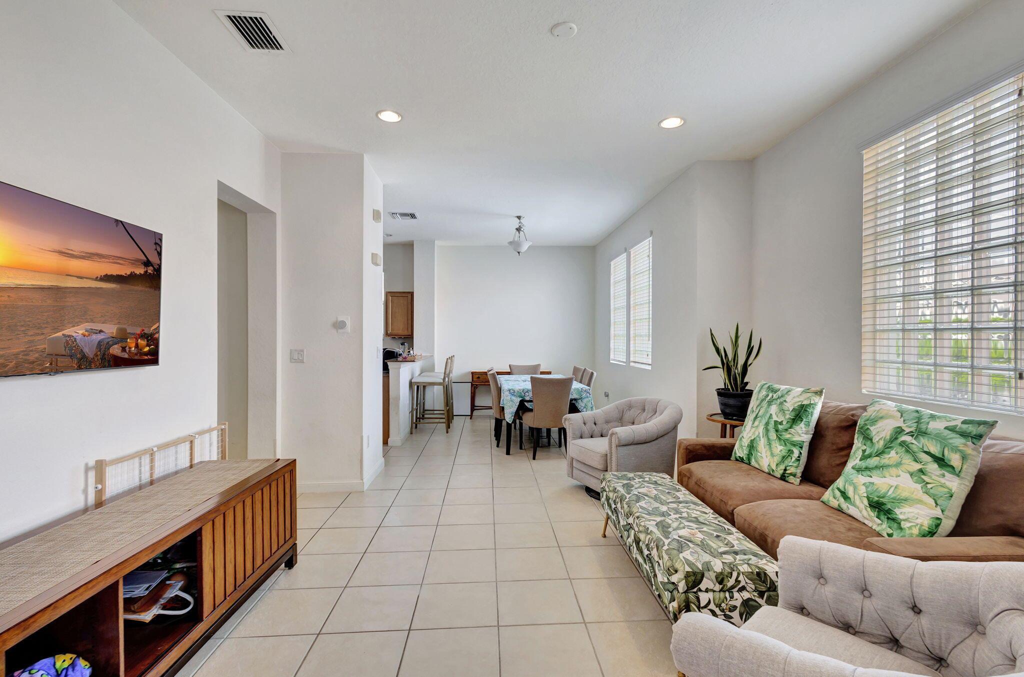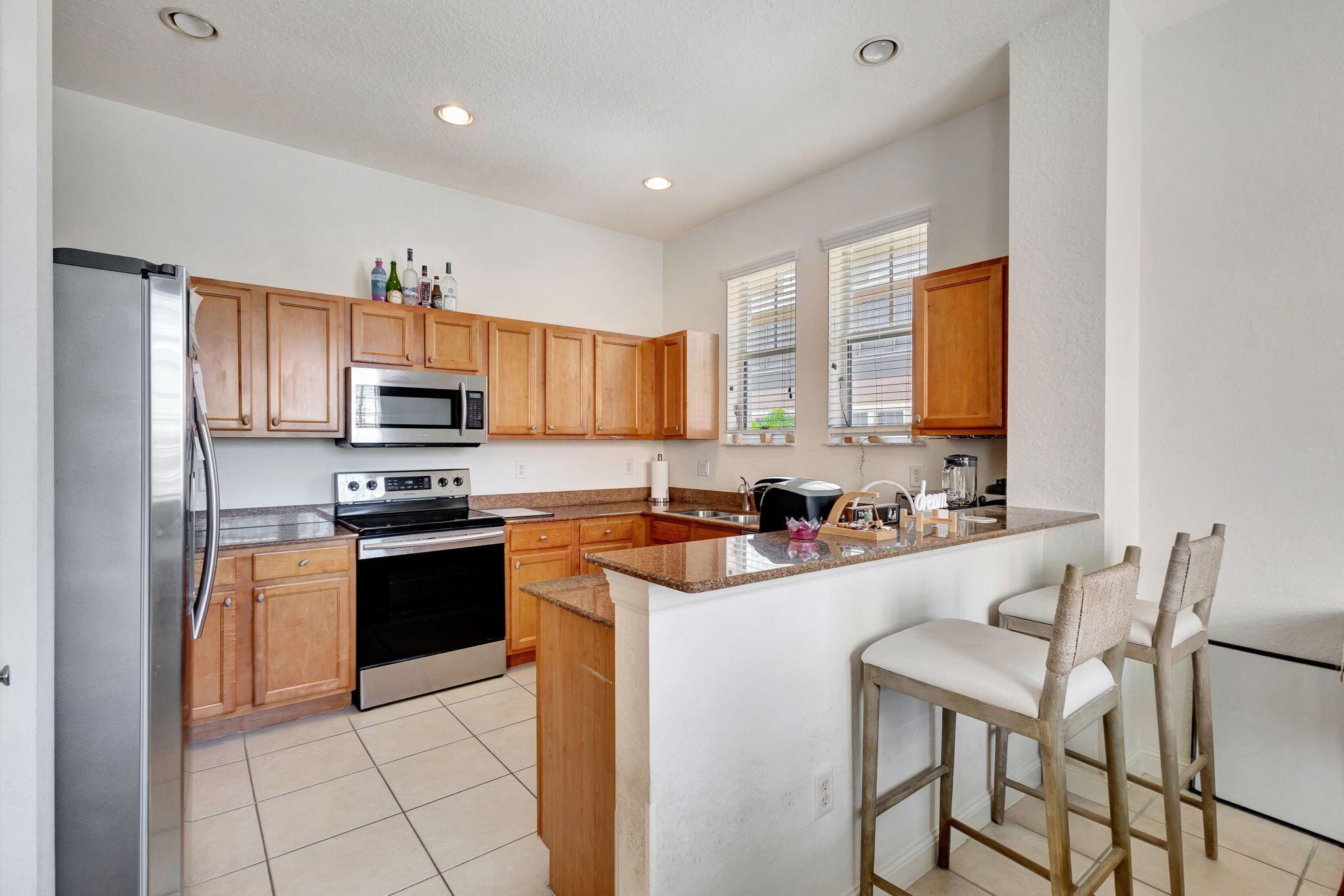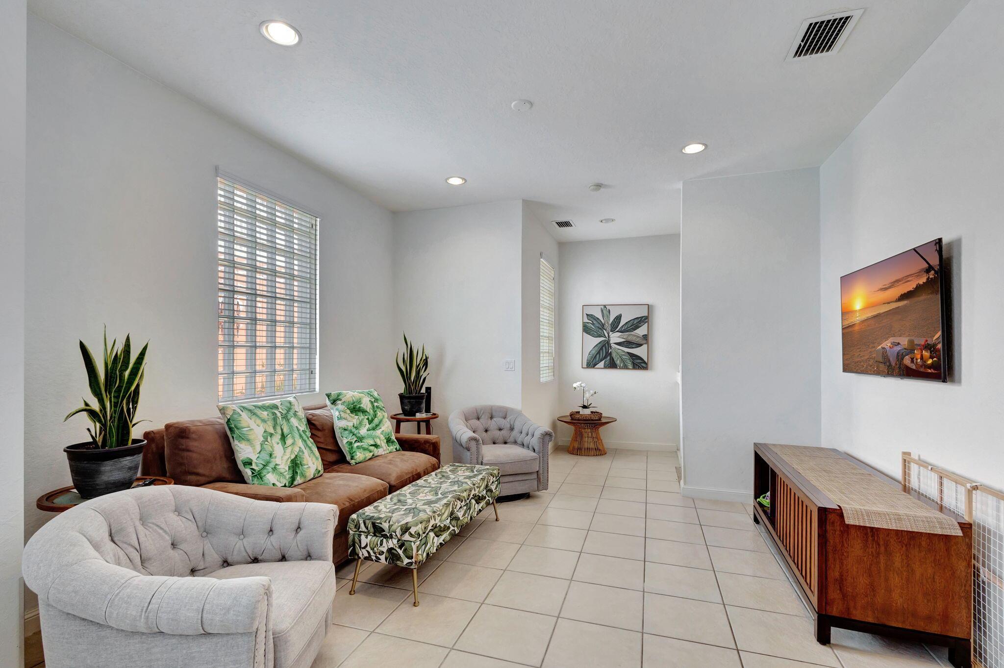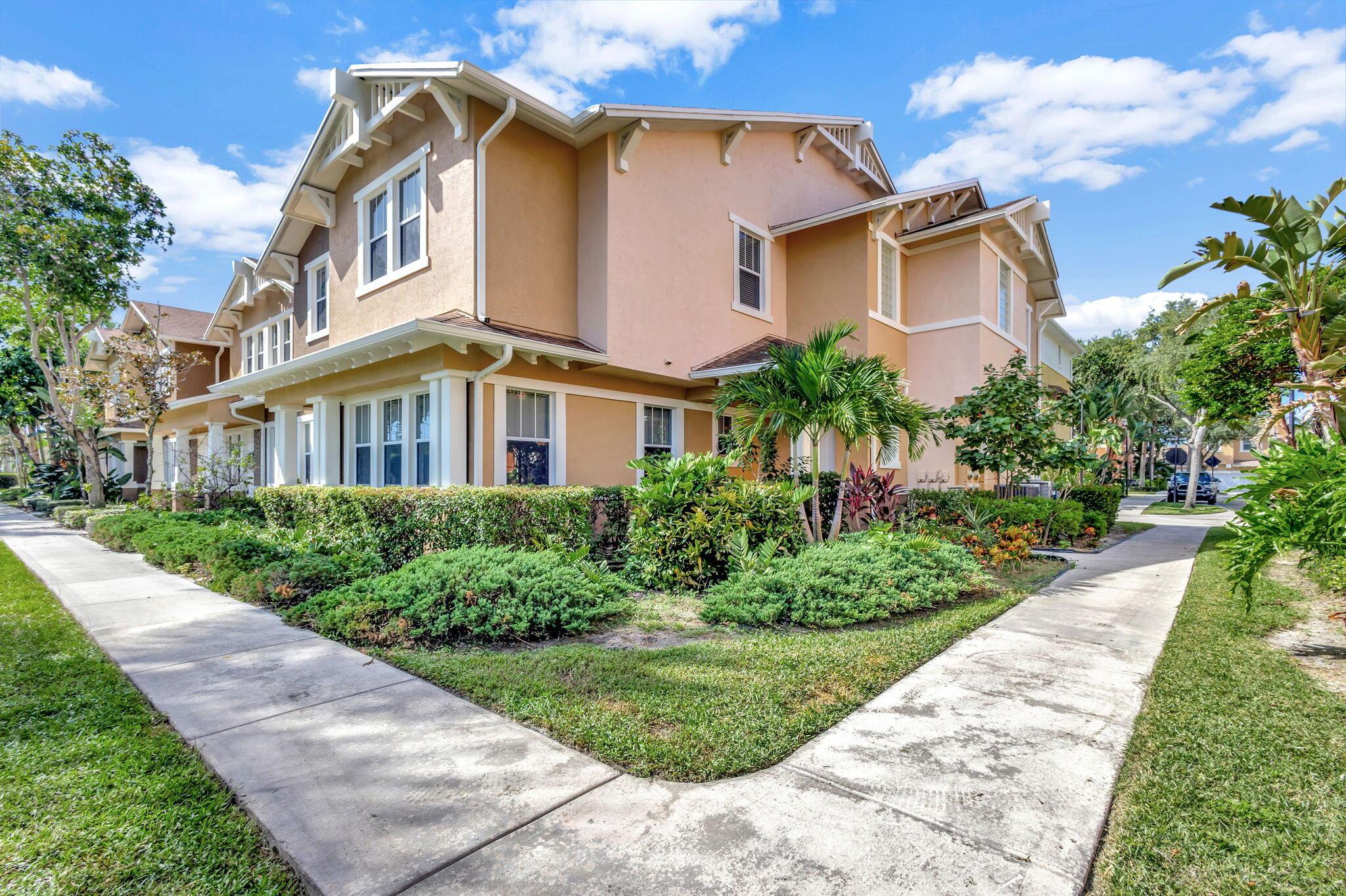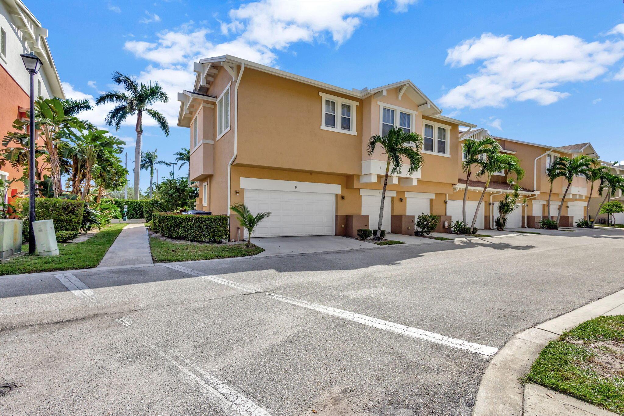 2 bedroom corner unit near the heart of it all, with attached oversize 2 car garage! New AC unit installed in 2022. This townhome with soaring ceilings is awash in plenty of natural light throughout the day. Kitchen features granite counters, pull-down faucet & stainless appliances. Primary bath with walk-in closet and dual vanity sinks. Full size washer/dryer in designated laundry room. 5 minutes from downtown West Palm, I-95, and PBI airport. Walk across the street to the new Palm Beach Outlet Shops, Whole Foods, Target, and multiple restaurants. Community amenities include 24hr manned gate w/ nightly roving patrol, HUGE lakeside pool, recently renovated gym and lakeside jogging track. Water, trash removal, master insurance, cable & internet service included w/ HOA