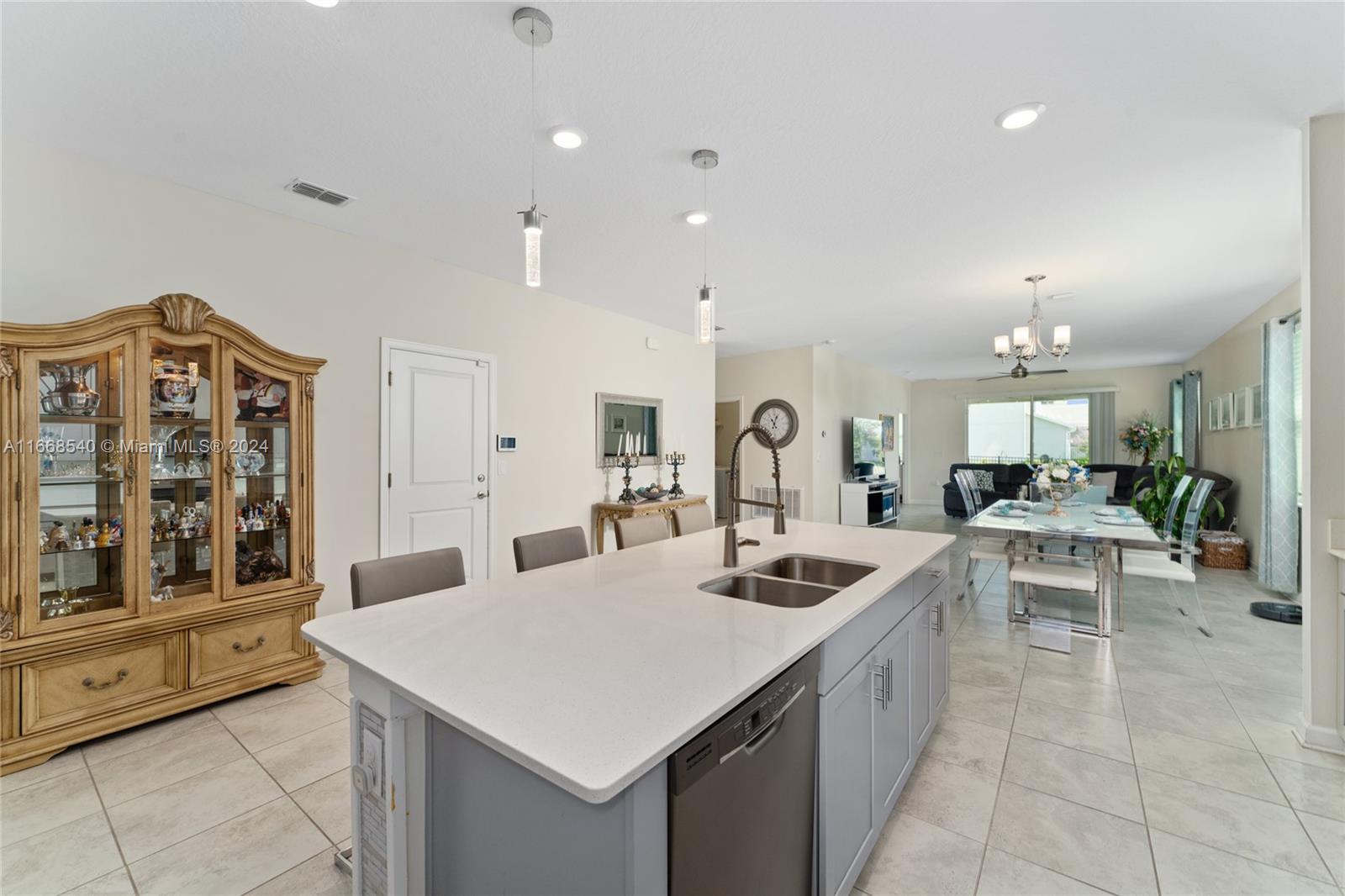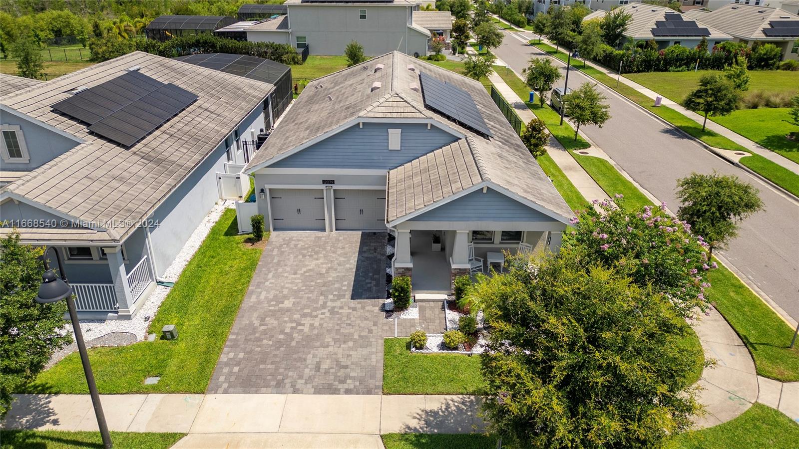 Expect to be impressed as you arrive at this stunning home, located in the heart of Lake Nona. This enchanting corner lot home features three bedrooms, two bathrooms, & a 2-car garage. The house boasts an open floor plan with a spacious kitchen that seamlessly connects to both the dining and family room areas. An additional flex space separated by beautiful French doors can be used as an office or converted to a fourth bedroom. The primary bedroom features a luxurious bathroom complete with a separate tub and shower as well as a private toilet and walk-in closet, The house is equipped with leases solar panels, which will be transferable to the next owner, The property includes a water filter system that has already been fully paid off, ensuring clean and purified water for the occupants.